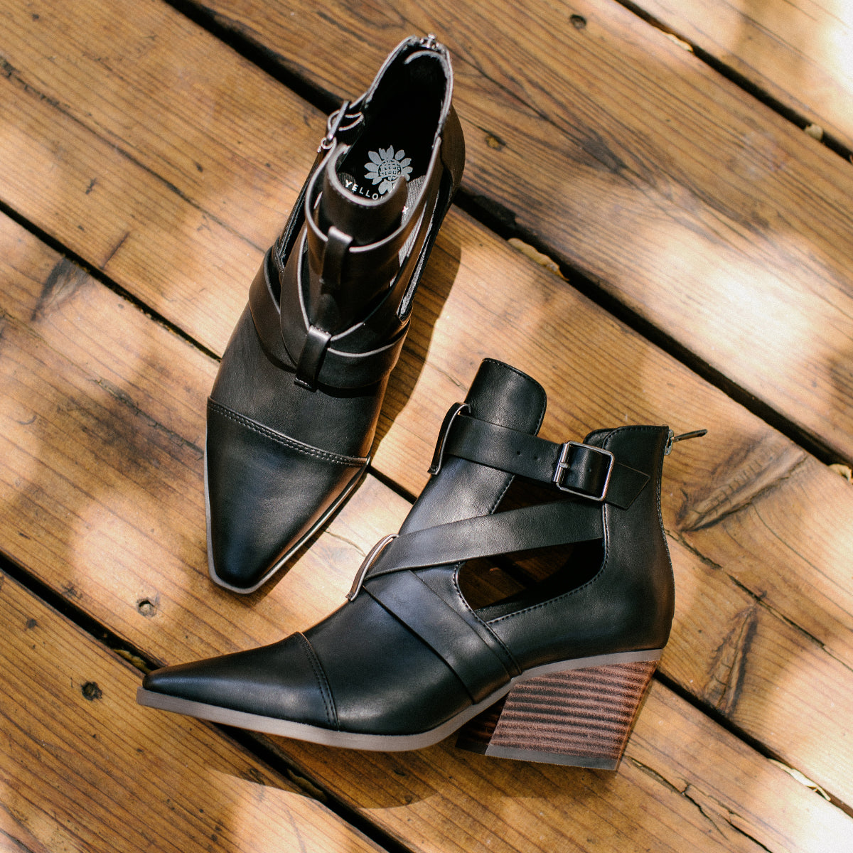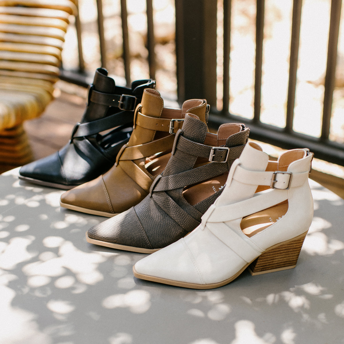 Update your shoe closet in these strappy booties. This cut-out style also features our contoured insole that cups your foot with a mild arch support.