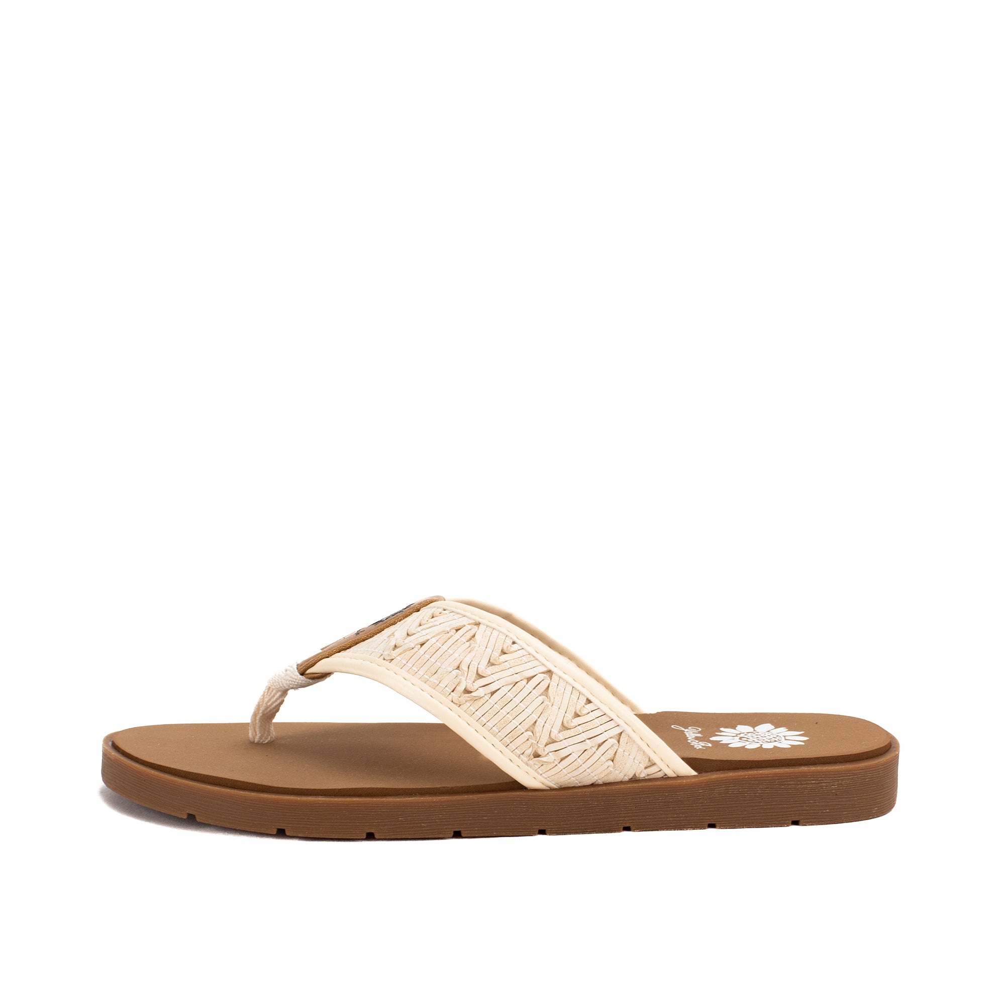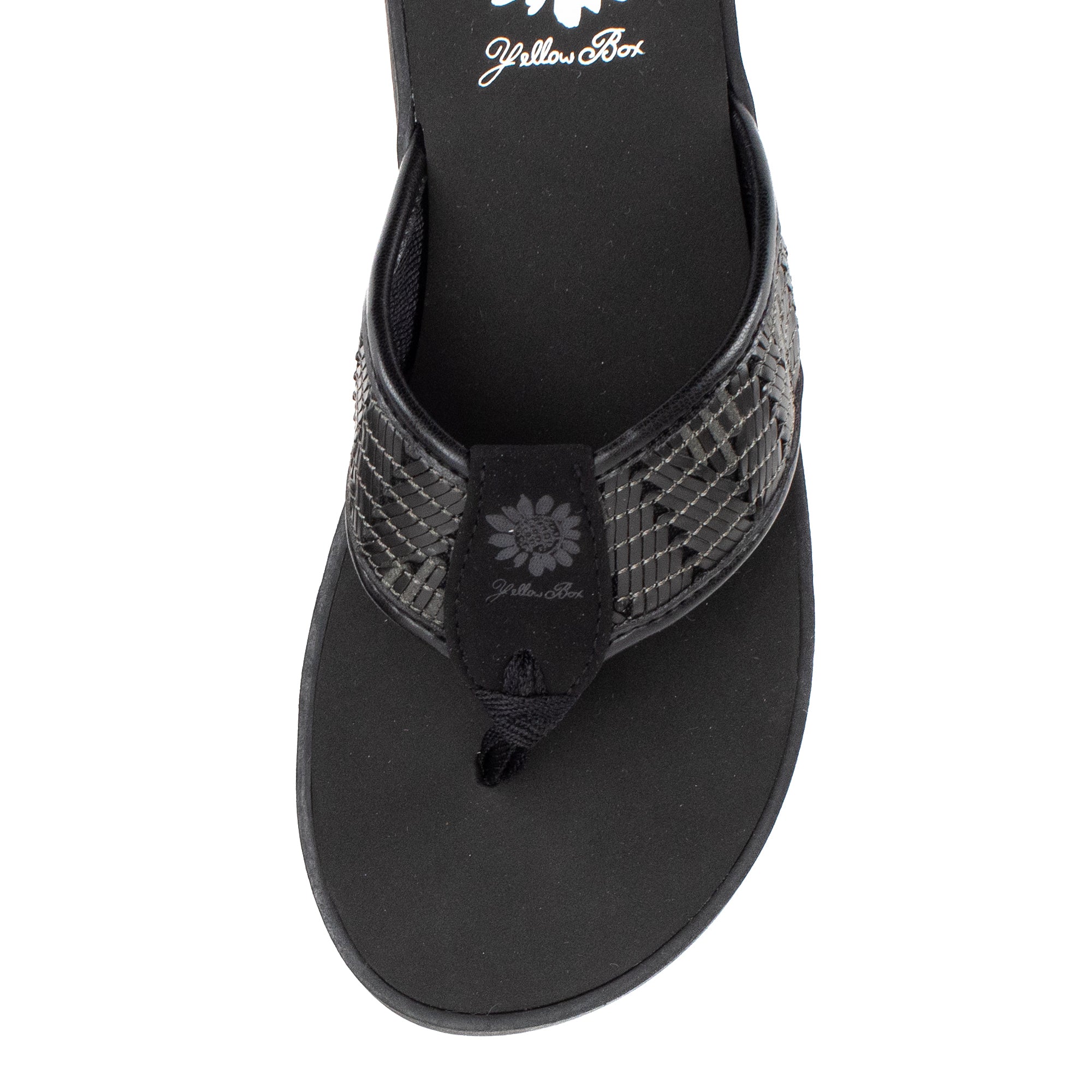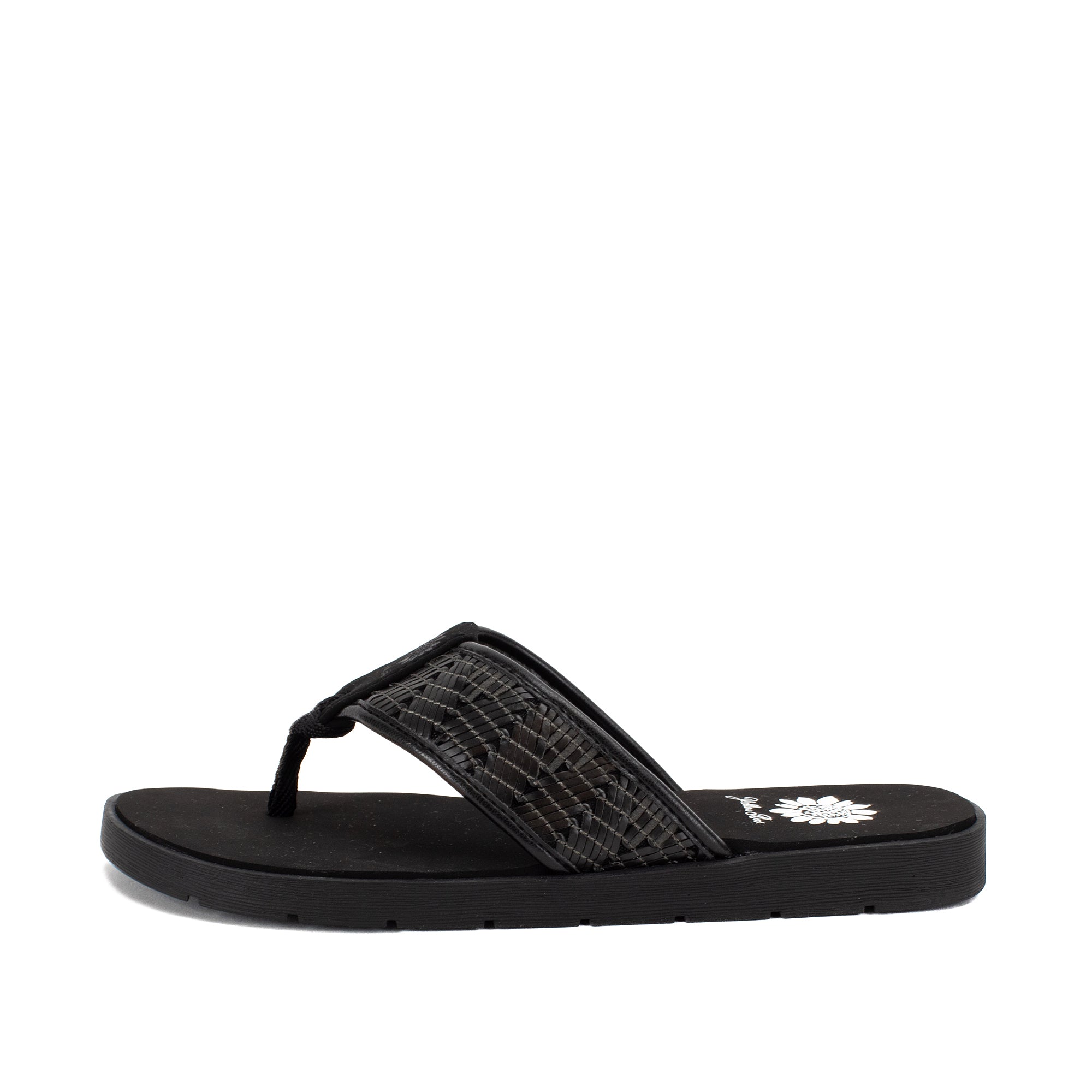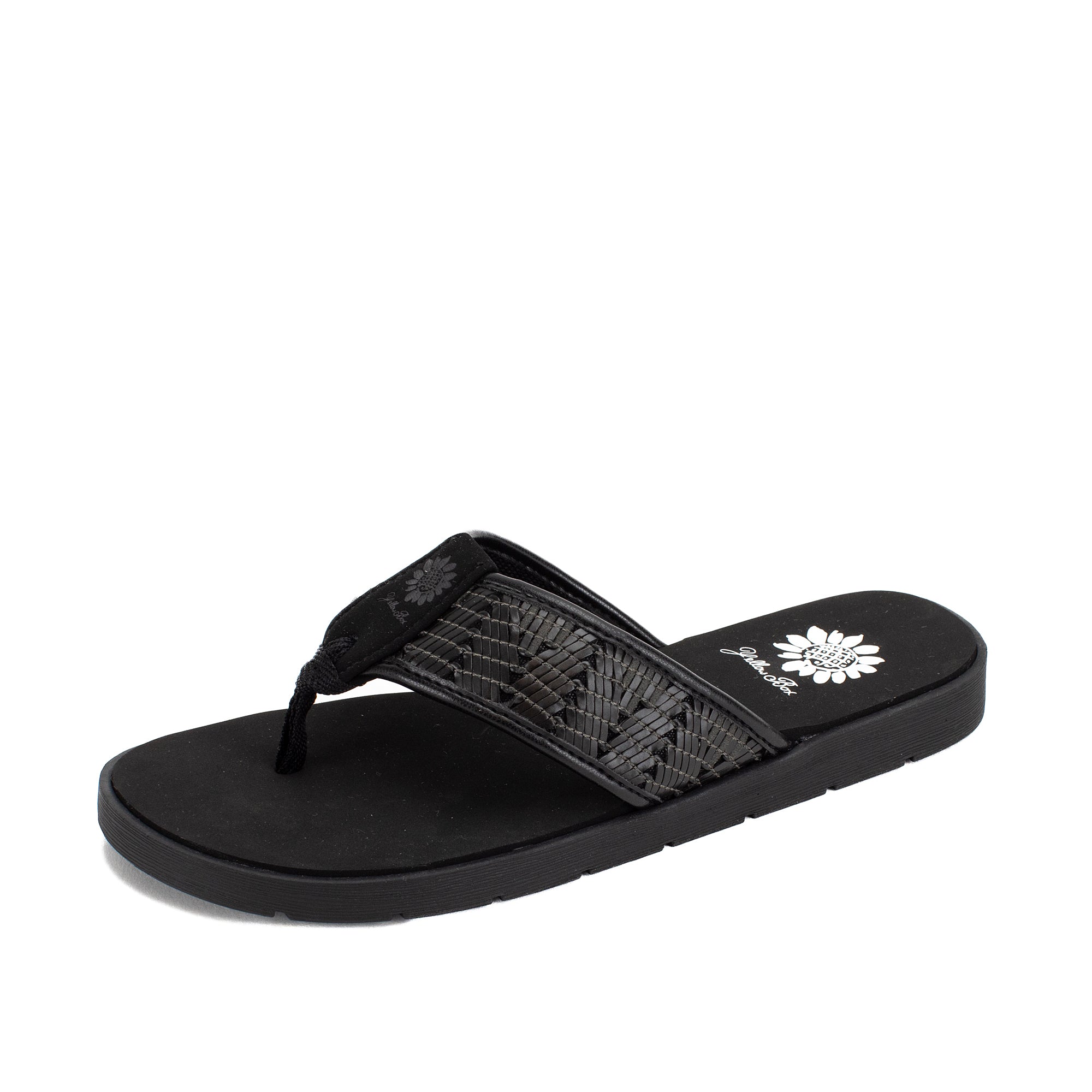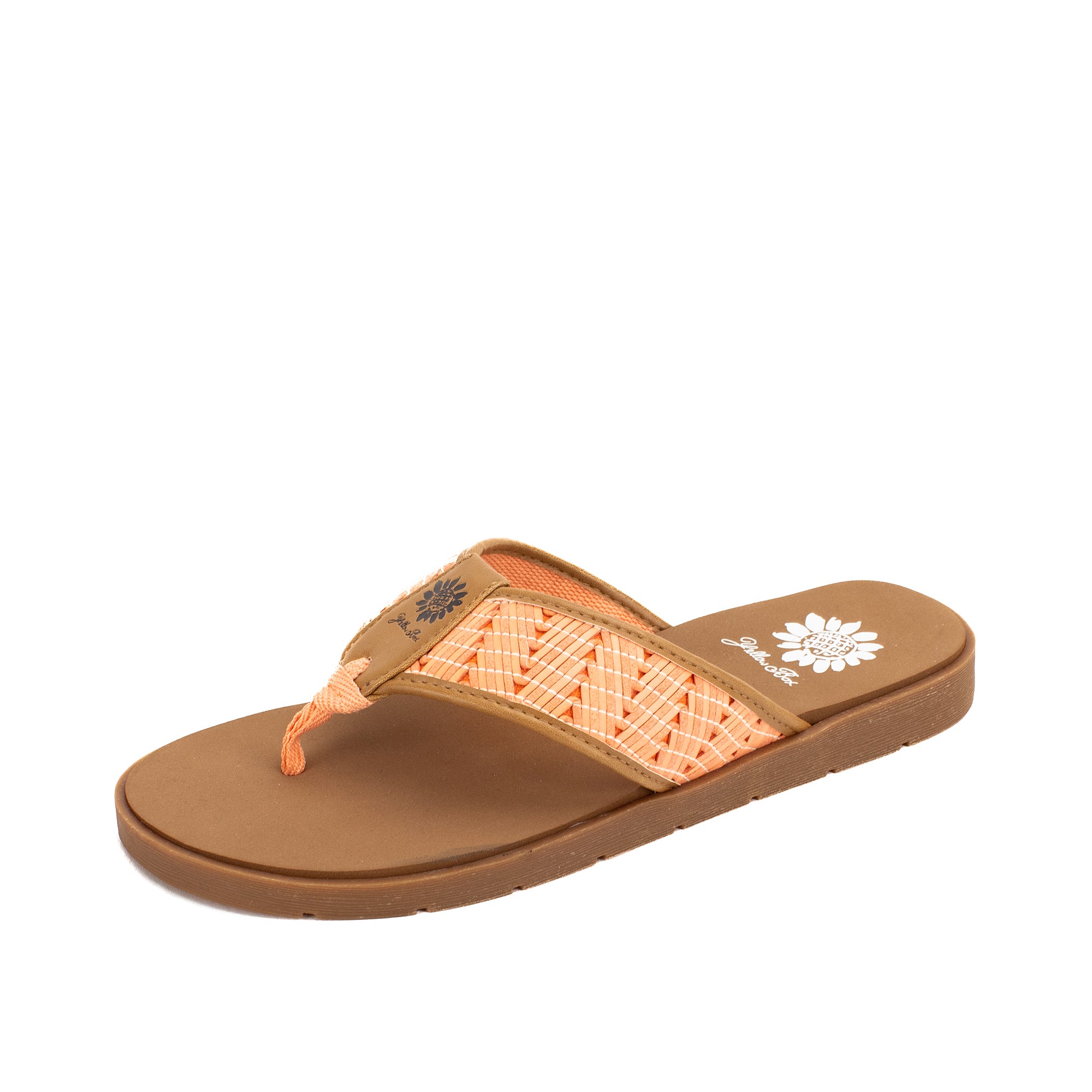 Colorful woven leatherette designs are perfect for boardwalk strolls. This casual flat features our Signature Yellow Box EVA foam footbed inset a slip-resistant lugged outsole.