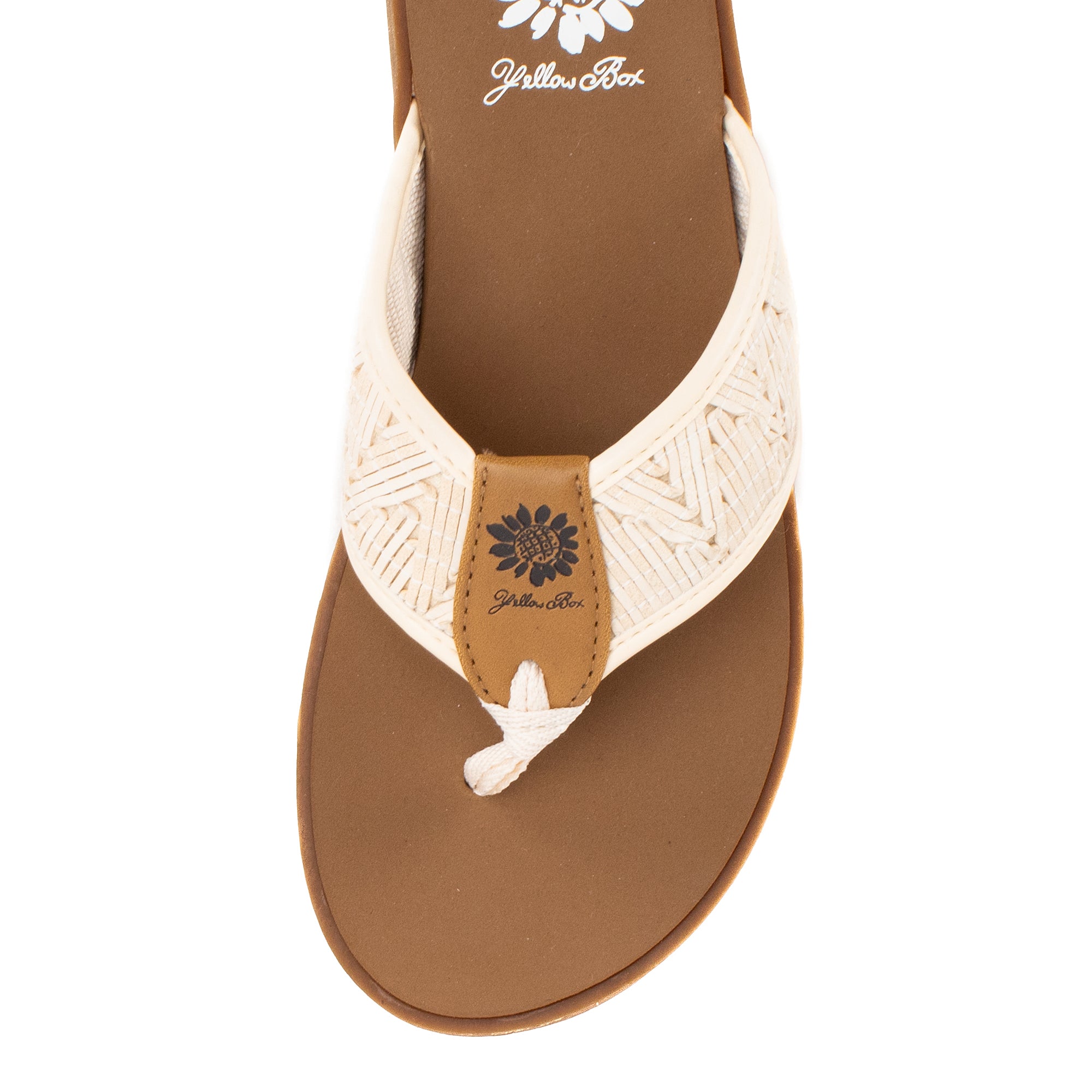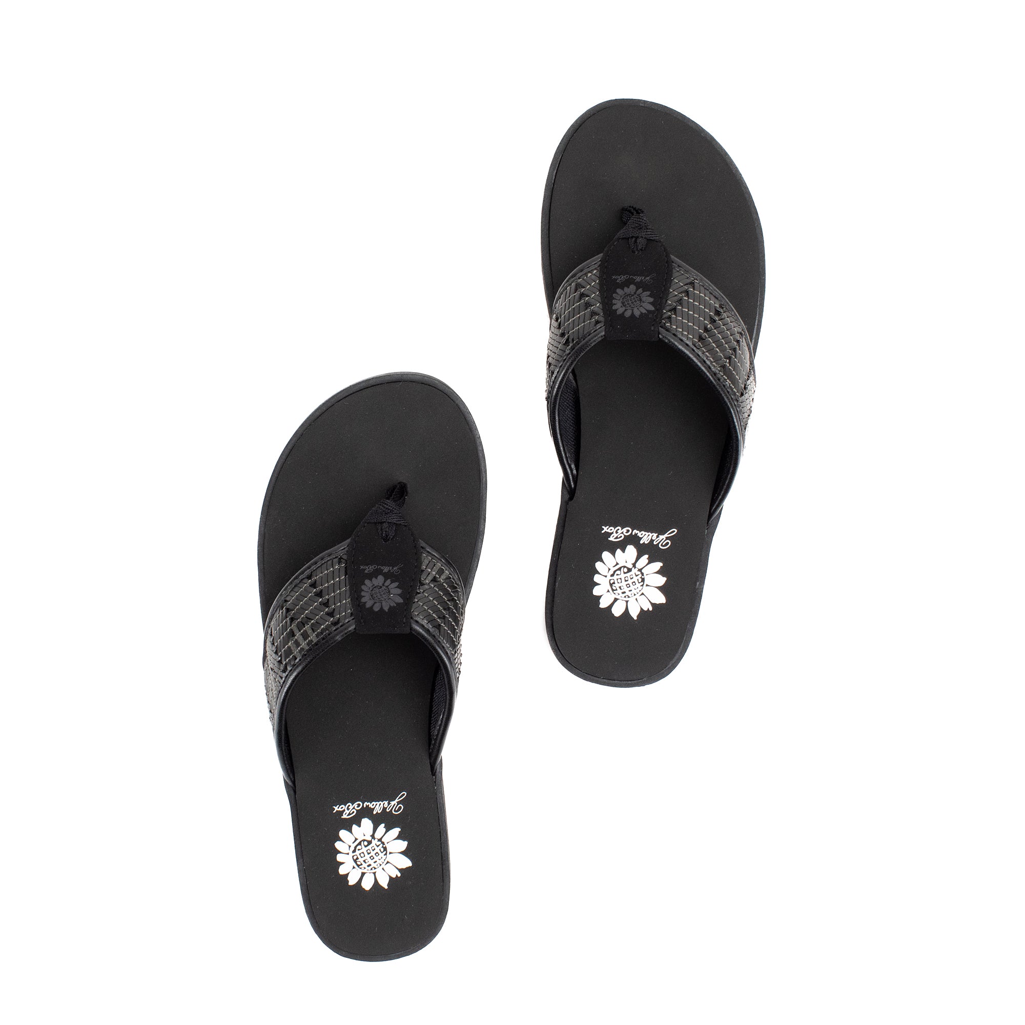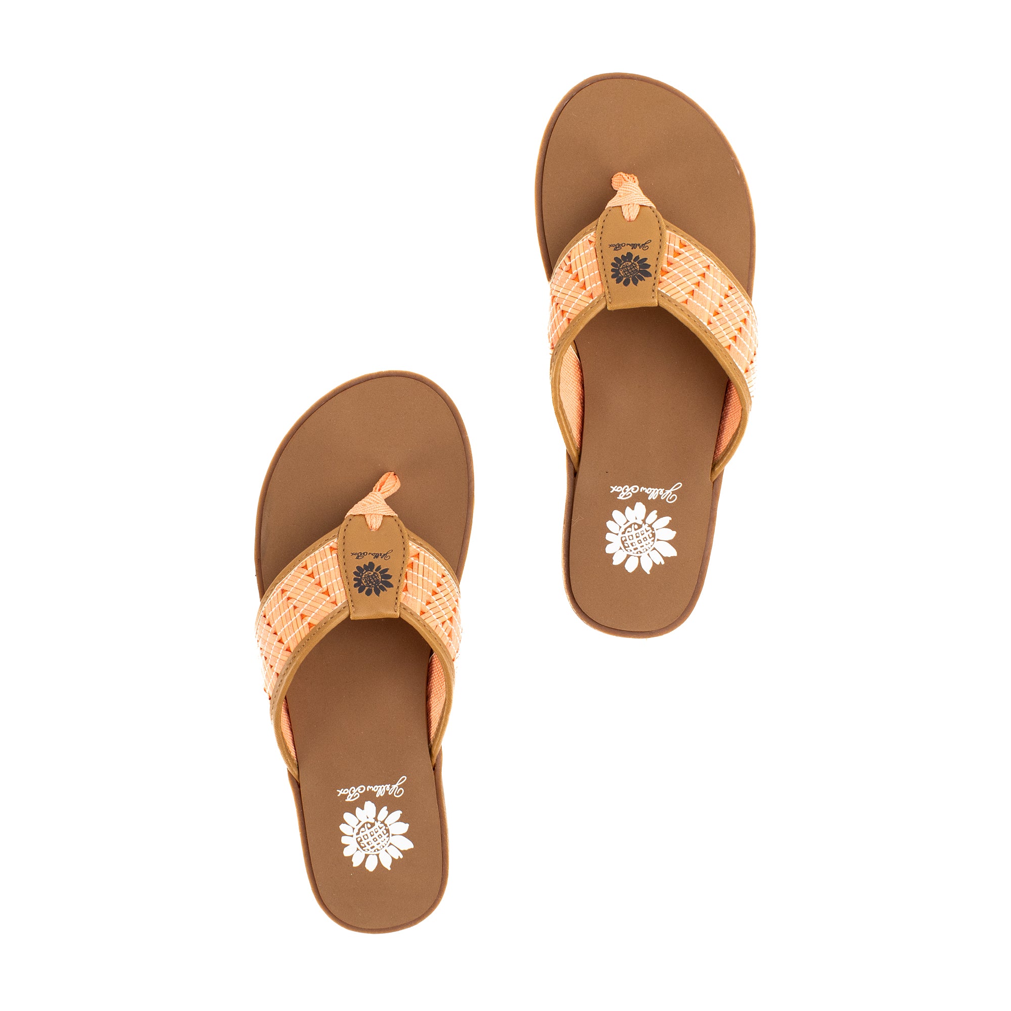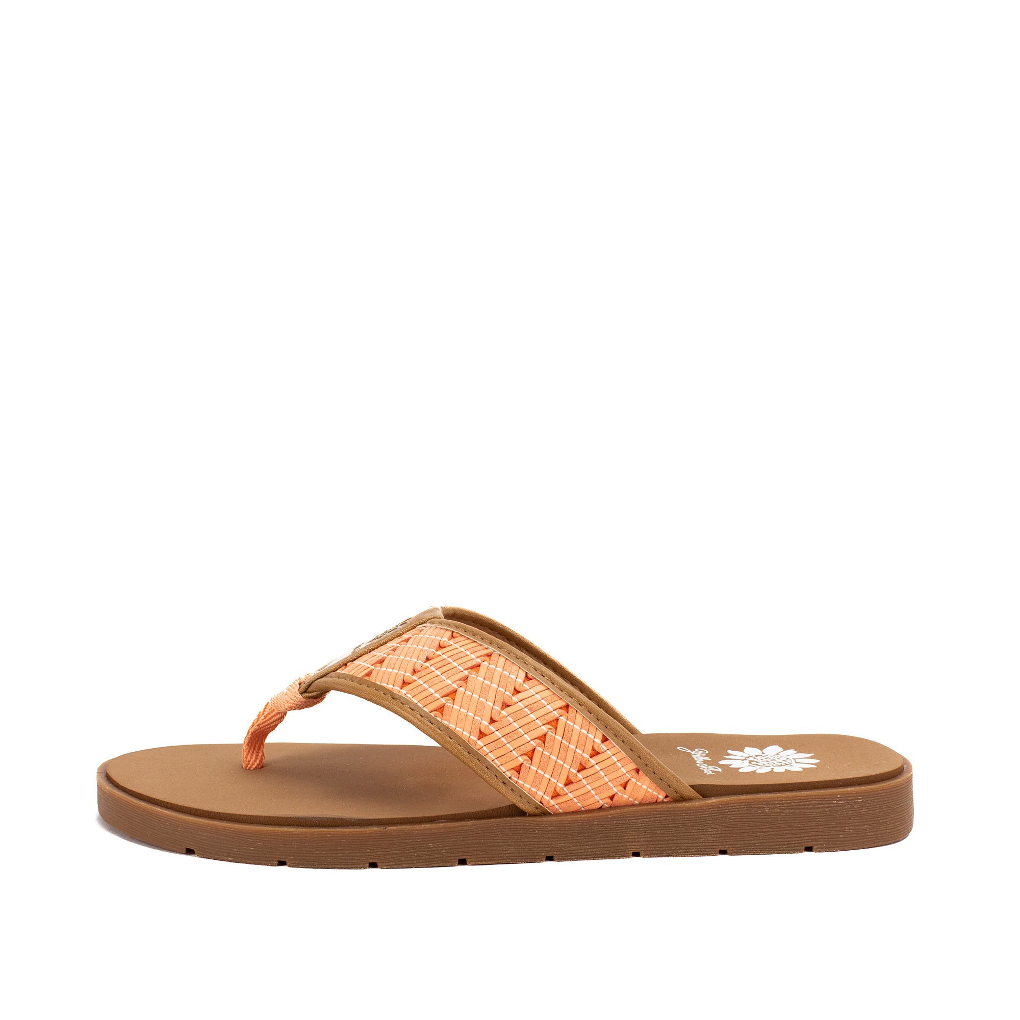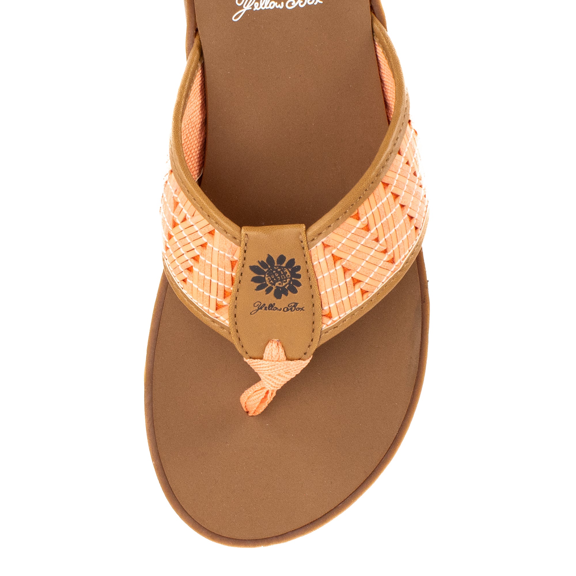 Colorful woven leatherette designs are perfect for boardwalk strolls. This casual flat features our Signature Yellow Box EVA foam footbed inset a slip-resistant lugged outsole.