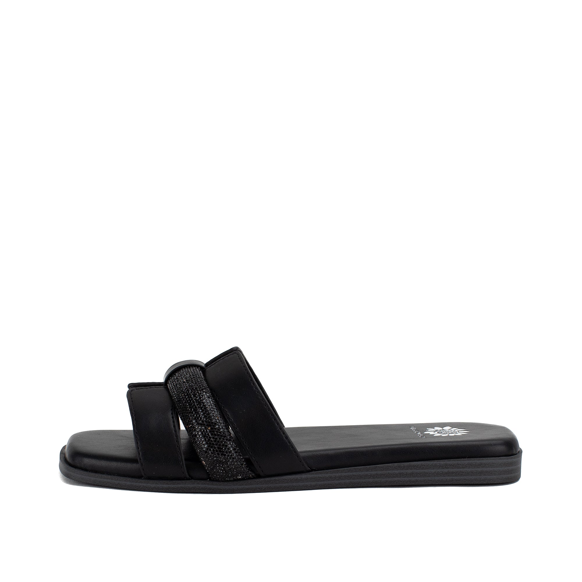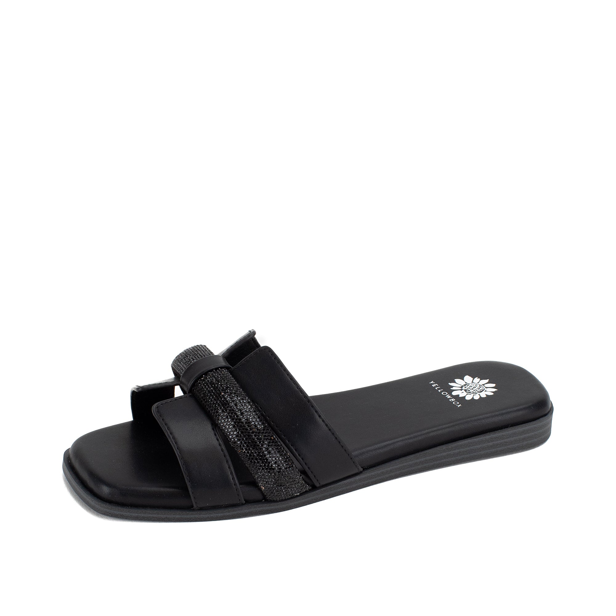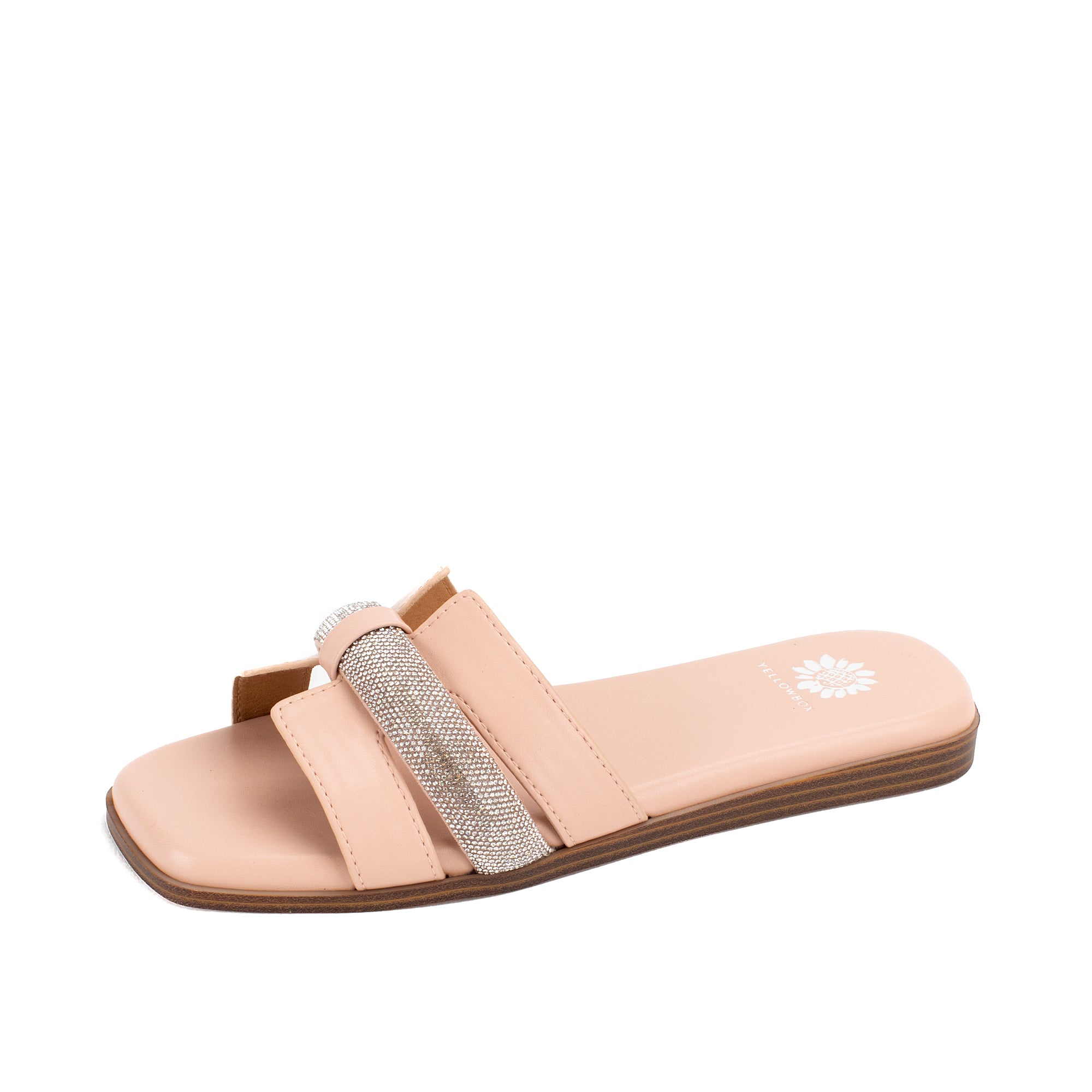 Meet KERRIA, a sleek and minimal slide sandal that makes a chic addition to any wardrobe. Featuring an H-band upper design with a puffed strap covered in bold bling, this sandal bottom has a square toe and Signature Yellow Box High Rebound EVA padding on a low wedge.