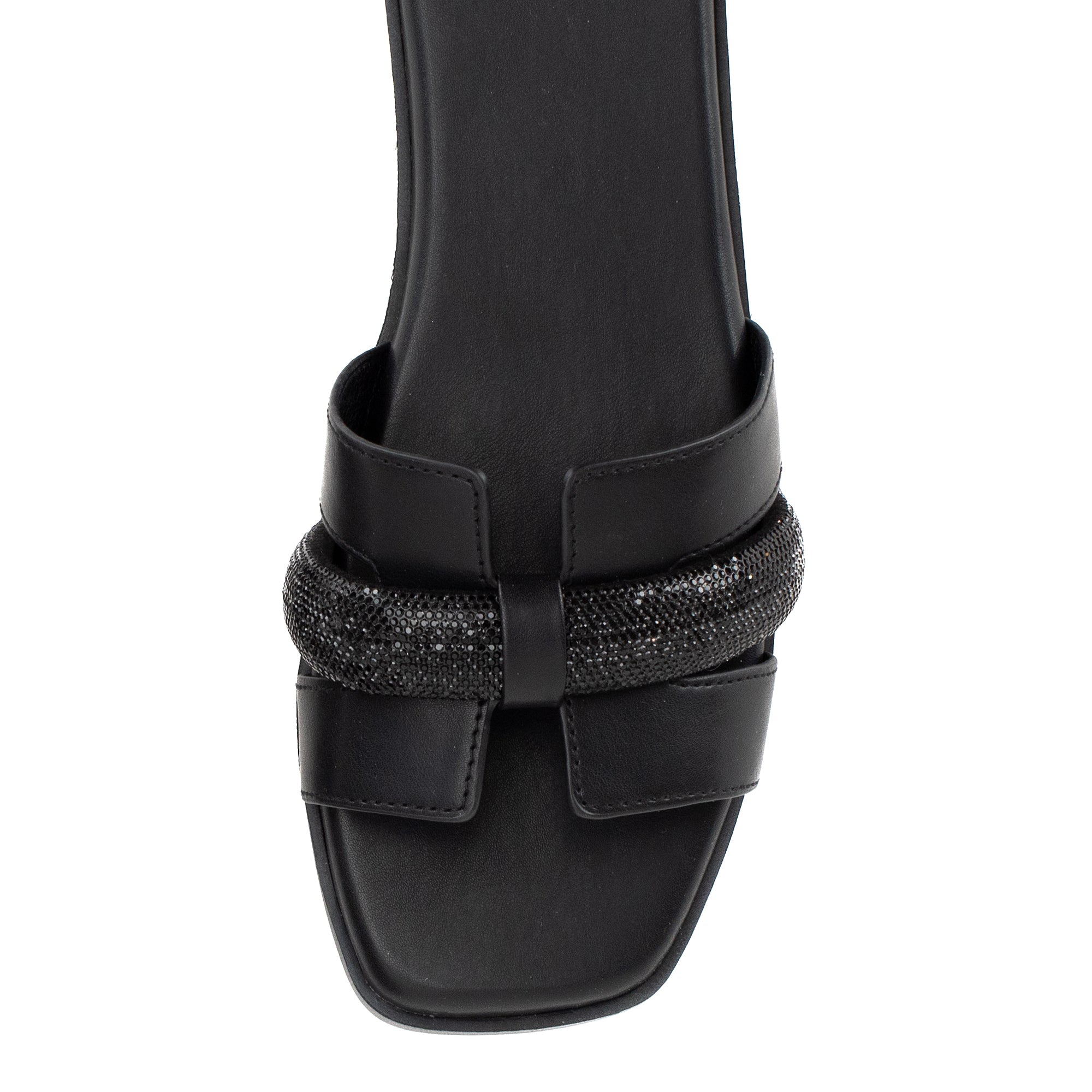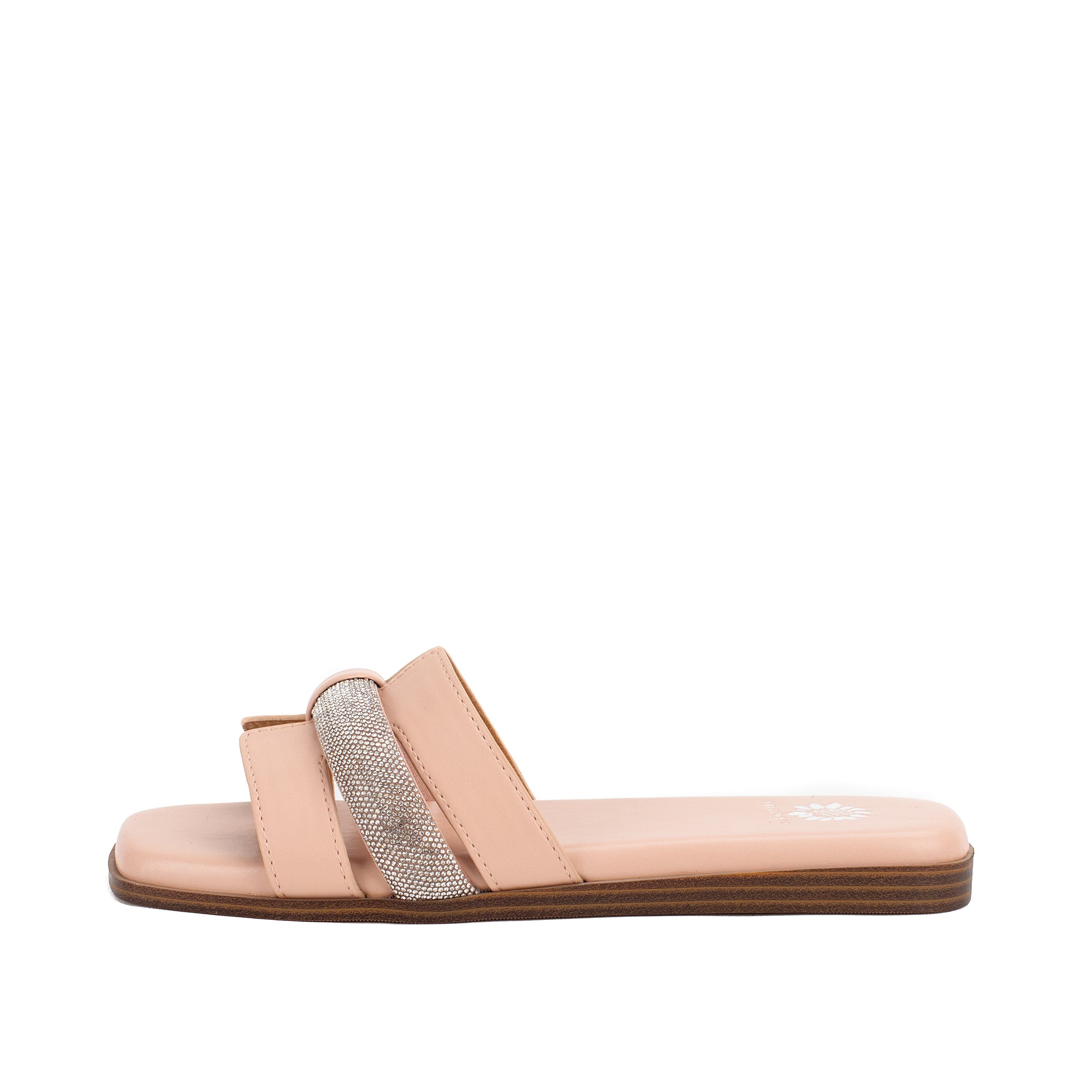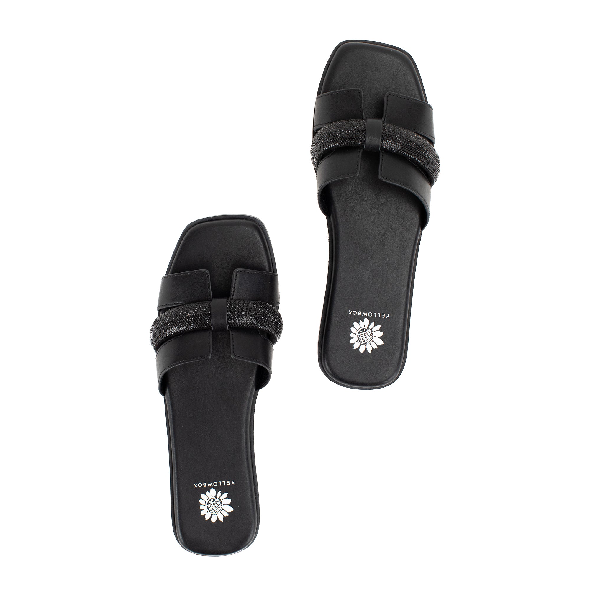 Meet KERRIA, a sleek and minimal slide sandal that makes a chic addition to any wardrobe. Featuring an H-band upper design with a puffed strap covered in bold bling, this sandal bottom has a square toe and Signature Yellow Box High Rebound EVA padding on a low wedge.