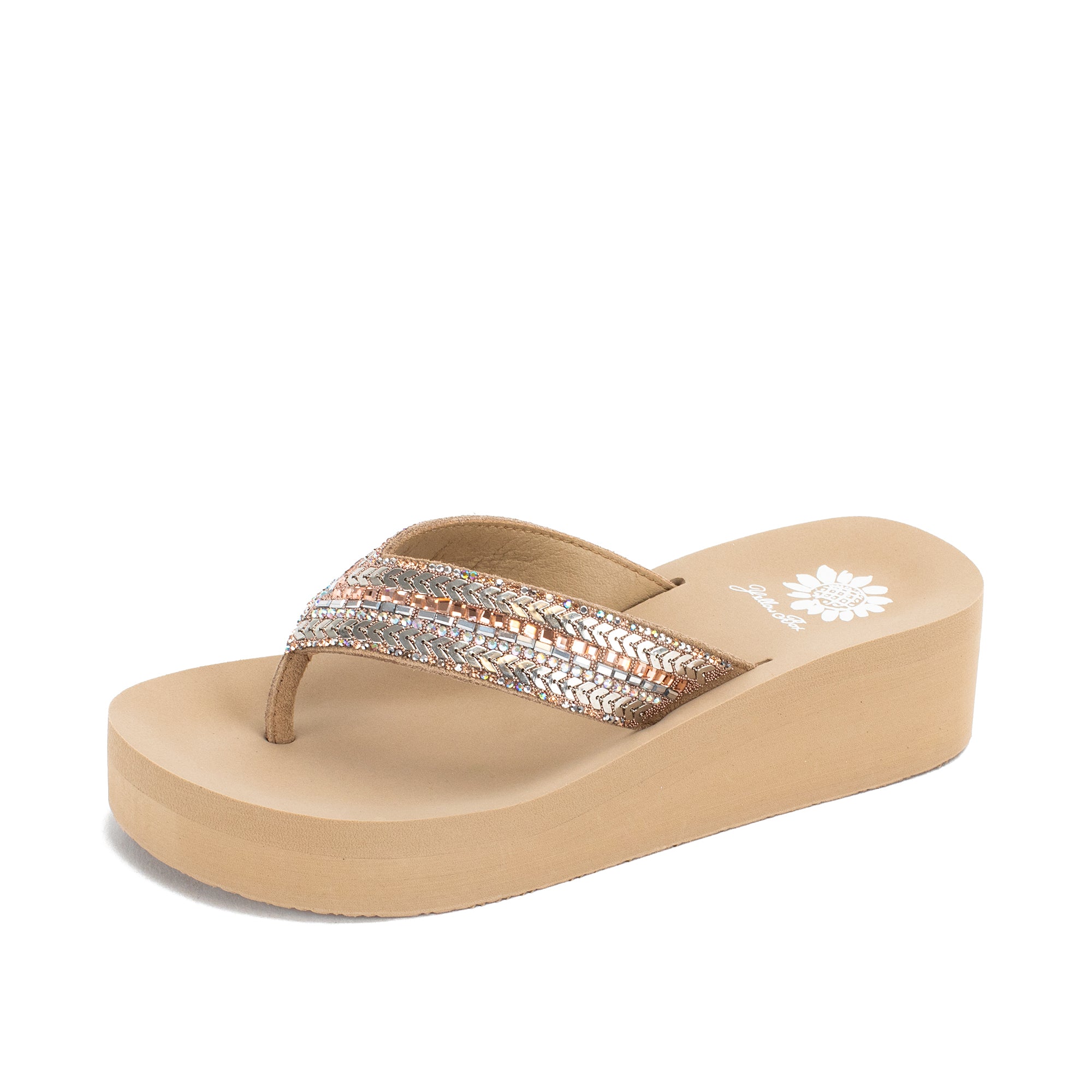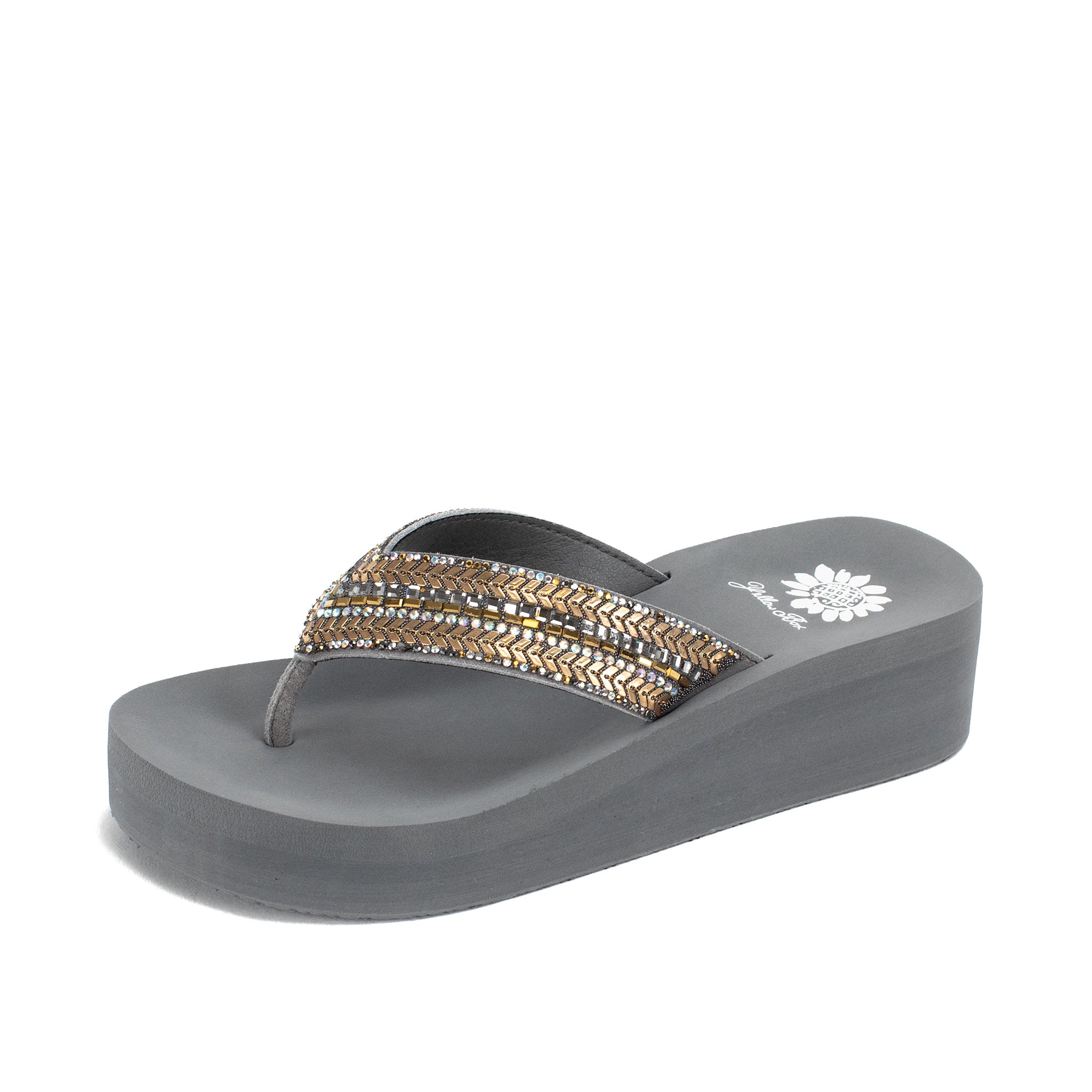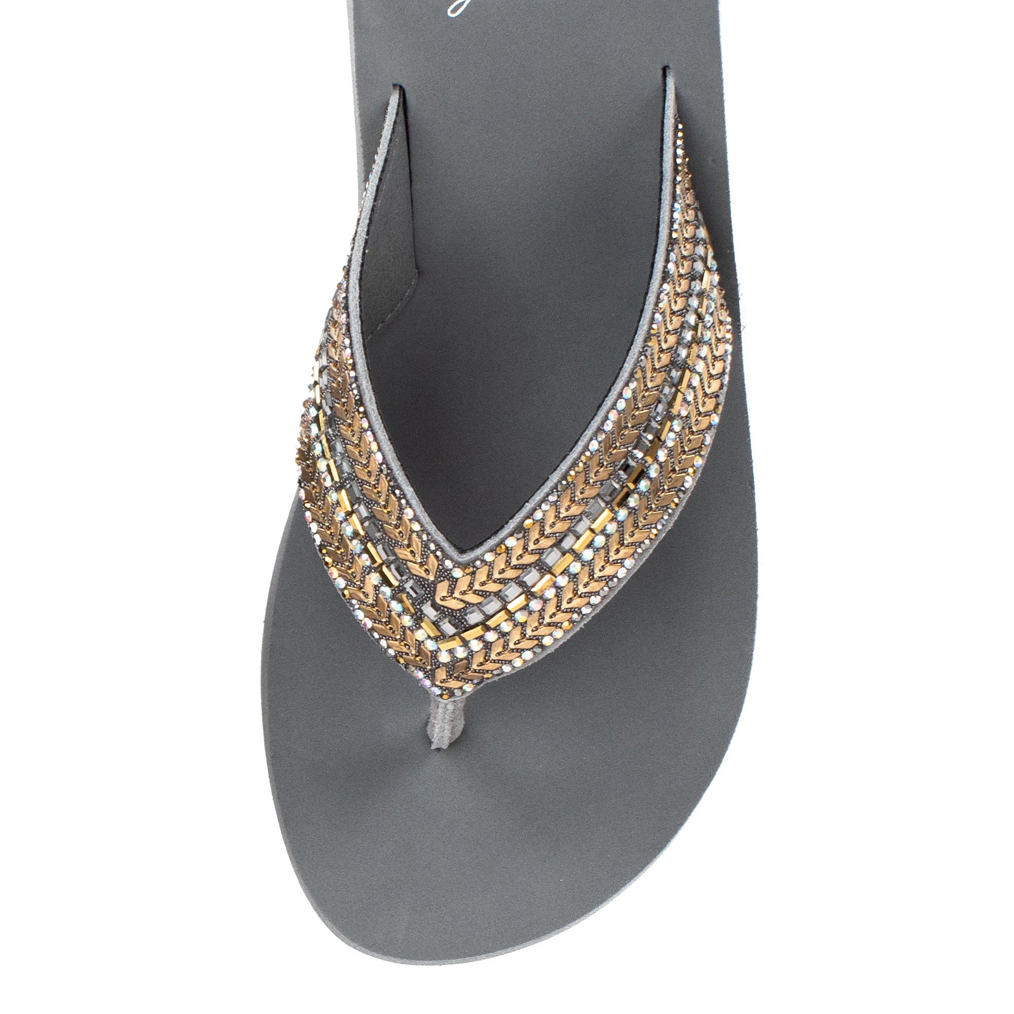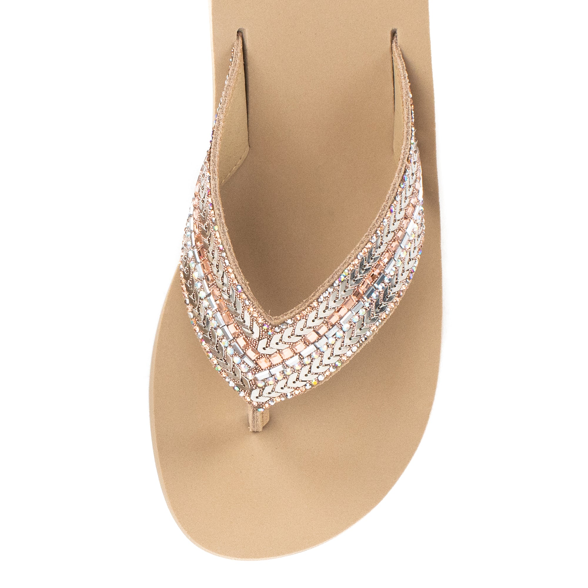 Get ready to shine with our RATHLIN flip-flops, featuring rectangle and square jewels, with glittering metallic chevron chains that provide a casual yet stylish look. This sandal has a medium wedge with a roomy footbed for comfort with each step.