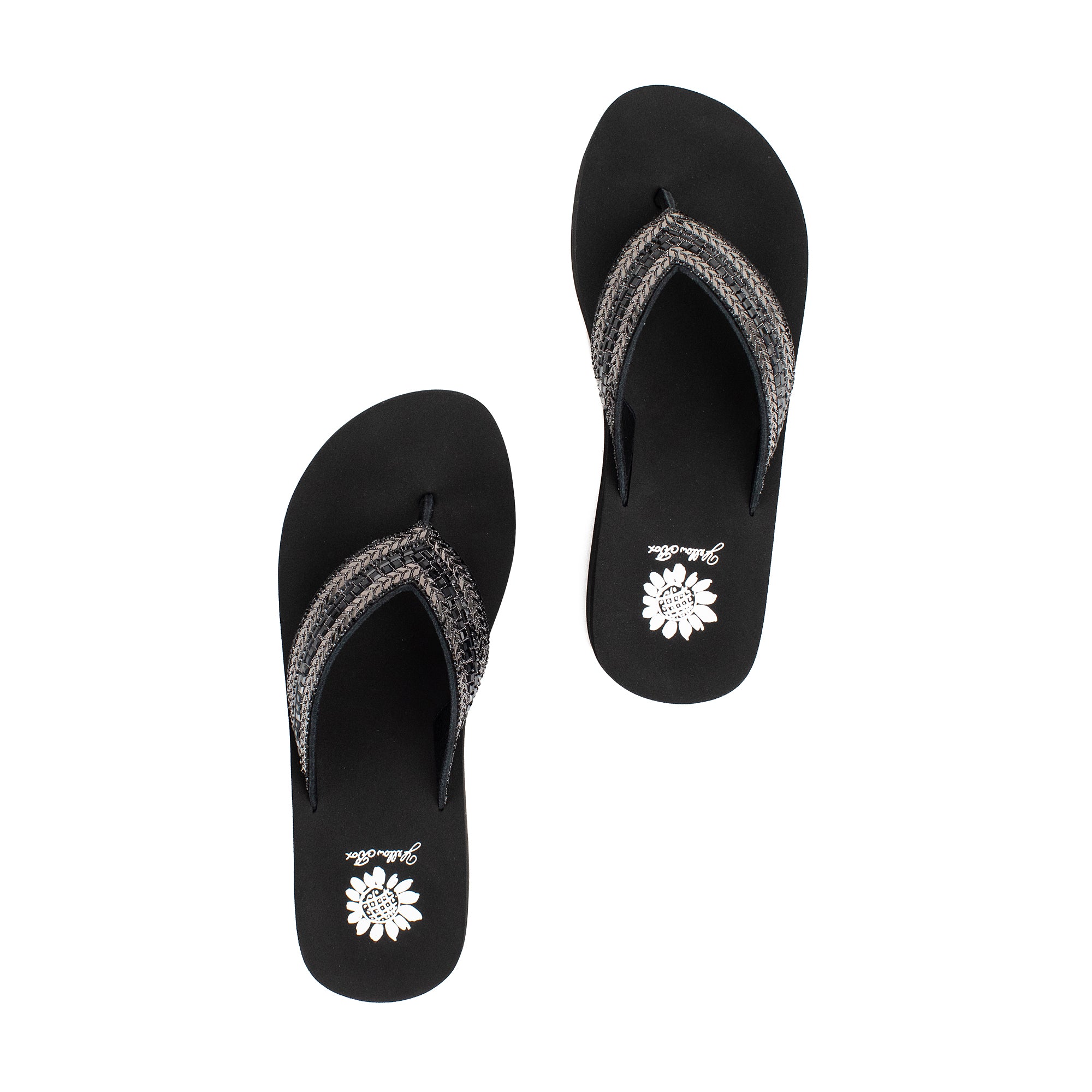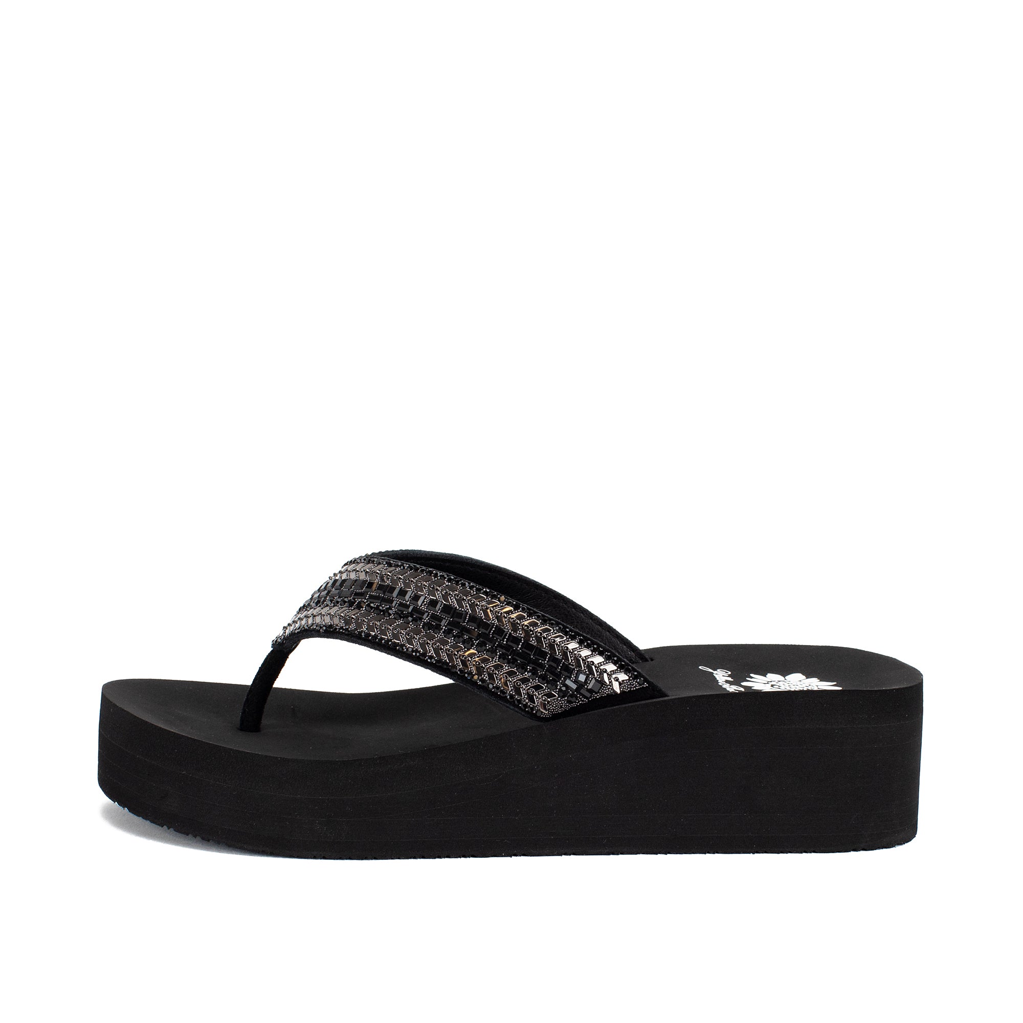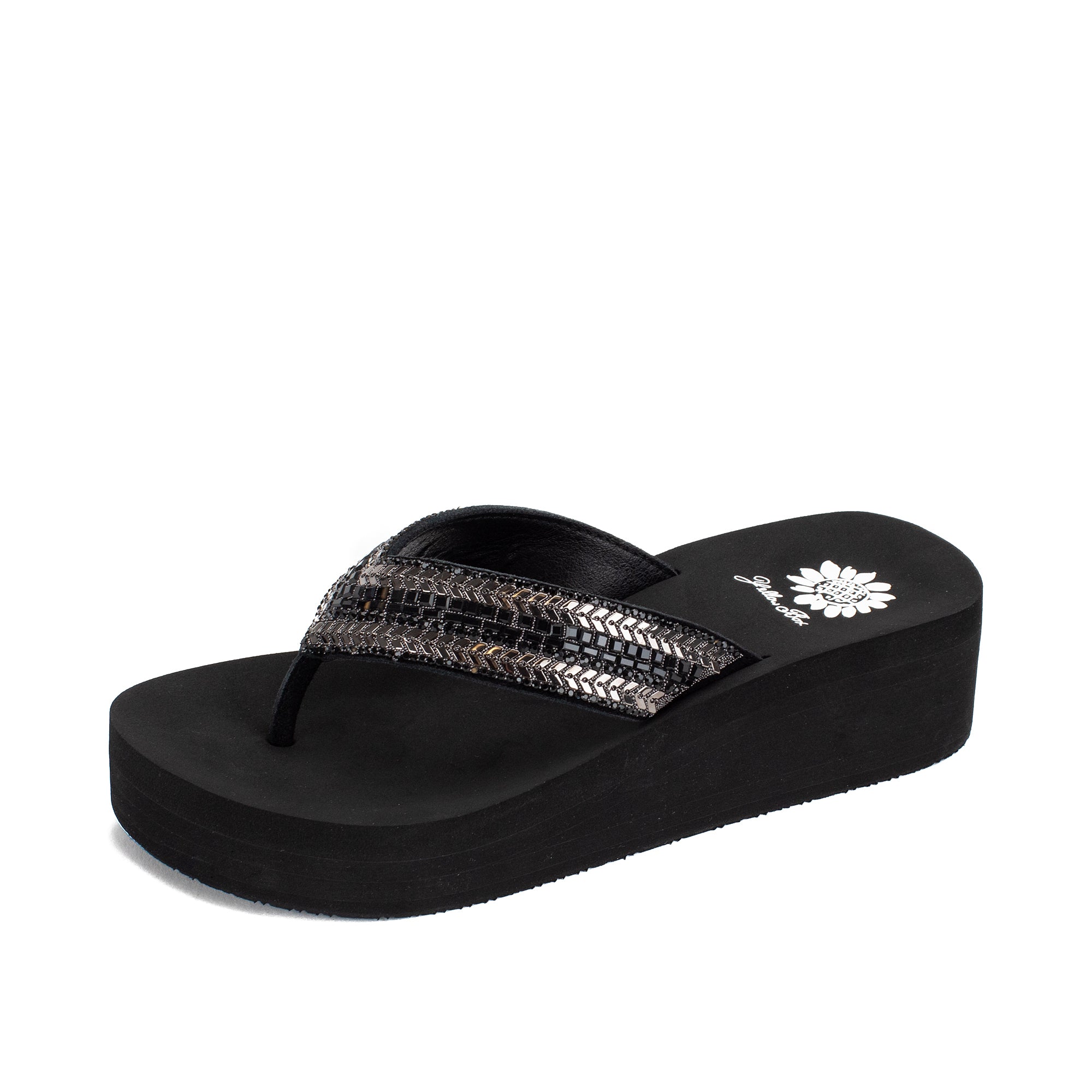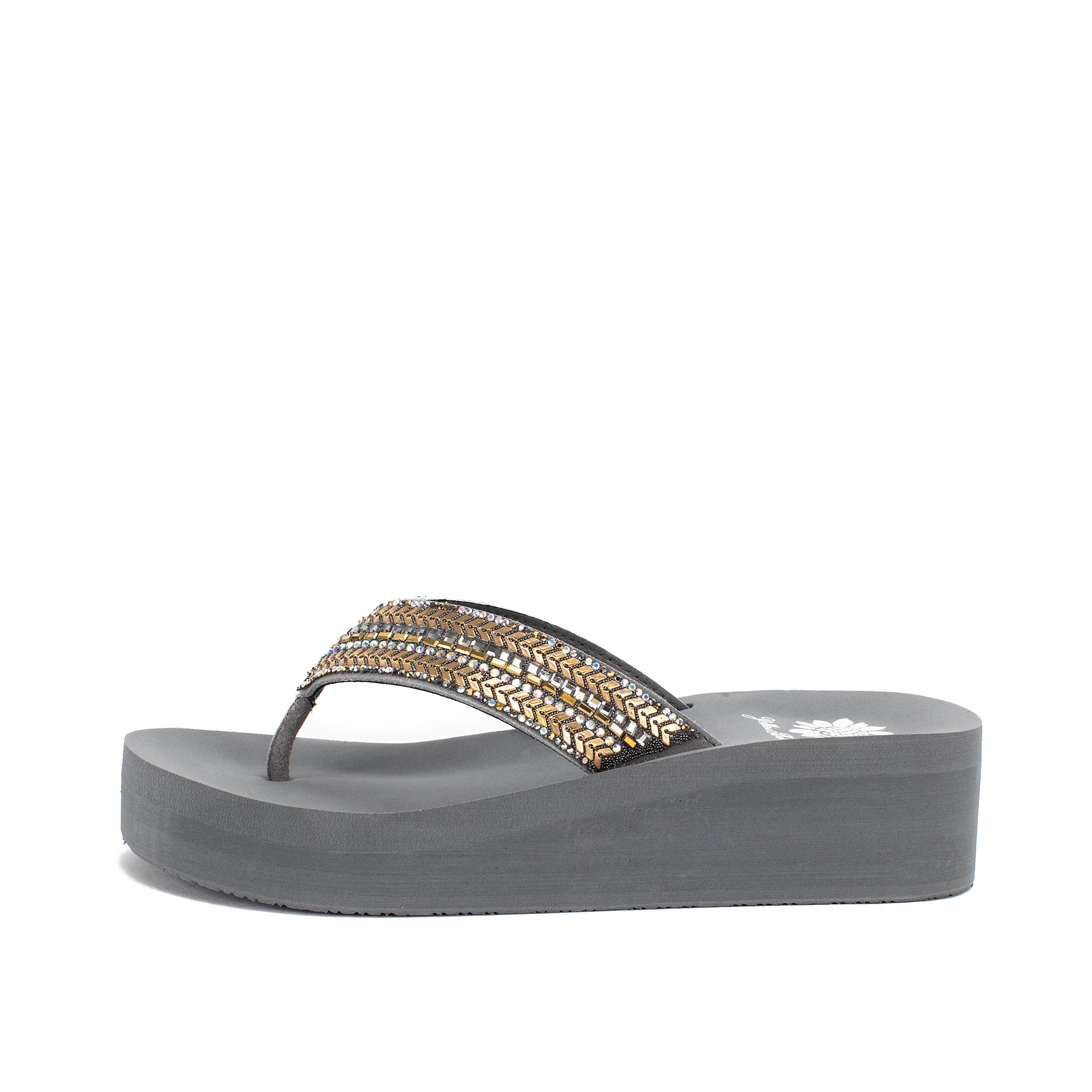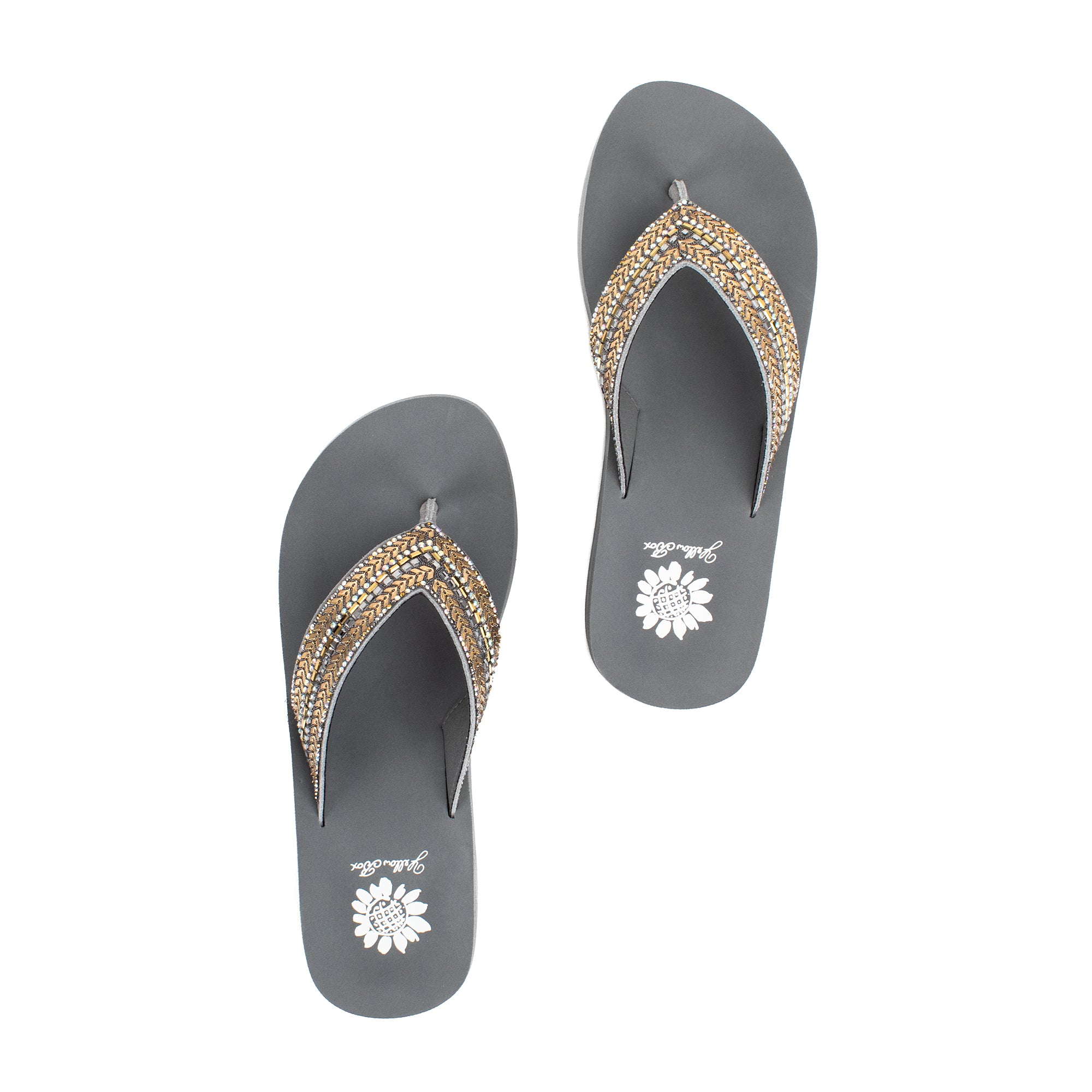 Get ready to shine with our RATHLIN flip-flops, featuring rectangle and square jewels, with glittering metallic chevron chains that provide a casual yet stylish look. This sandal has a medium wedge with a roomy footbed for comfort with each step.