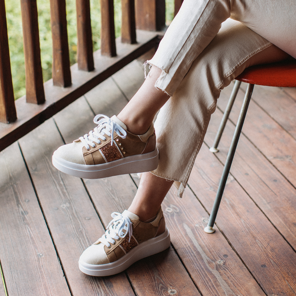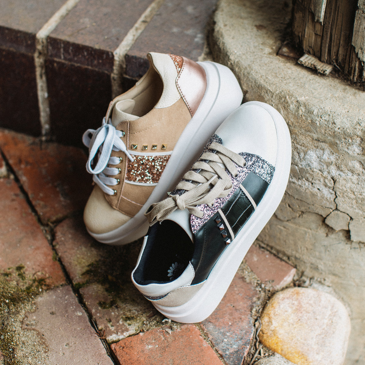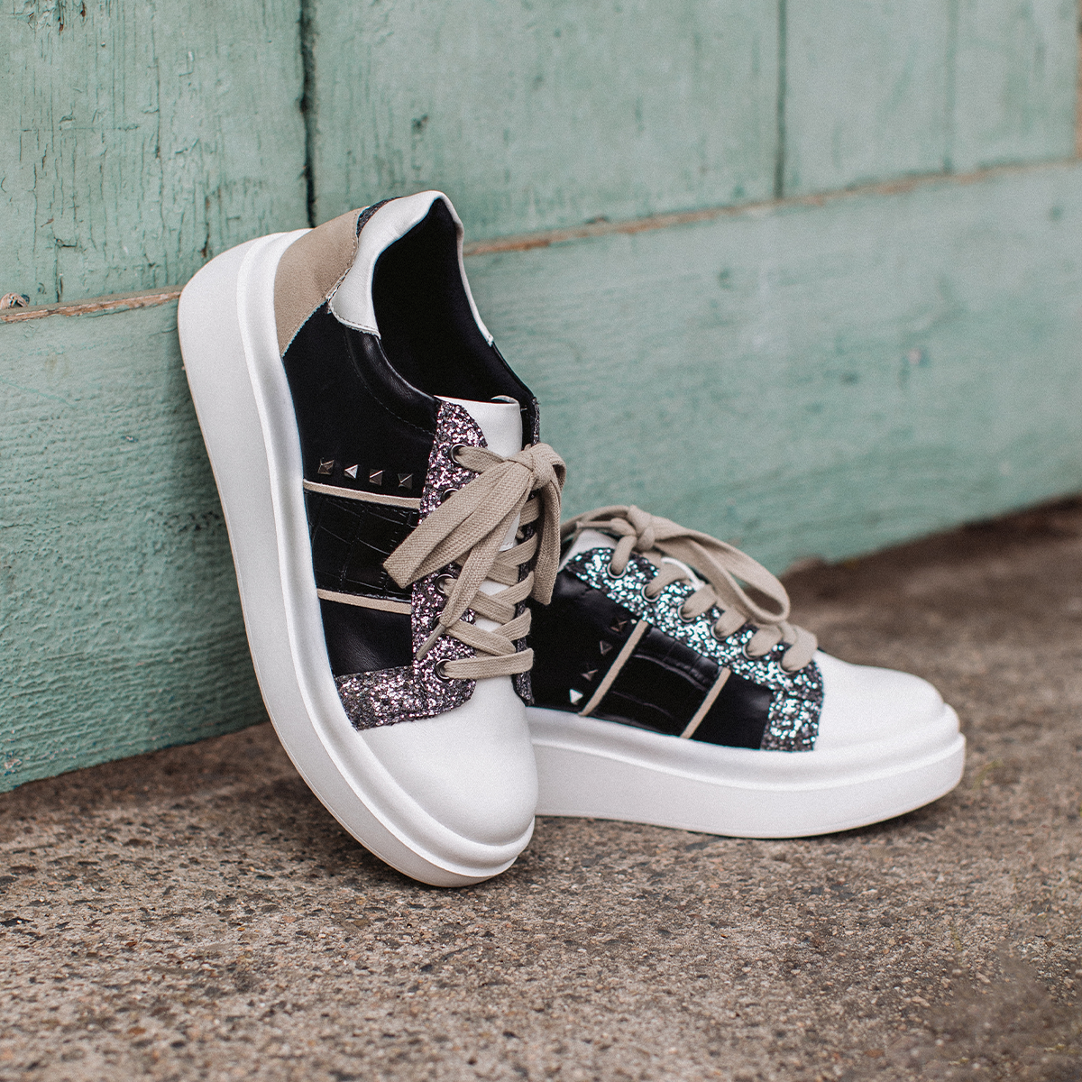 The layers of eye-catching mixed media materials, colors, and variations of textures are what give our ELVERA platform sneakers their iconic look. Glitter, faux croco, and stud embellishments add a touch of whimsy and sparkle to the design. Finished with our ever-so-popular, on-trend chunky platform outsole with a slight flare, lightweight enough for all-day everyday wearability.