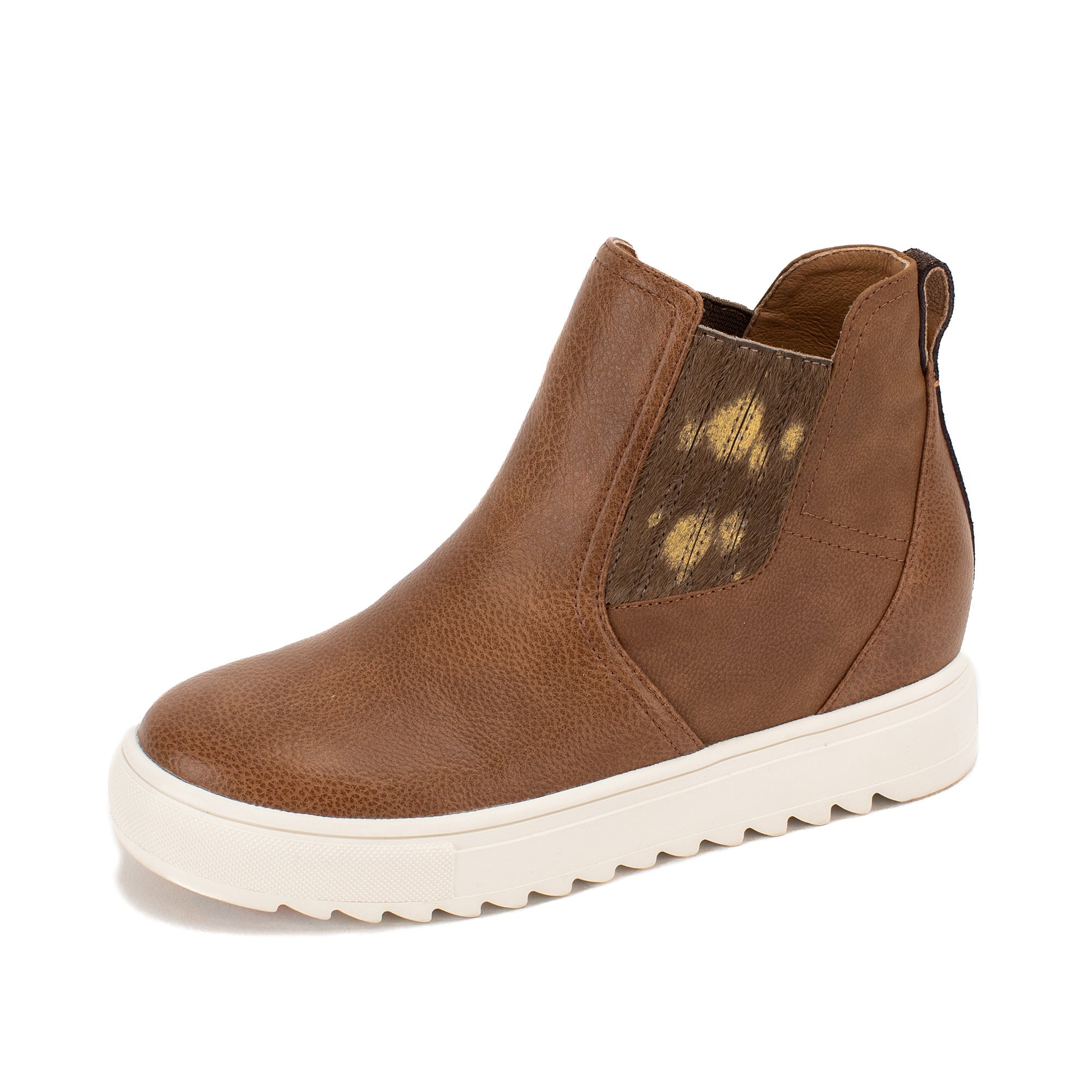 Step into the spotlight with MALVENA—the ultimate fusion of athleisure style and versatility. This sneaker blends tumbled and smooth faux leather, with cow-printed textured double gores at the side for easy on and off. Its subtle hidden wedge adds a touch of sophistication while elevating any outfit.