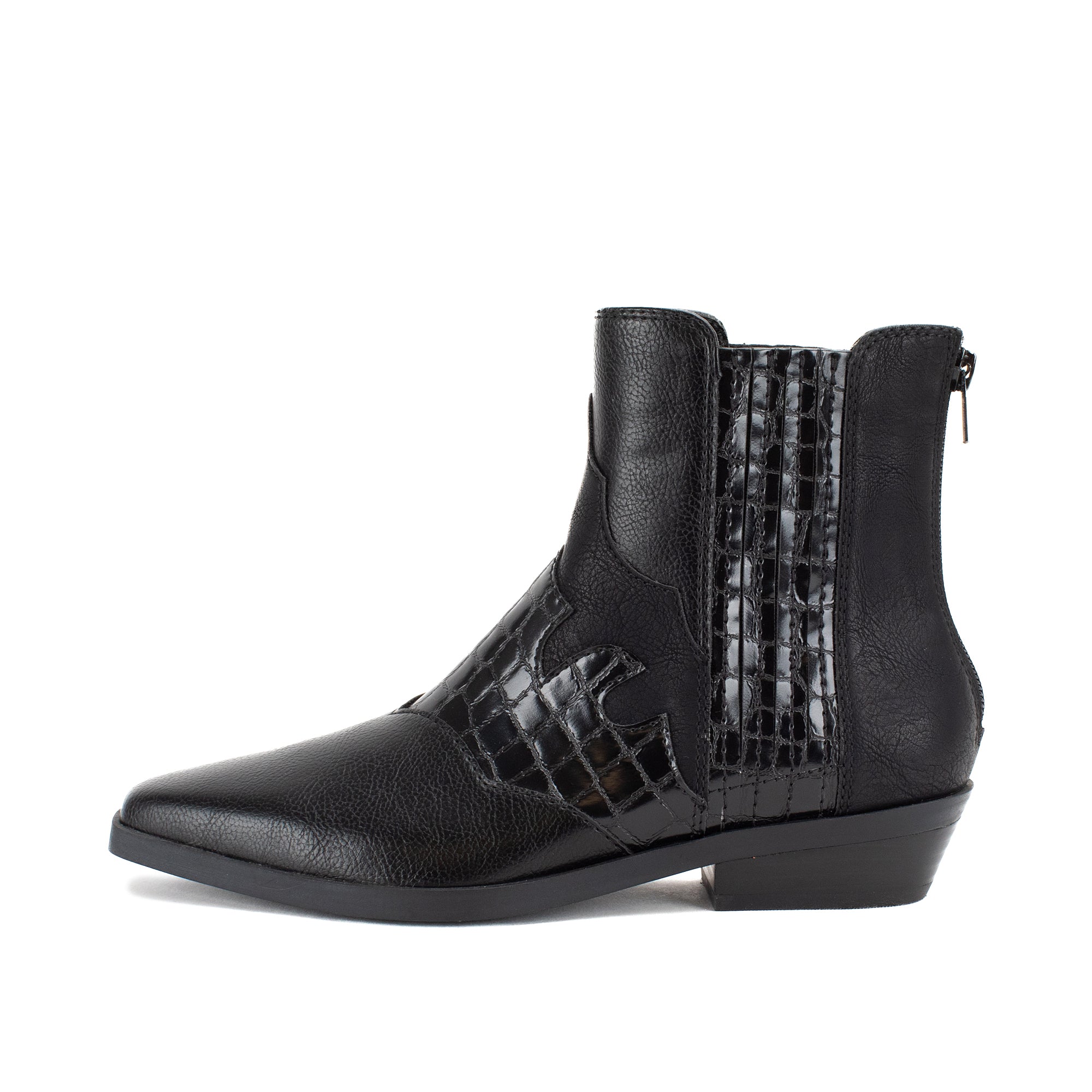 Wear these to the rodeo or to the mall, the WILLIS western booties will keep you on-trend and comfortable all year round. This playful design features a low block heel, a pointed snip toe design, with a mix of exotic croco and snake faux leathers that embody the hottest wild west trend of the season.