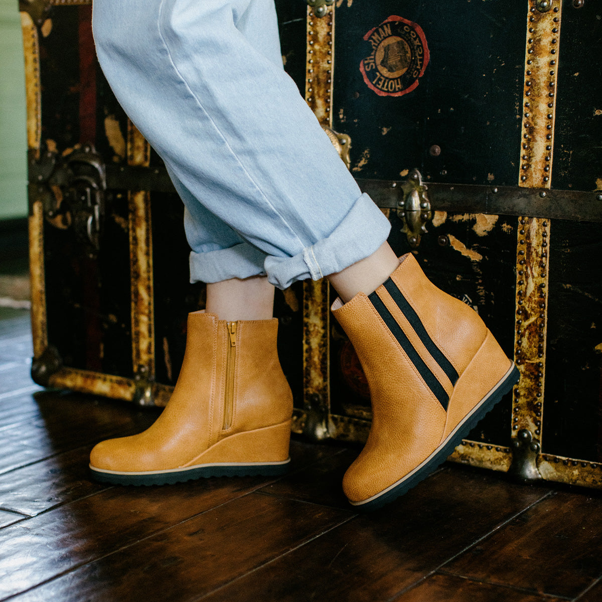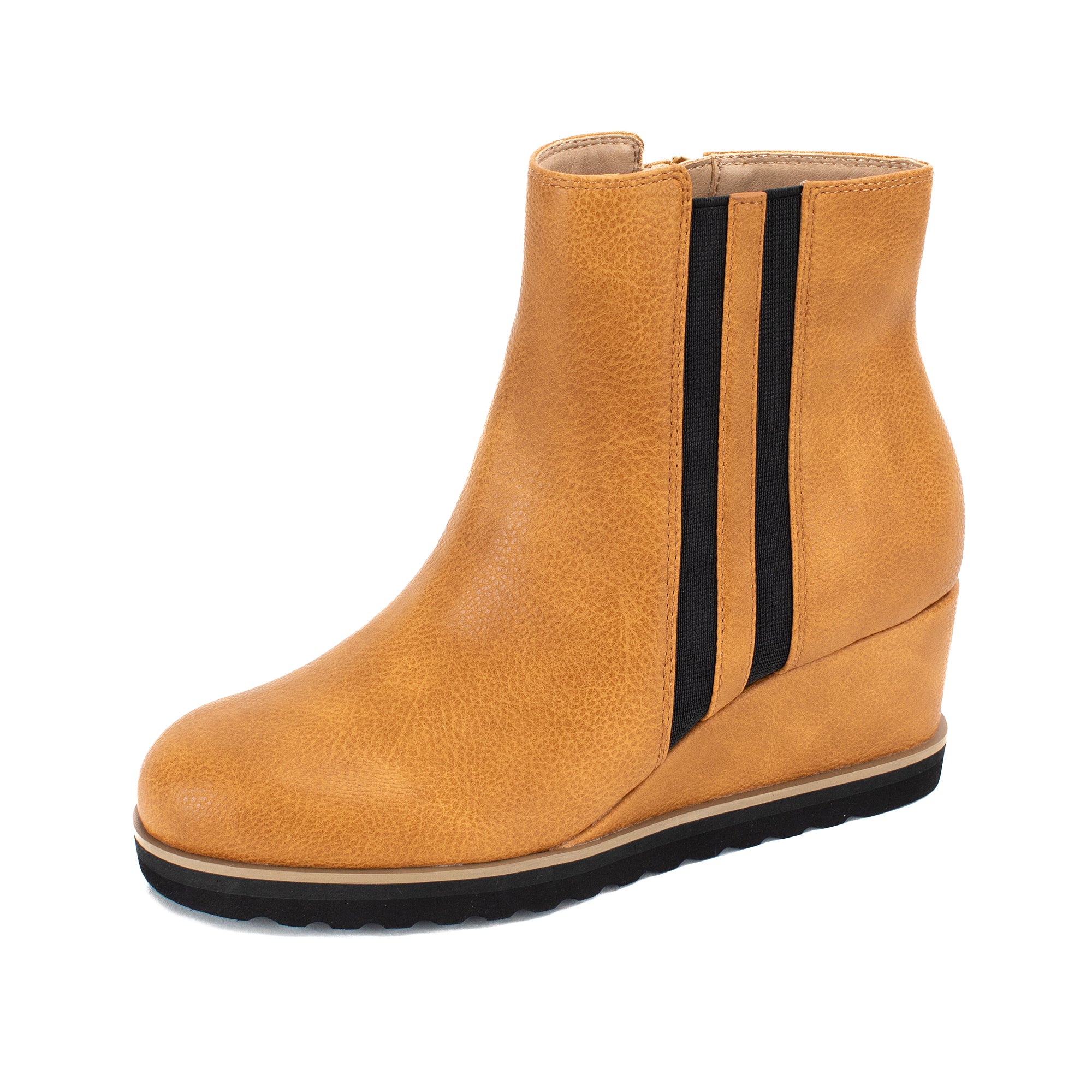 Classic stripes never go out of style. Wear the look in the CEFFA wedge boots with a striped elastic panel for flexible fit.