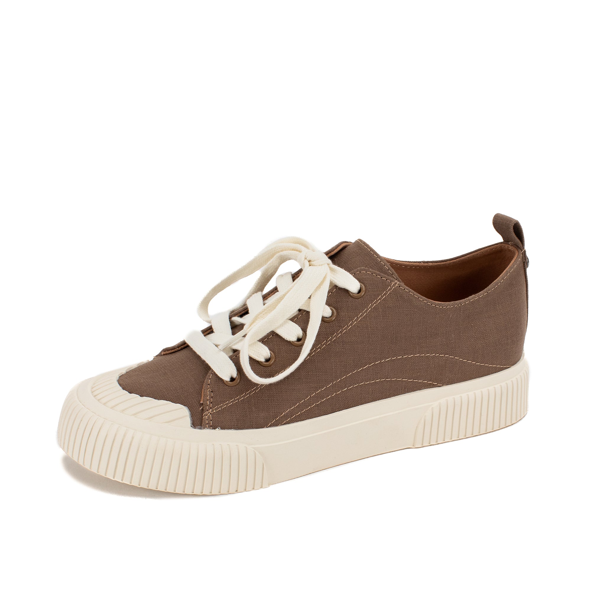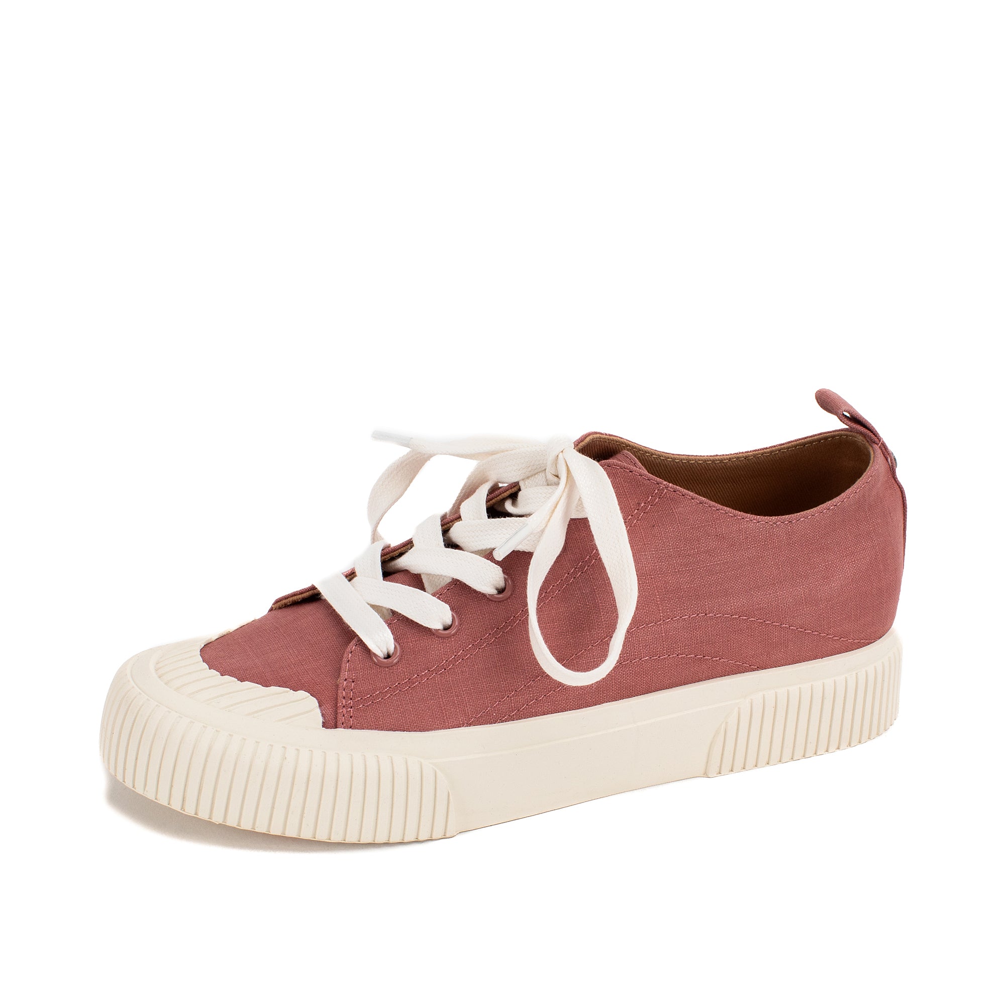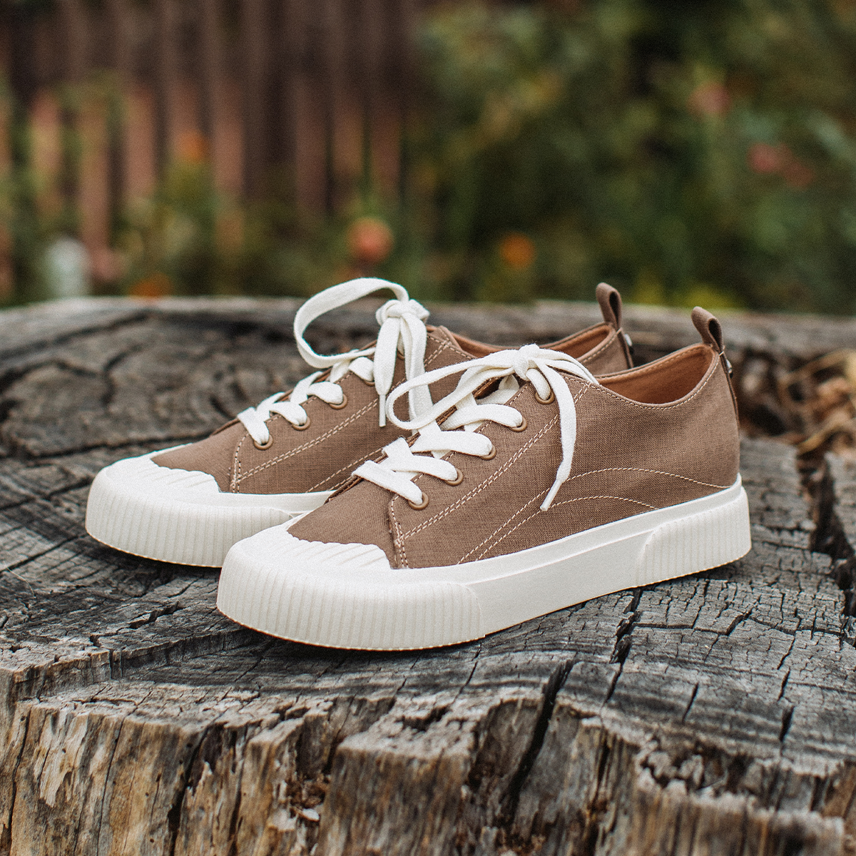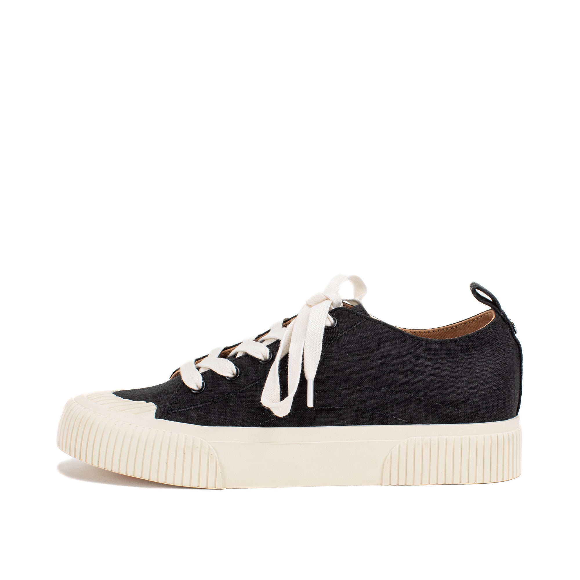 GINA is a classic minimalist low-top sneaker with a cushioned hidden wedge. The lightweight linen upper, retro toe cap, and branded stud embellishment will seamlessly complete any of your go-to outfits.