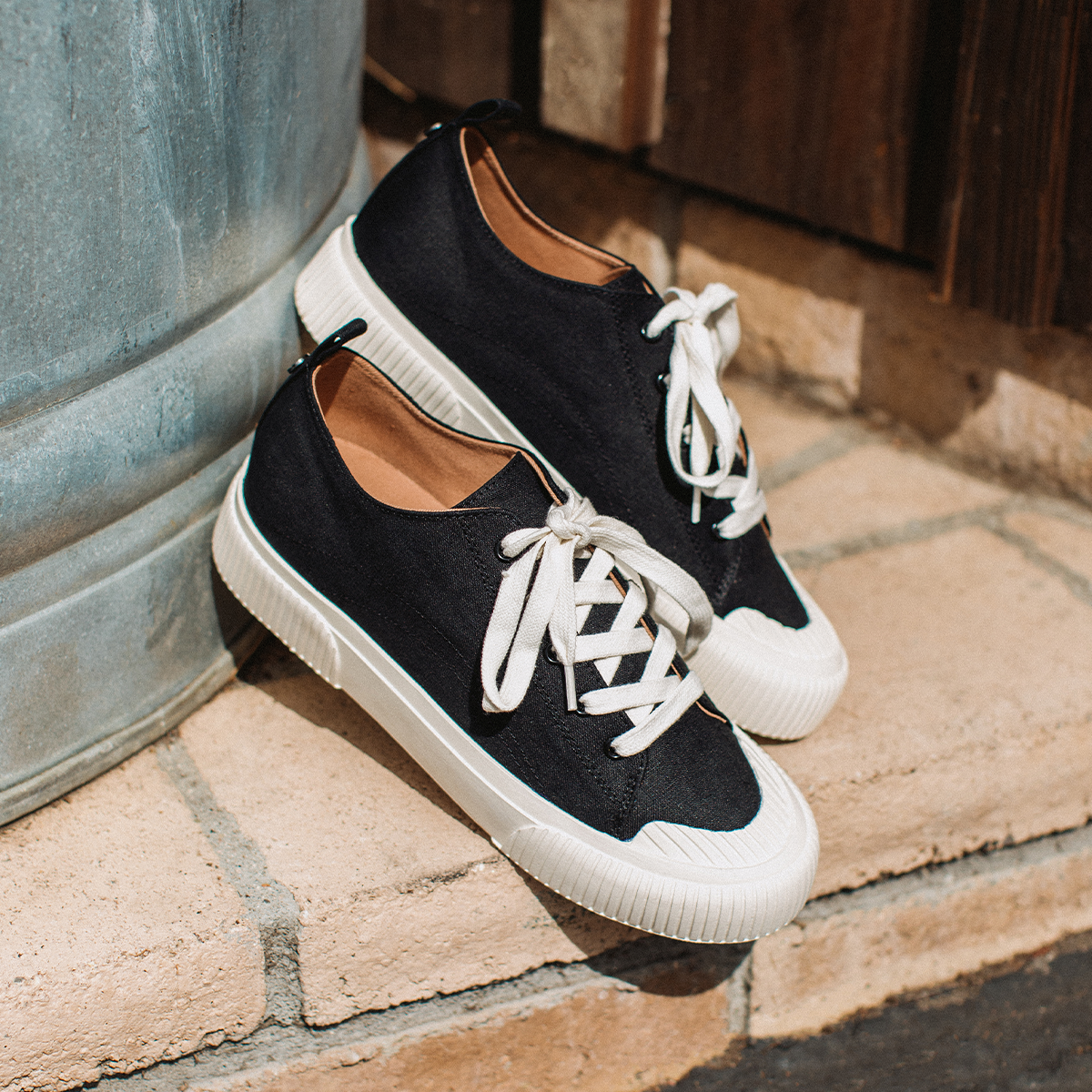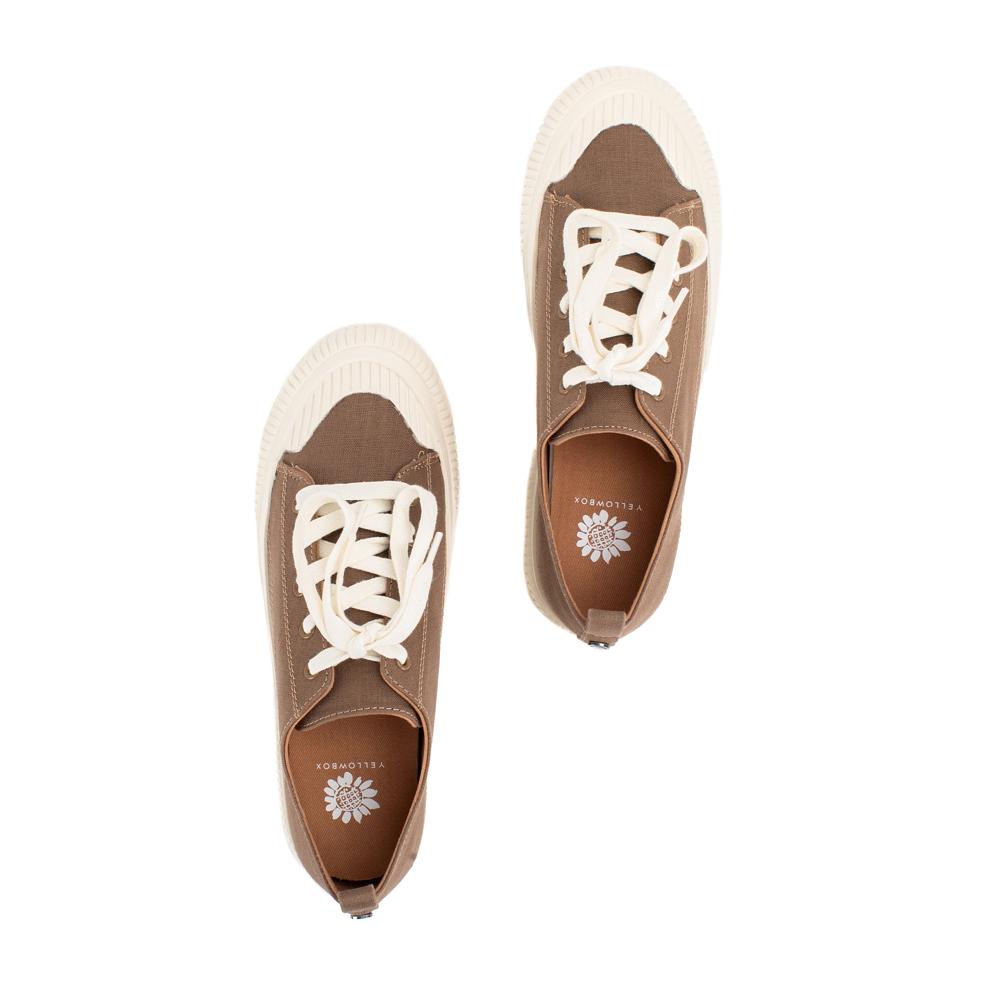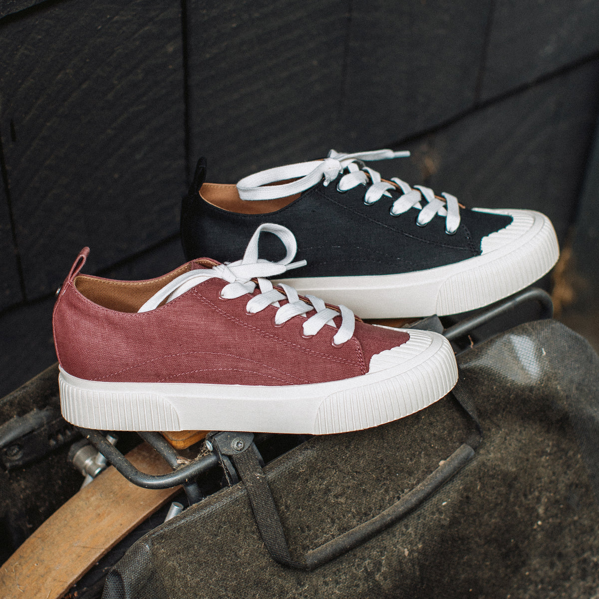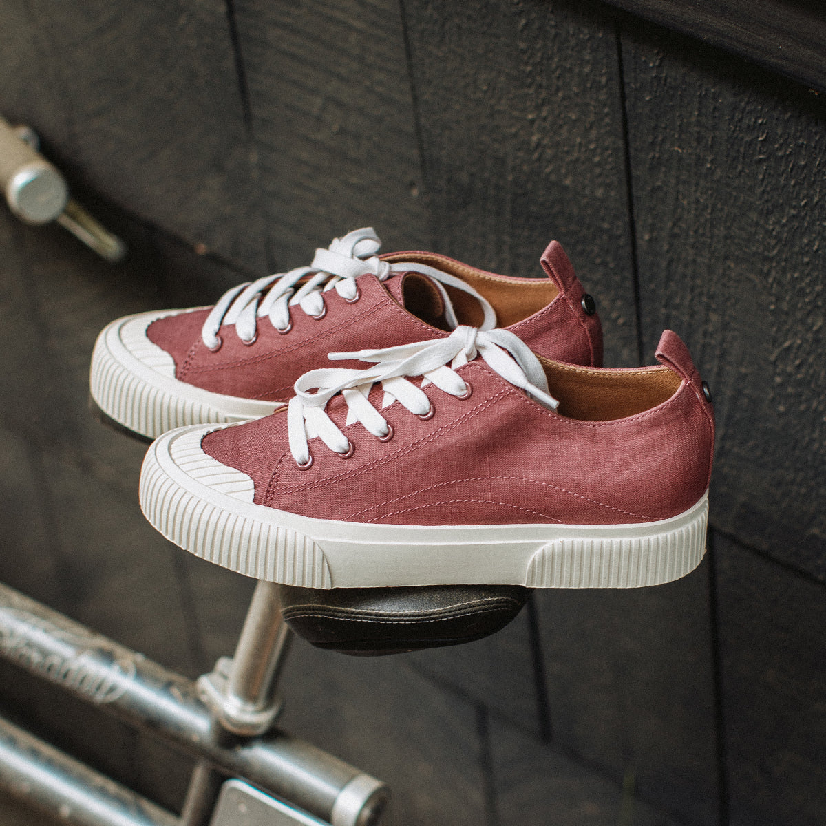 GINA is a classic minimalist low-top sneaker with a cushioned hidden wedge. The lightweight linen upper, retro toe cap, and branded stud embellishment will seamlessly complete any of your go-to outfits.