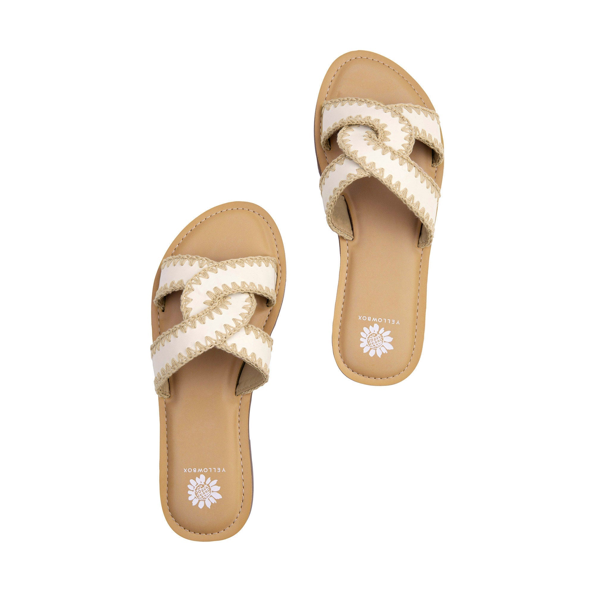 The DANDIE slide sandals feature interlocking cutout detailing, and the blanket stitching edges add a boho flair to your summer outfits. The sandal sole is cushioned with Signature Yellow Box High Rebound EVA for all-day comfort.