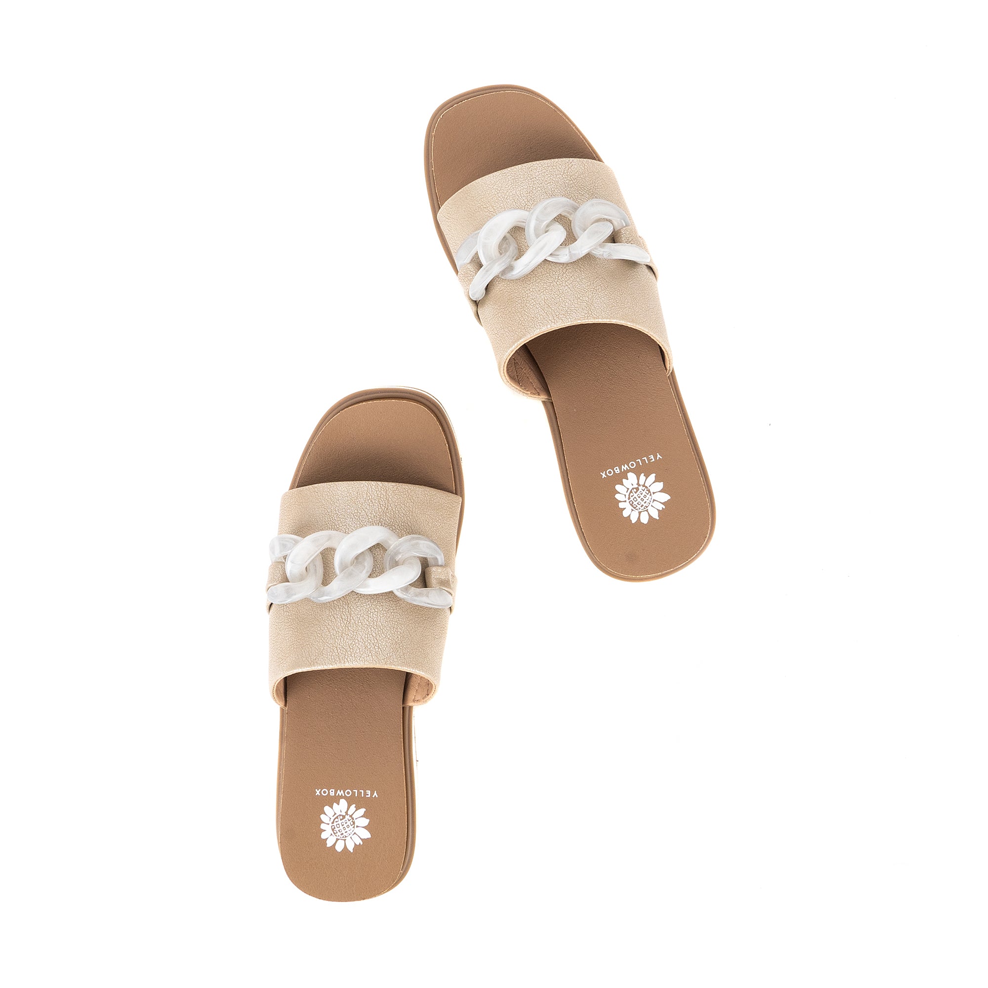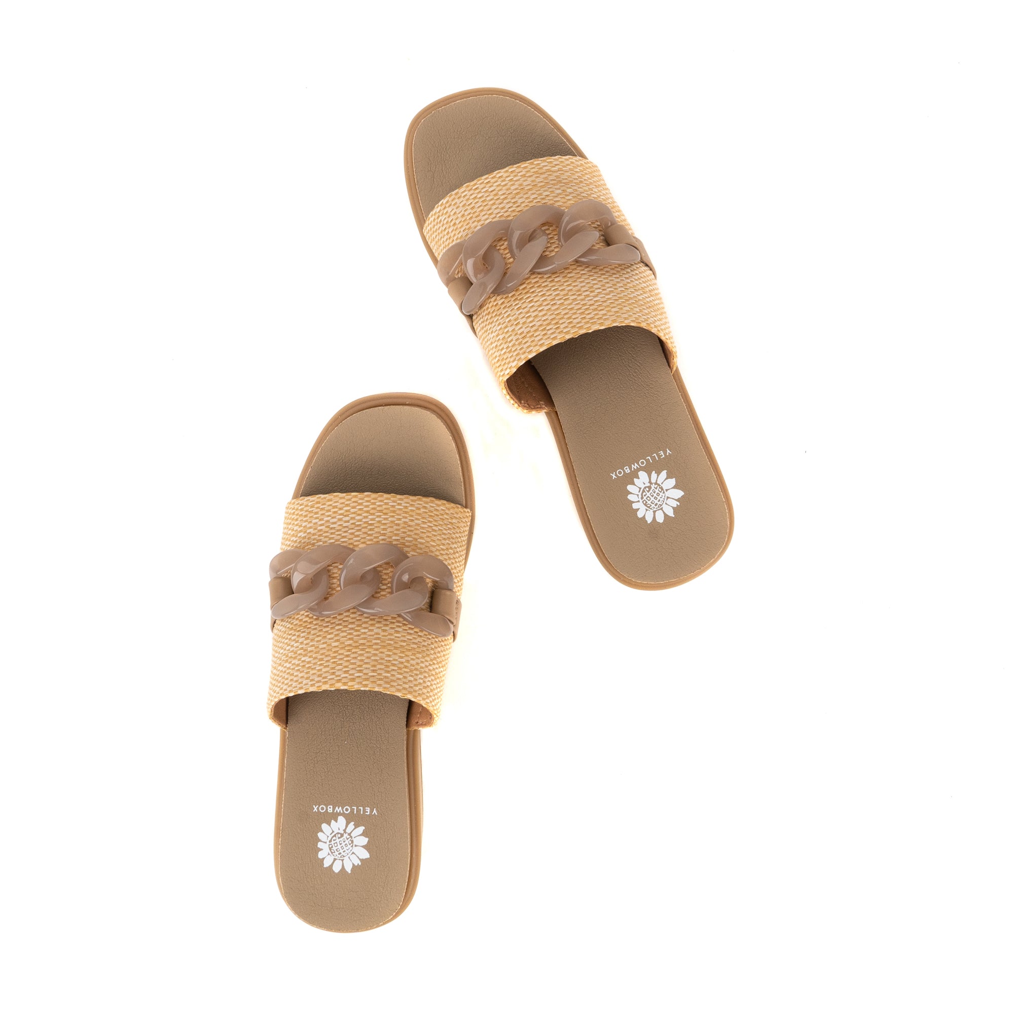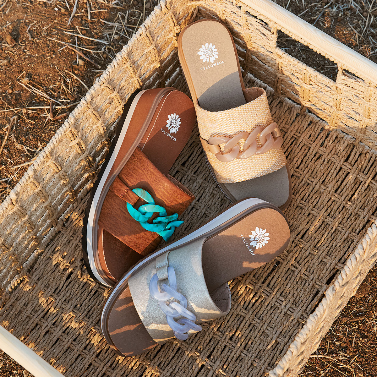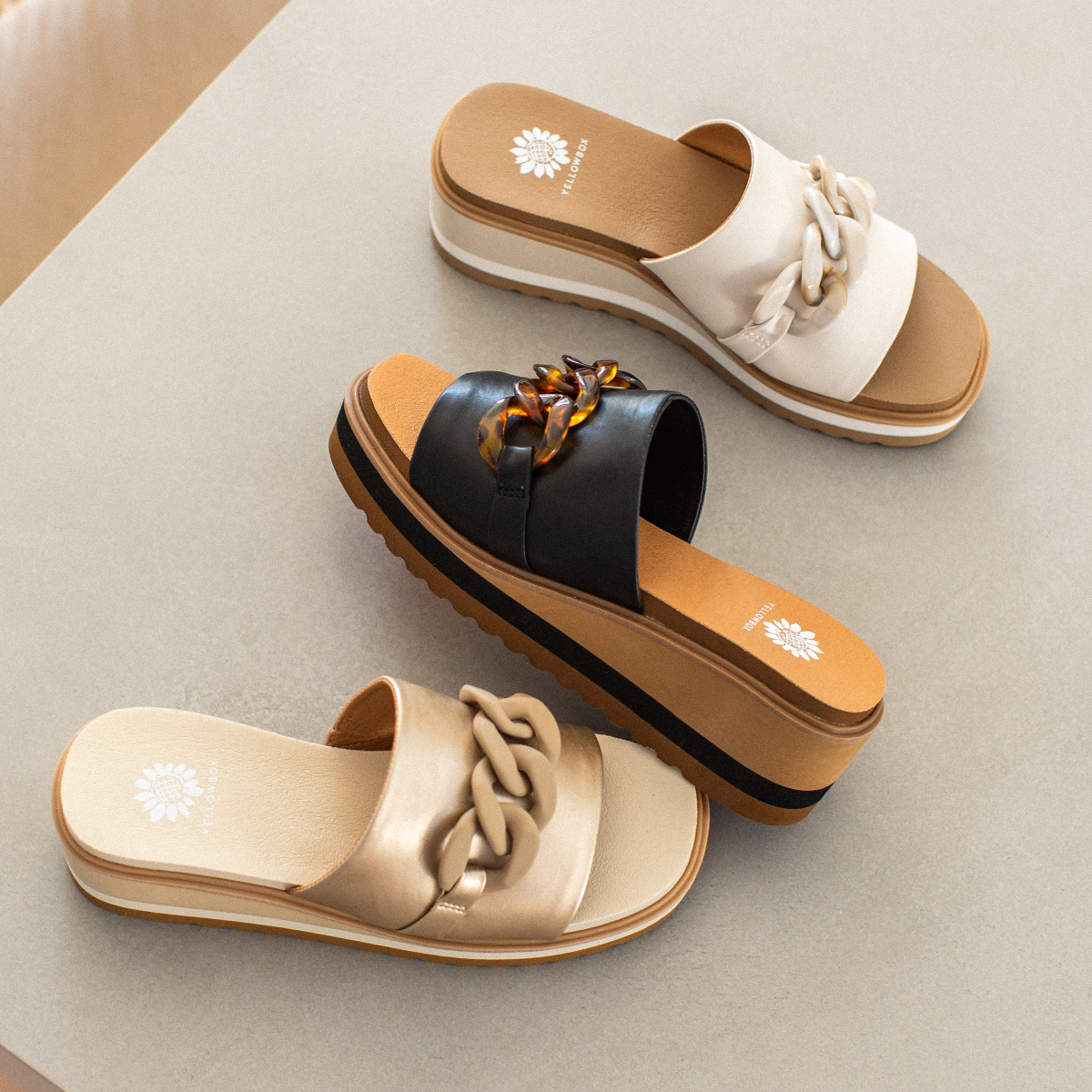 ALORA is a minimal slide sandal adorned with elegant chunky chain hardware that helps add a touch of sophistication to any outfit. ALORA features a squared toe shape and our Signature Yellow Box padding, perfect for everyday comfort.