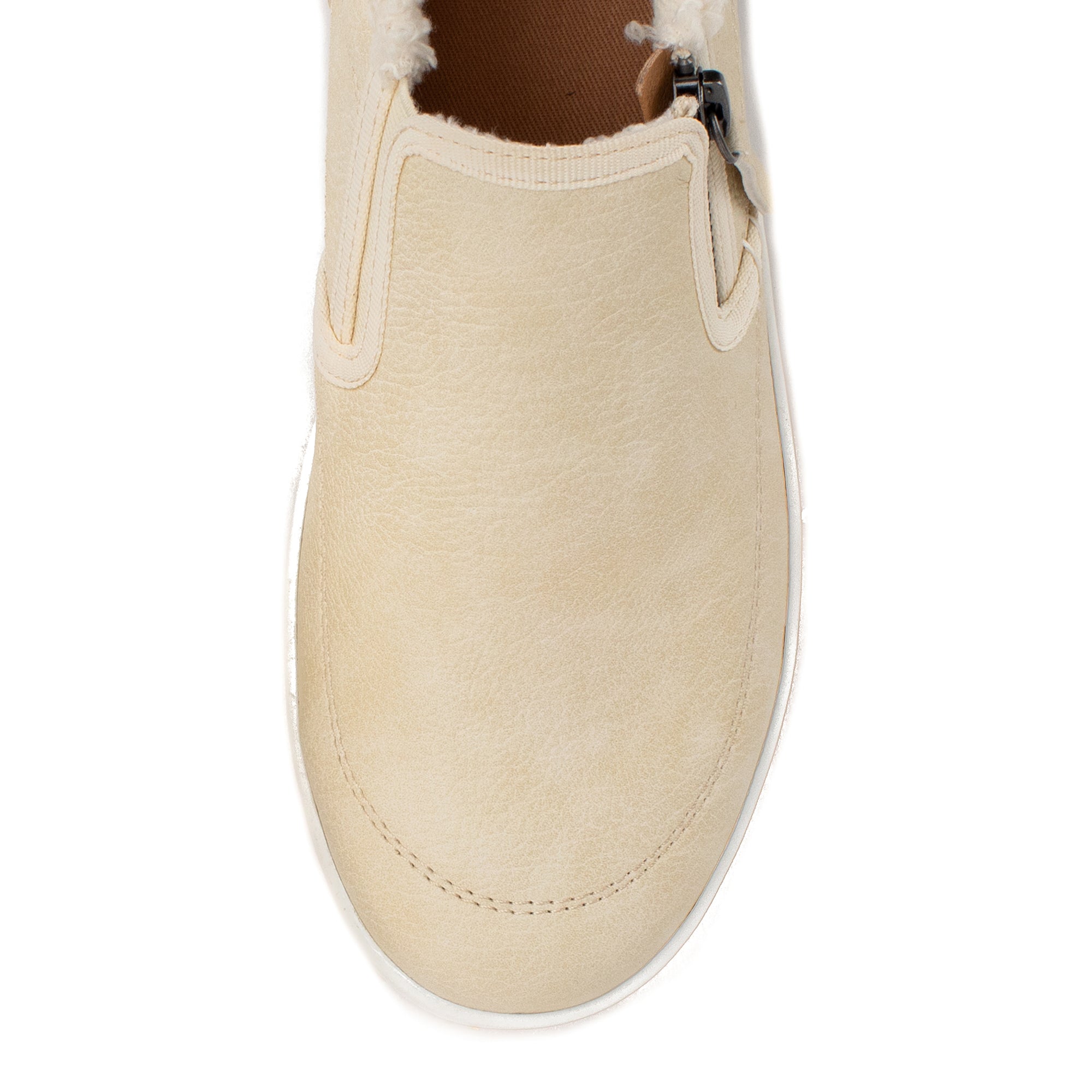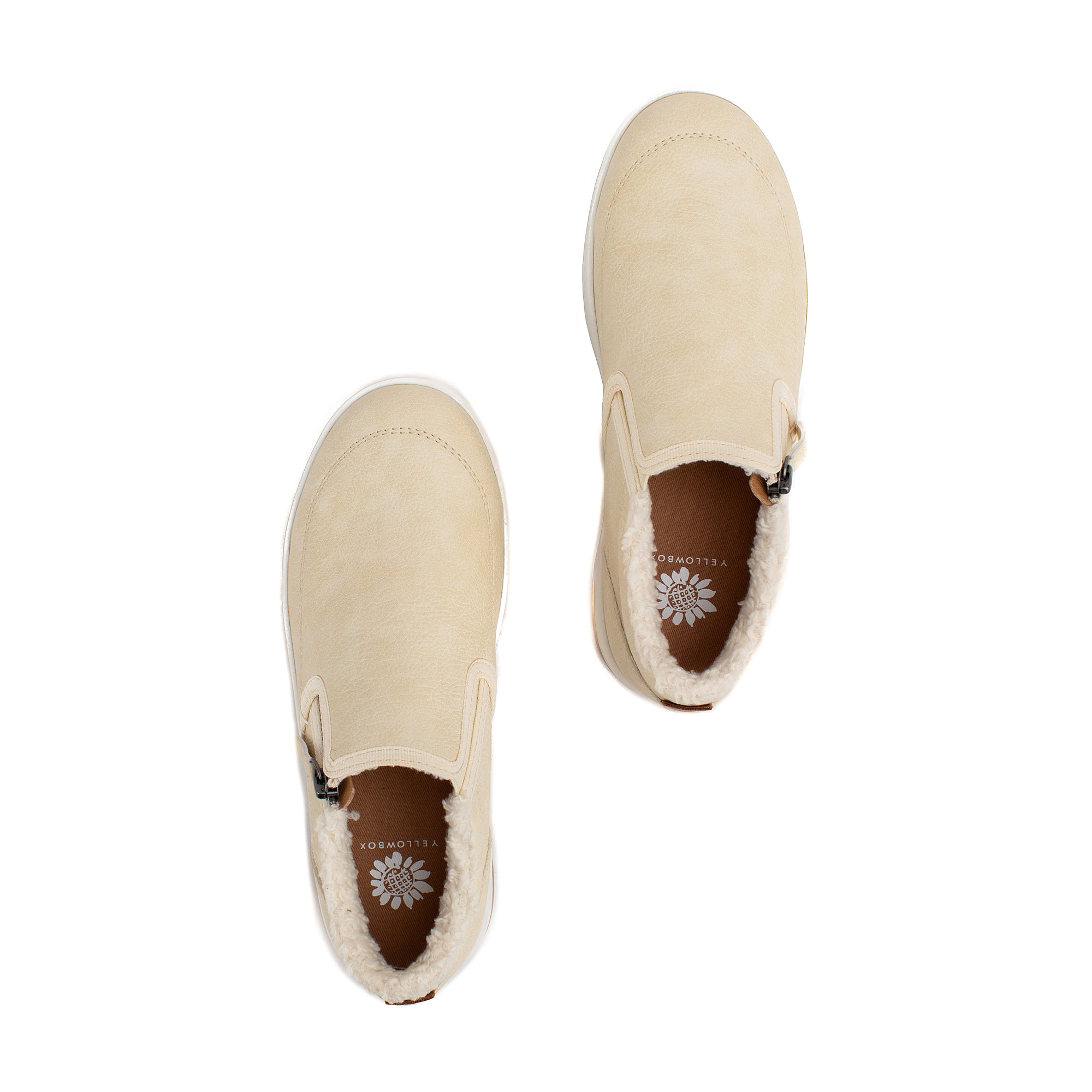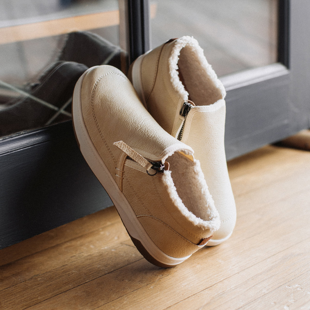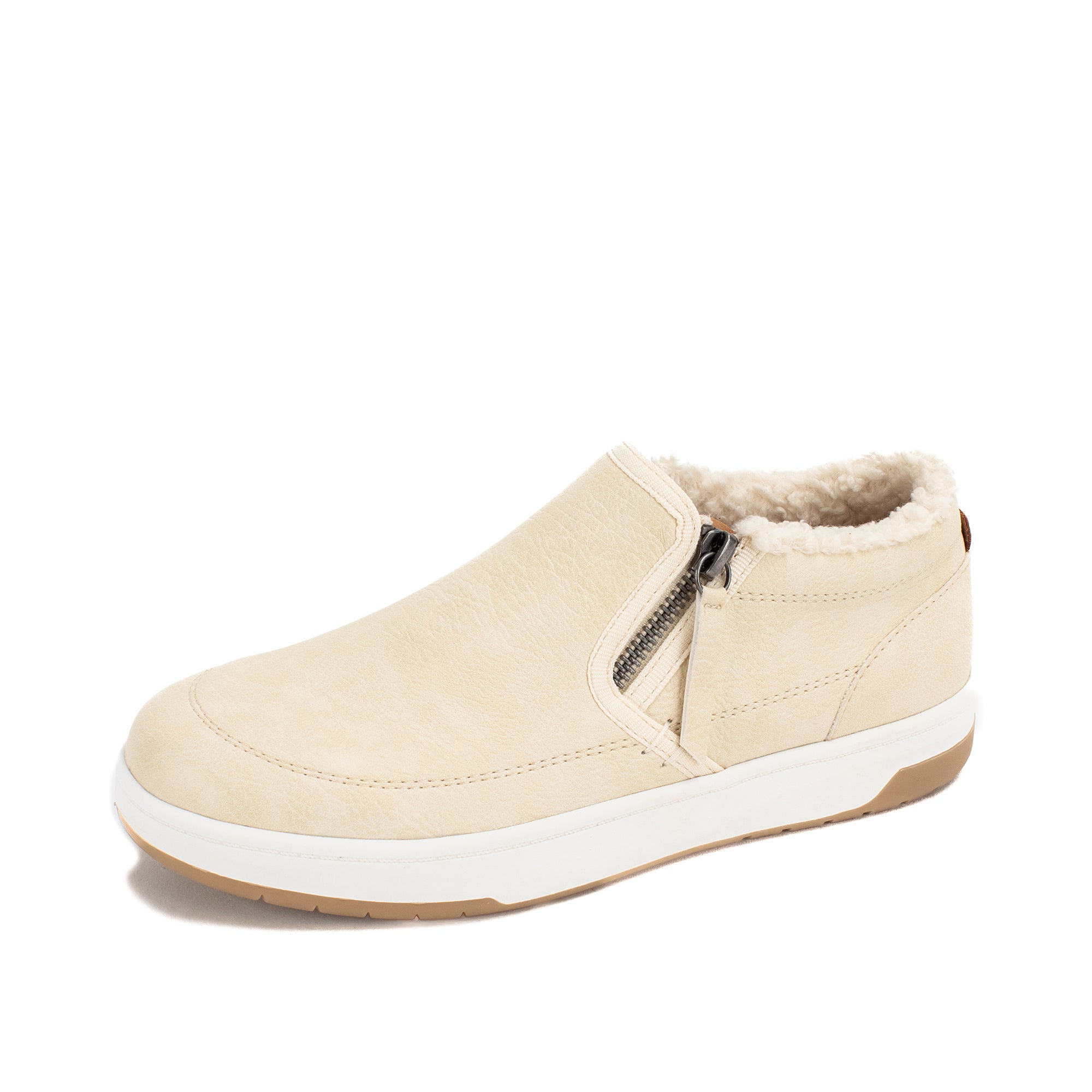 Meet NAOMY, a perfectly clean-cut, sleek, and convenient sneaker. Featuring a smooth vamp with an offset side zipper and matching pull tab. Wear it as a slip-on with the inside gore, or unzipped to showcase the faux shearling back collar.