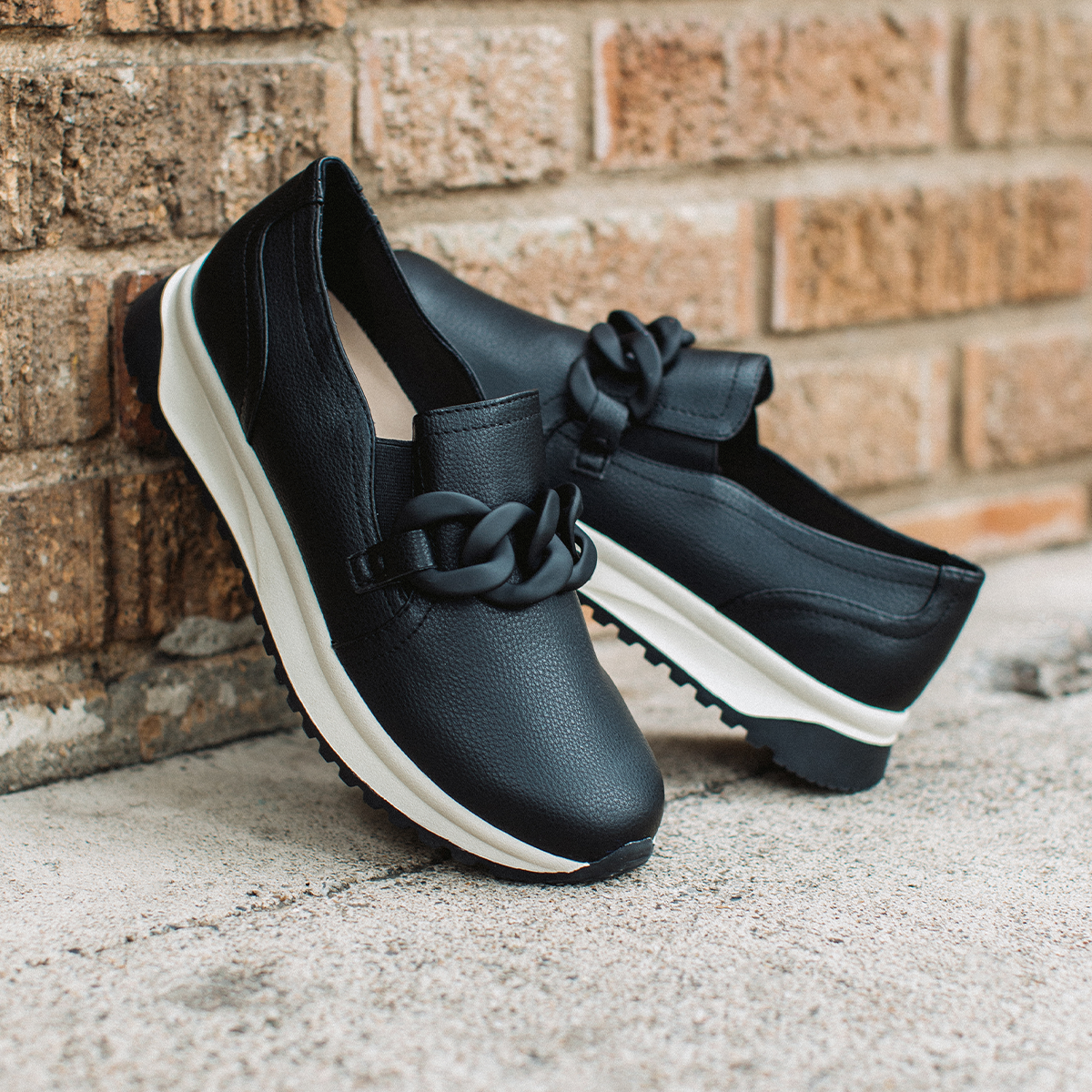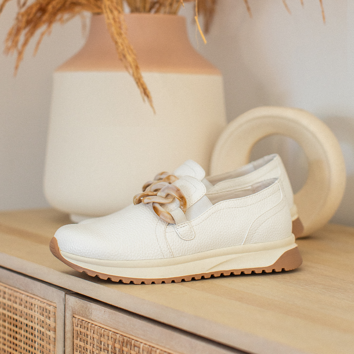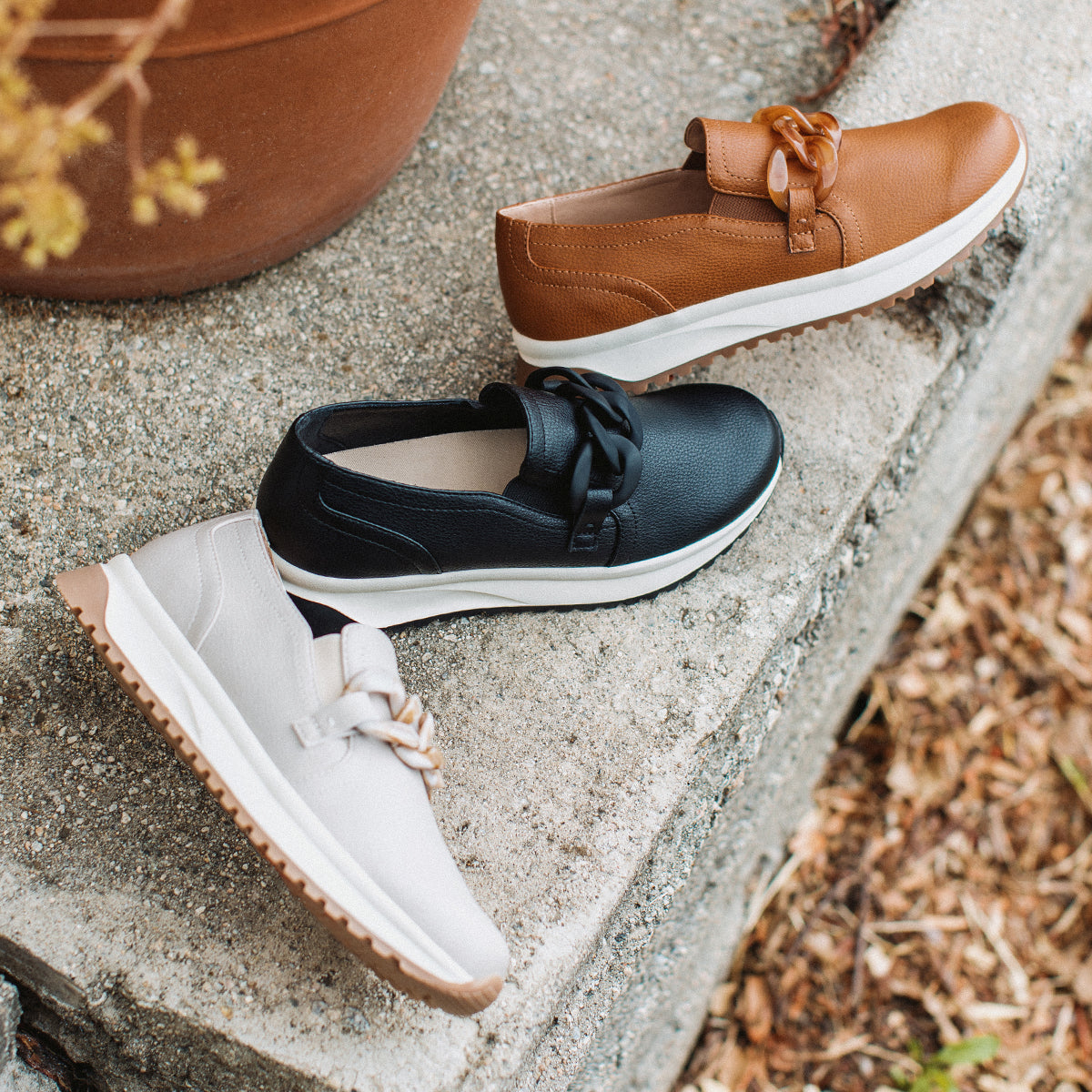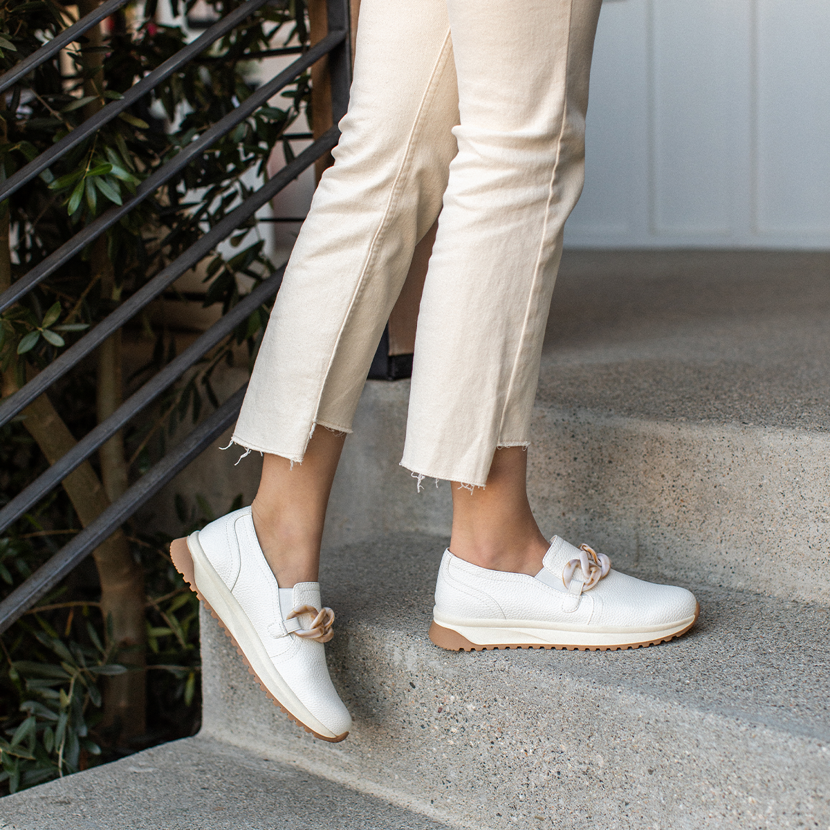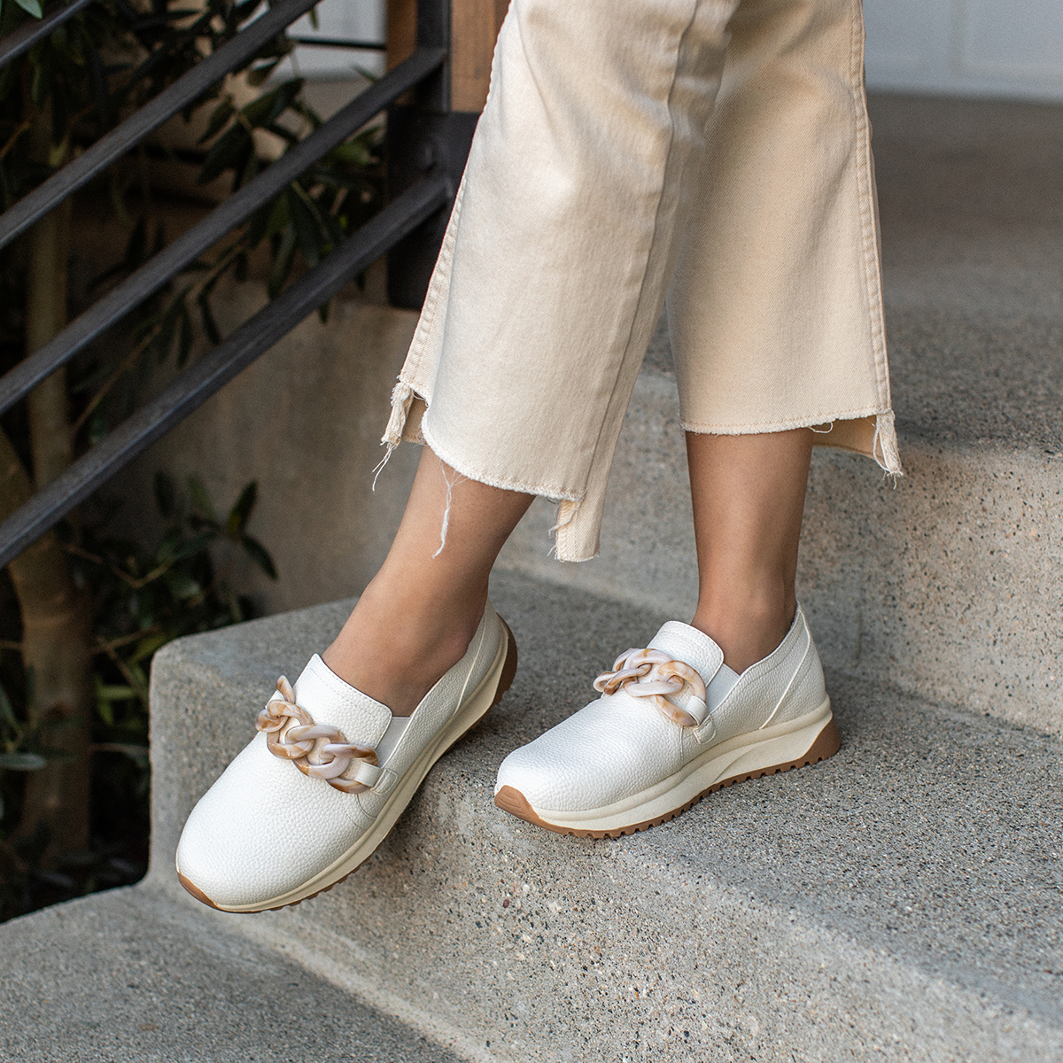 Our iconic RORY sneaker is back! Now available in 5 essential hues, including white (exclusively sold online) and two new colors—Dark Taupe and Almond. This elevated, bestselling sneaker features a slip-on loafer upper with chunky chain hardware and a removable padded insole for added convenience and customization.