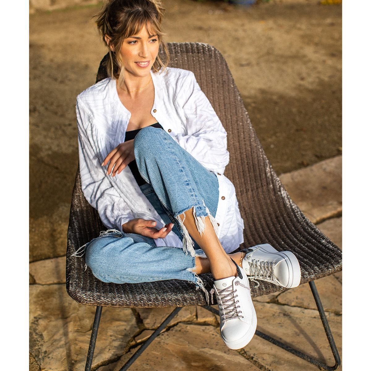 If you want to add just a little sparkle to your classic tennies (tennis shoes), we adore the EVALIA sneakers with a rhinestone bedazzled heel tab and to-die-for rhinestone covered shoe laces. These are too cute to play around with so we recommened lacing them to your desired fit and slipping them on and off for casual wear.