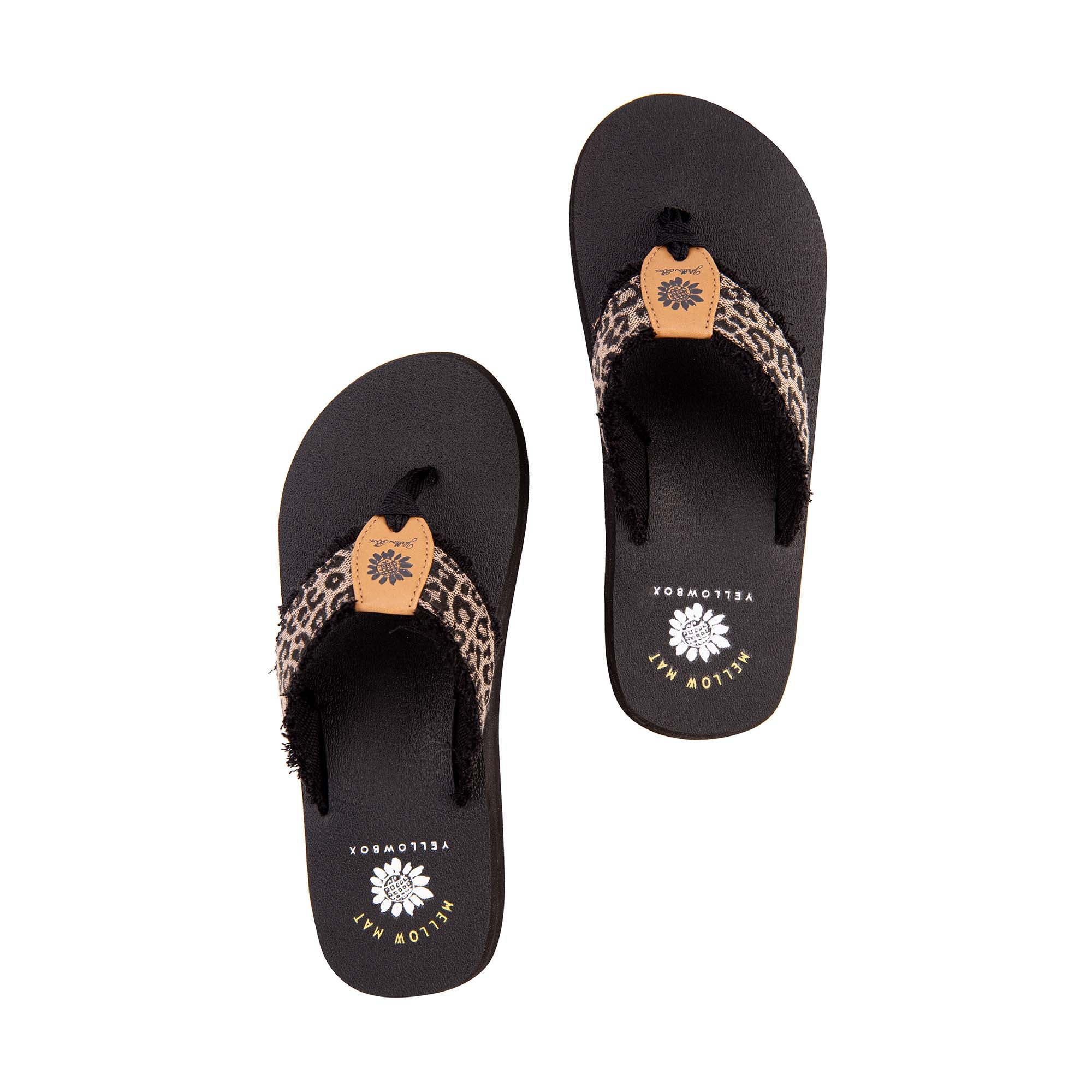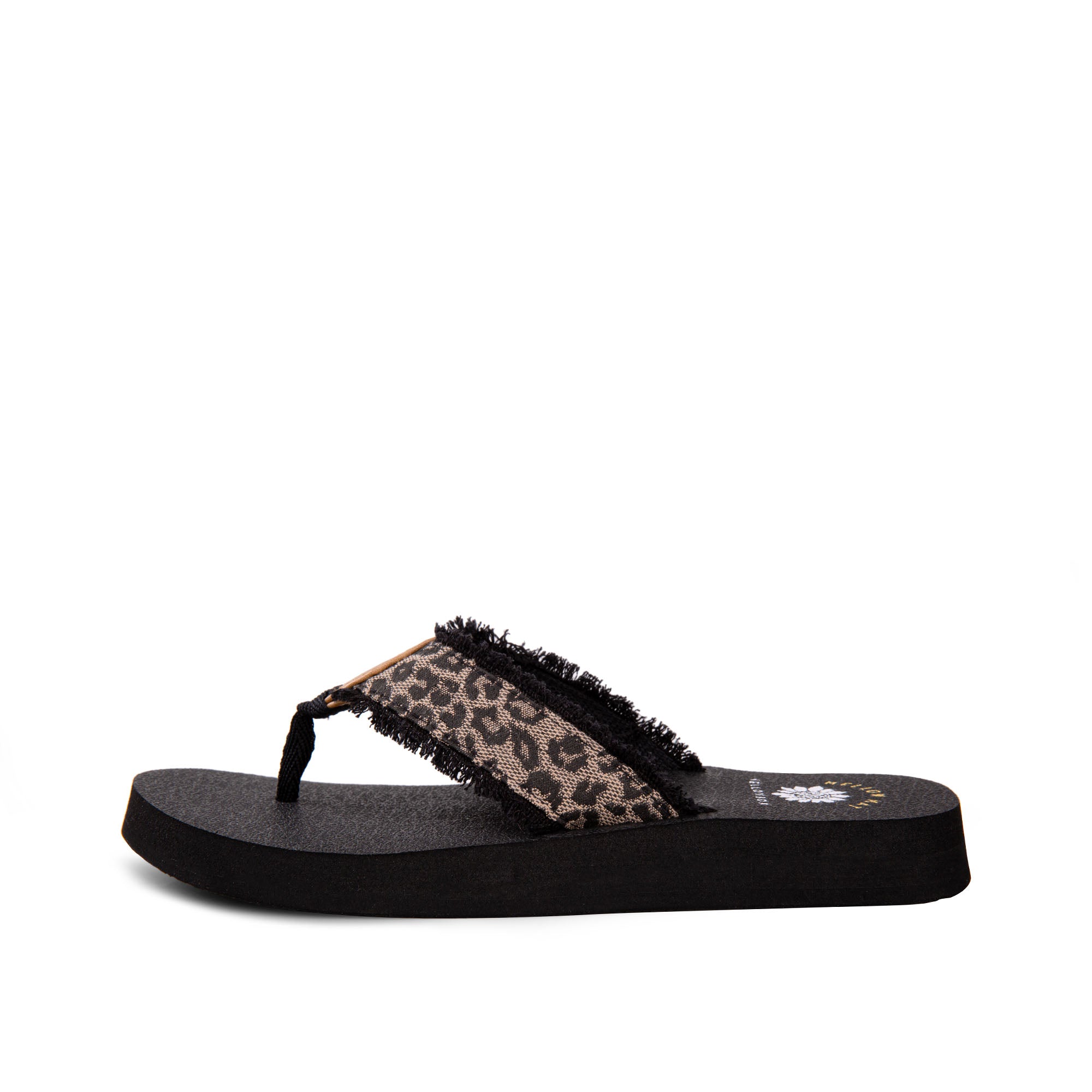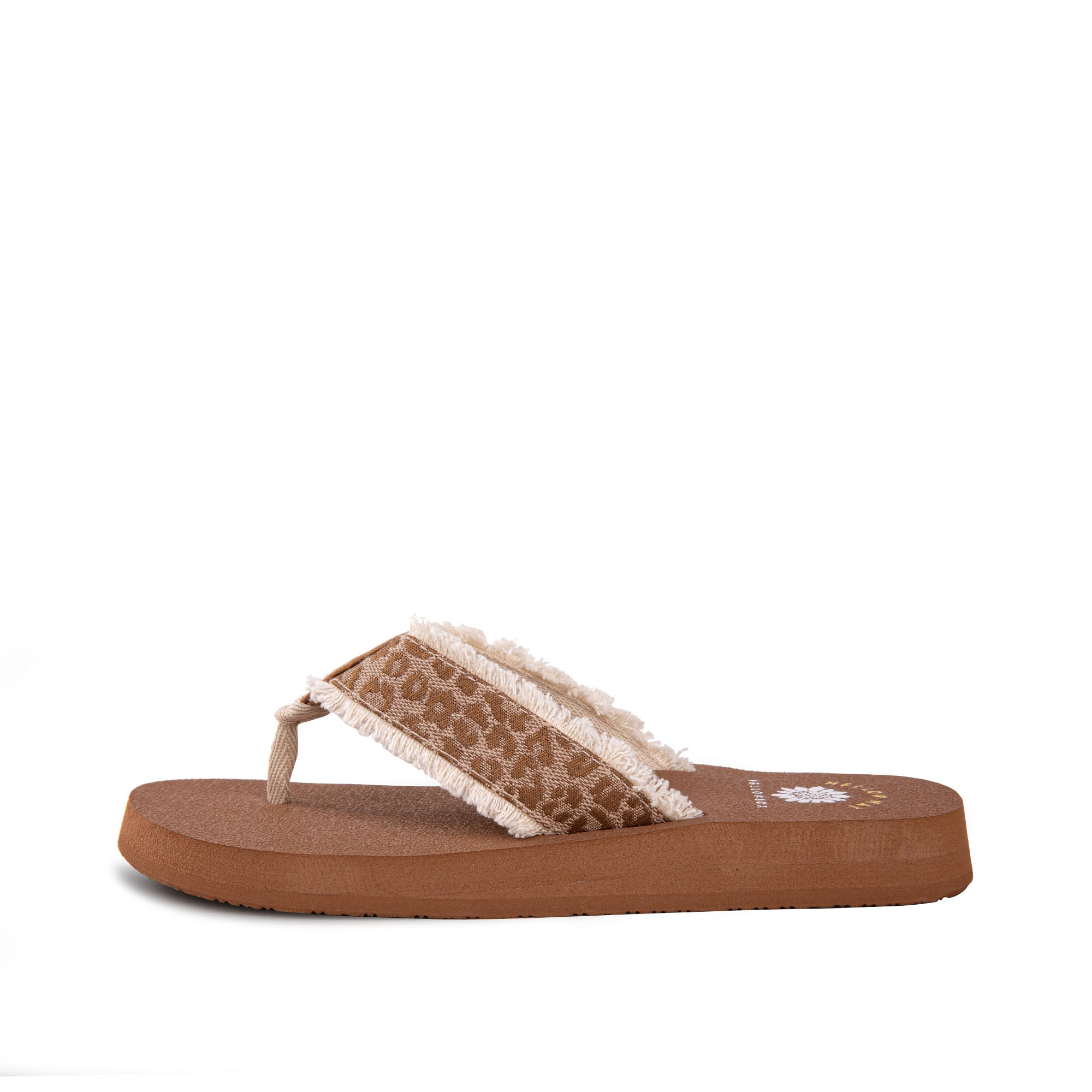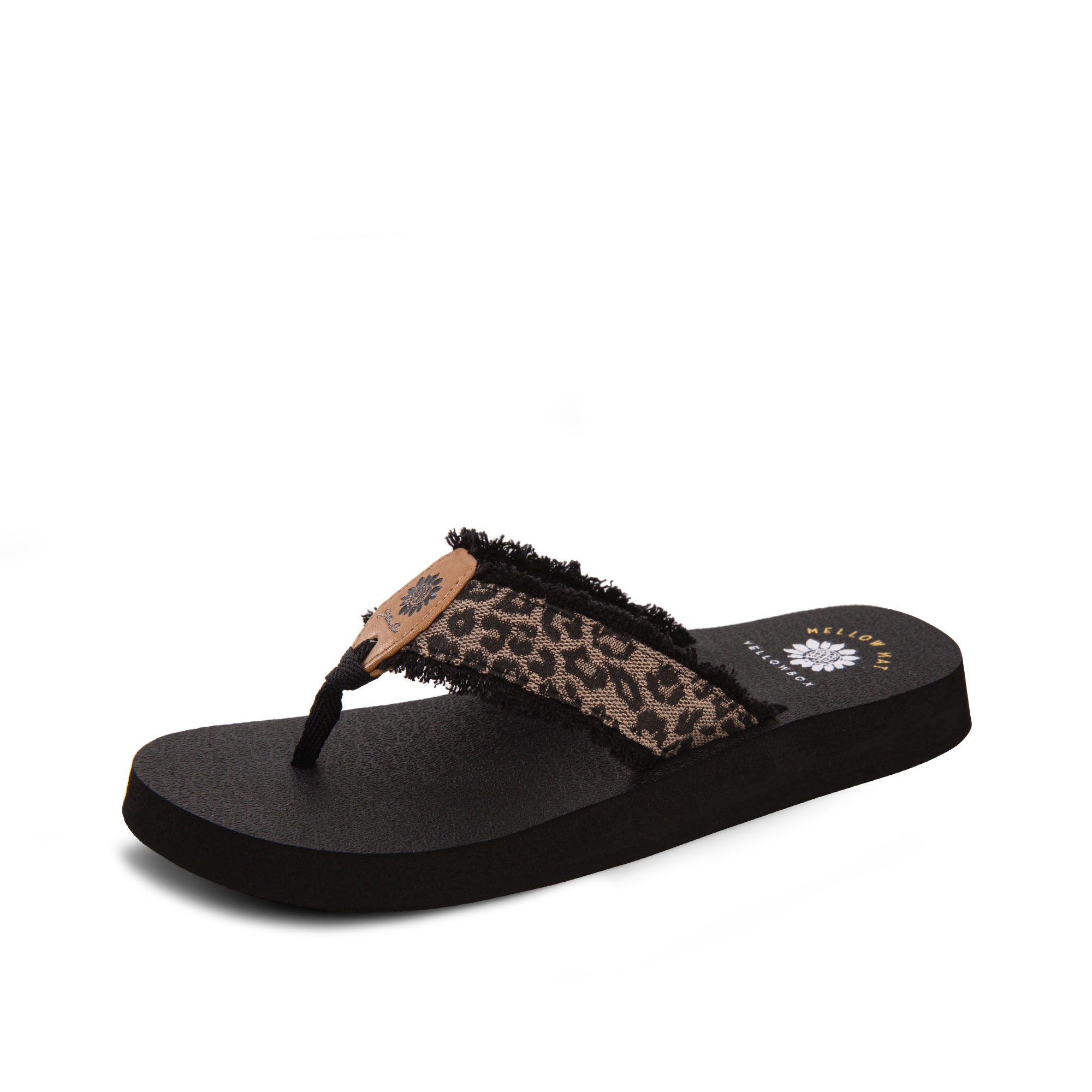 NABHI features leopard print straps with frayed edges and a soft ribbon thong post. This sandal, part of our Mellow Mat™ collection, has a slow rebound footbed and a classic low heel.