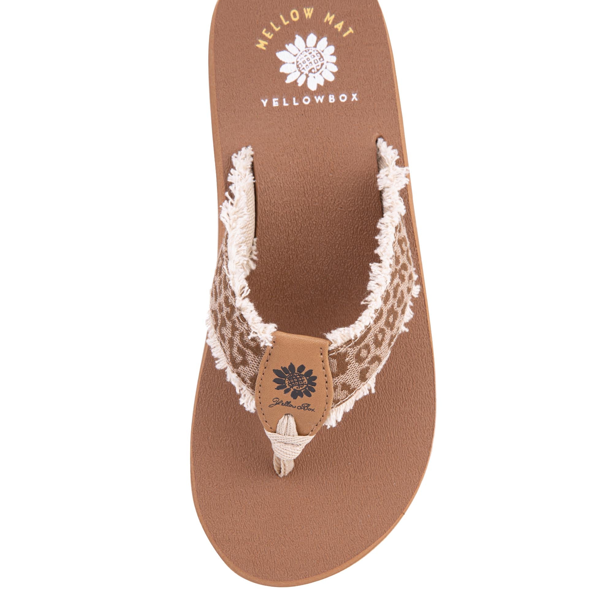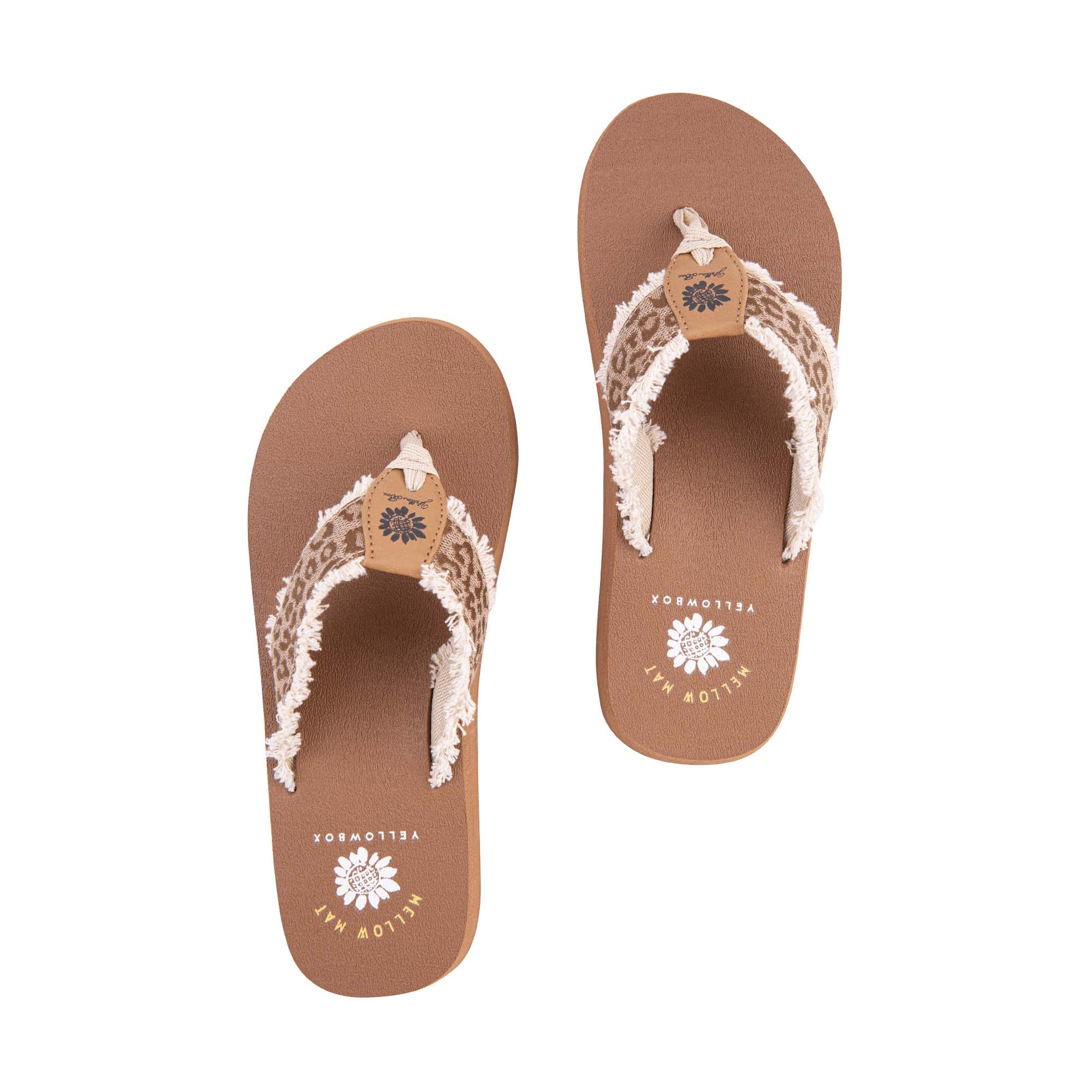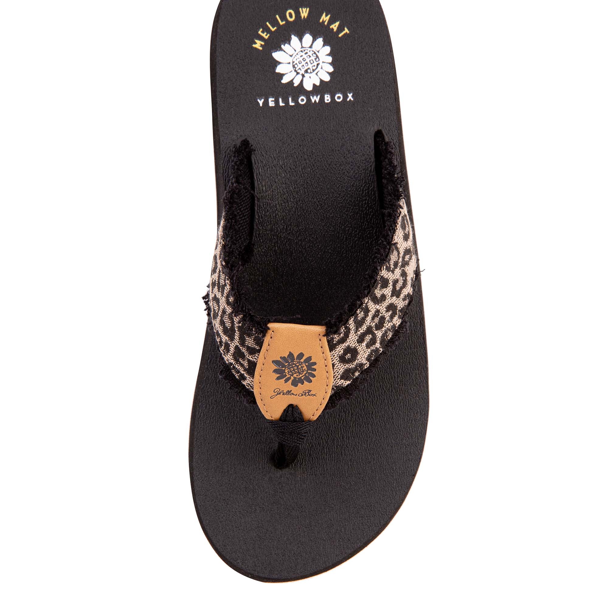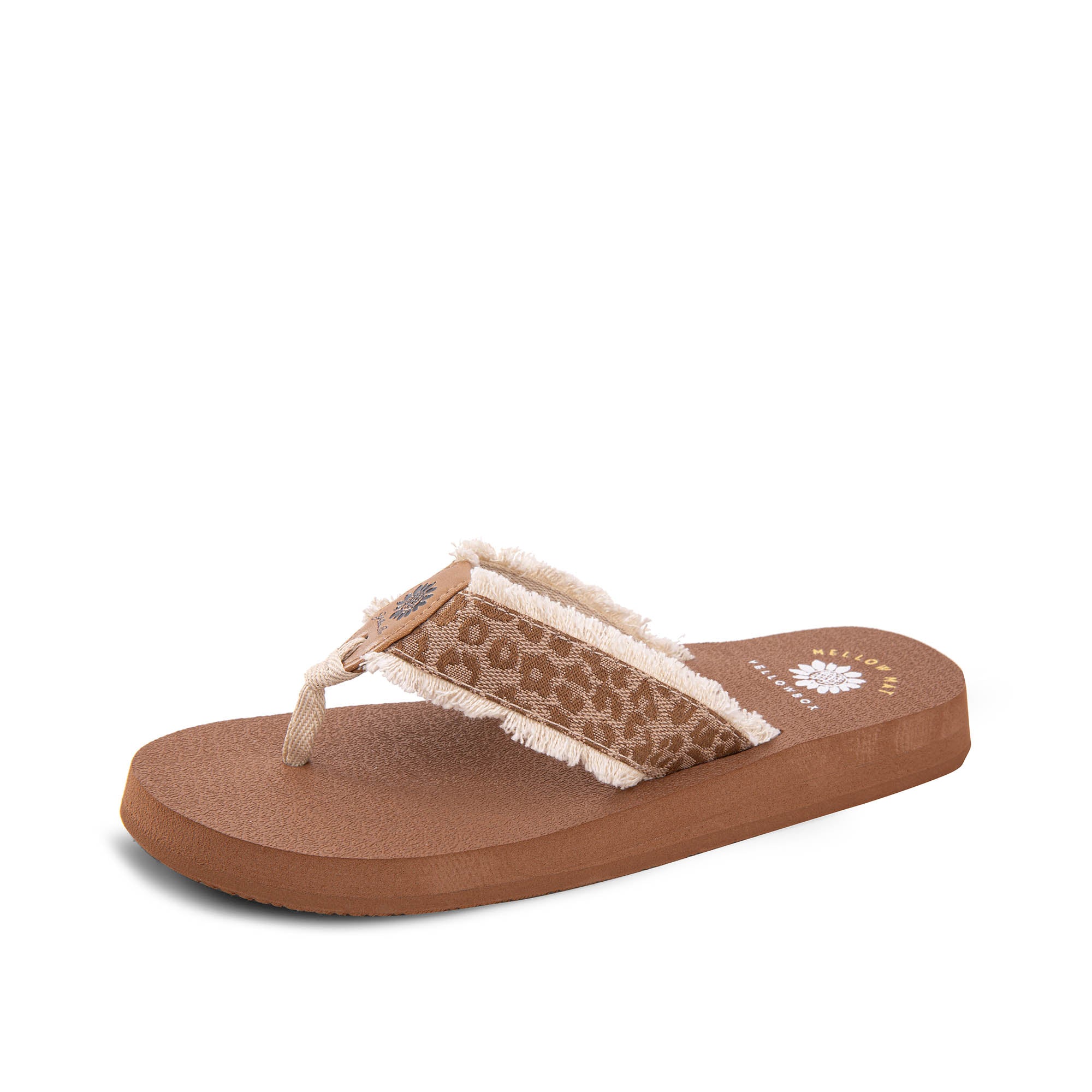 NABHI features leopard print straps with frayed edges and a soft ribbon thong post. This sandal, part of our Mellow Mat™ collection, has a slow rebound footbed and a classic low heel.