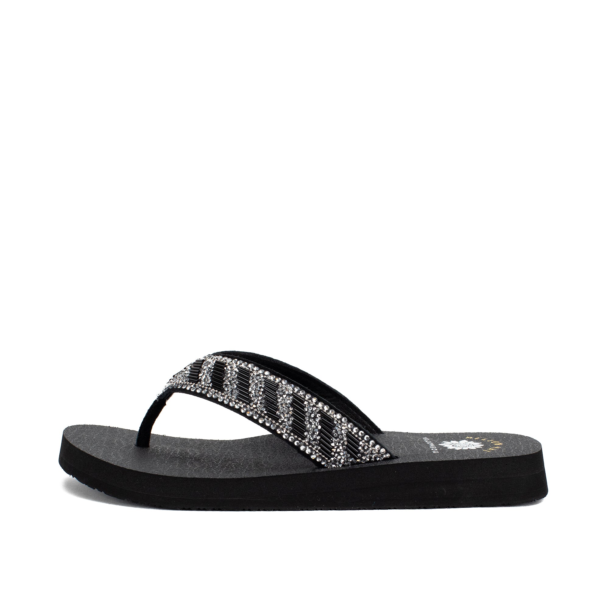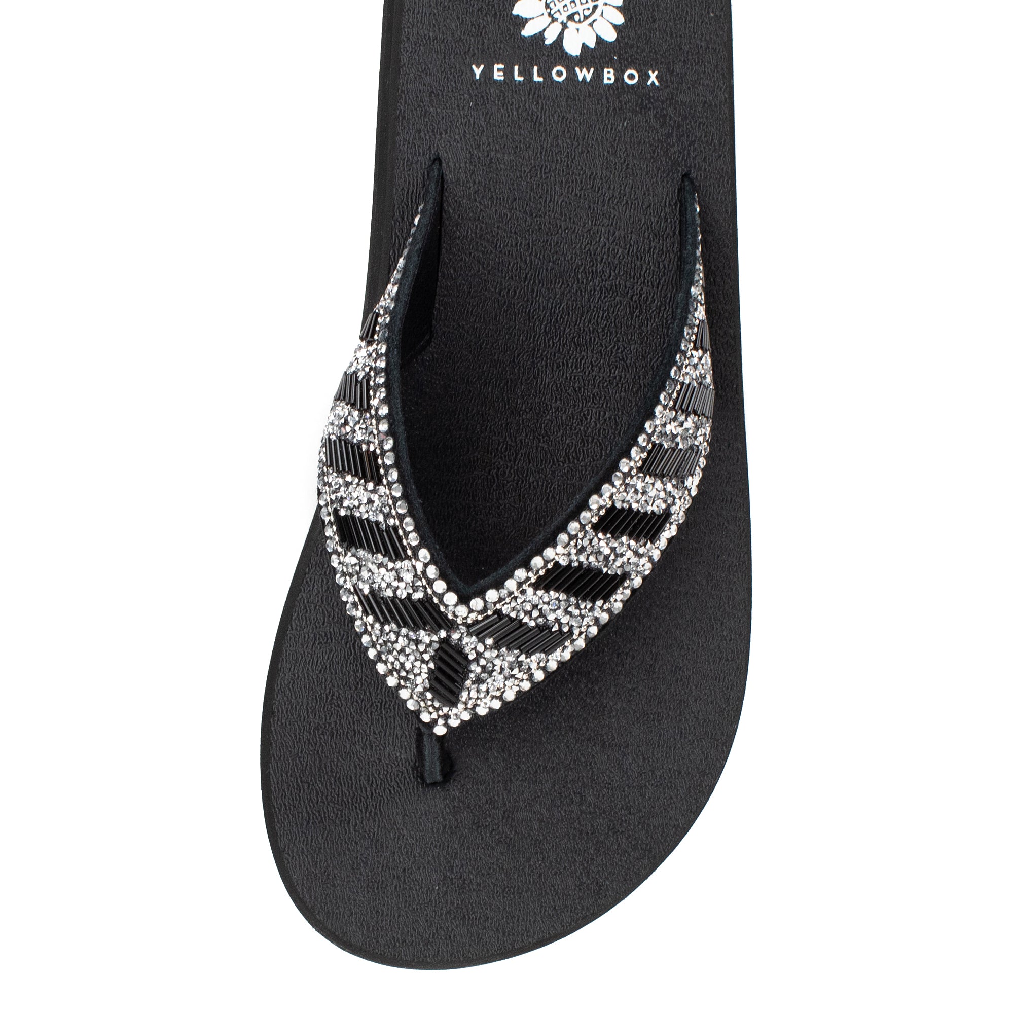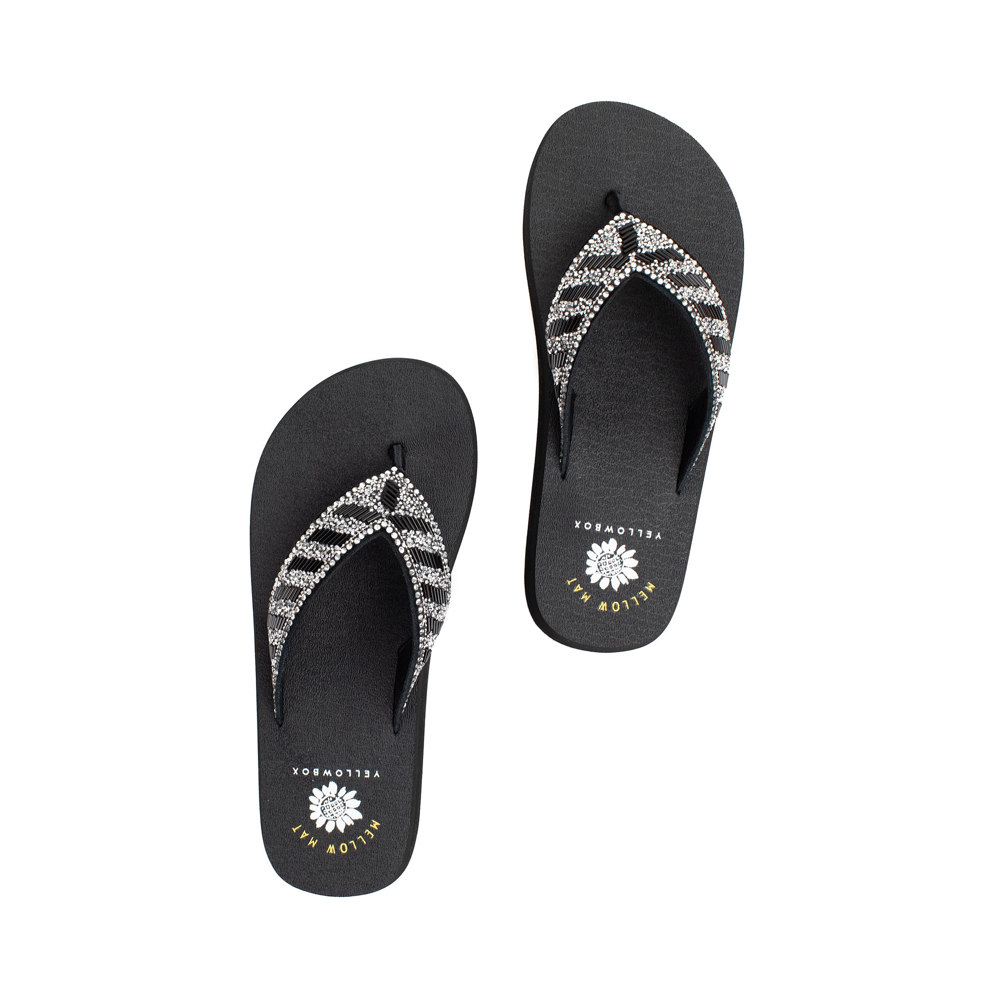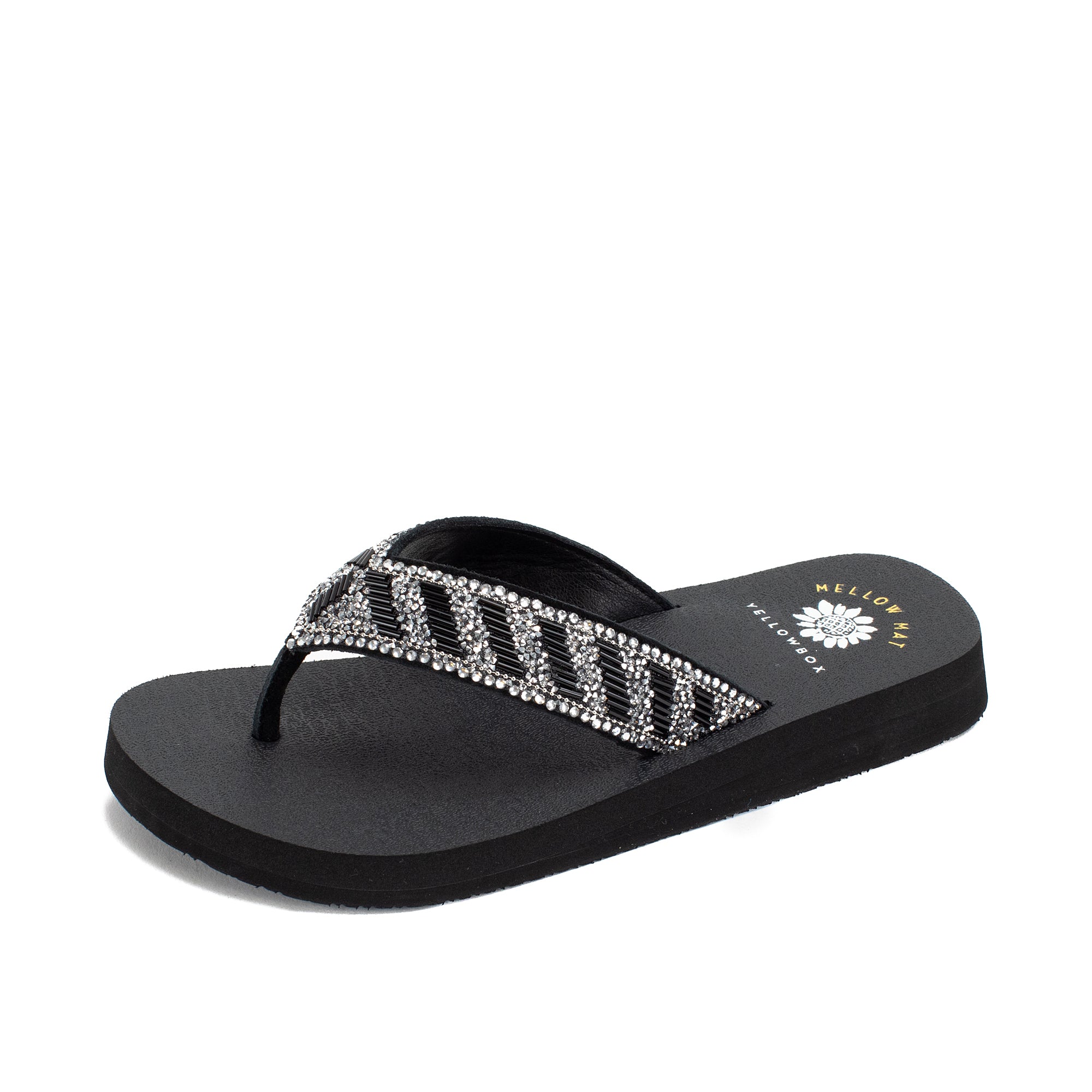 Our NORMAN flip-flops shine with a bold striped design of metallic bugle beads and glittering rhinestone straps. This sandal bottom from our Mellow Mat™ collection features a slow rebound footbed in a classic low heel.