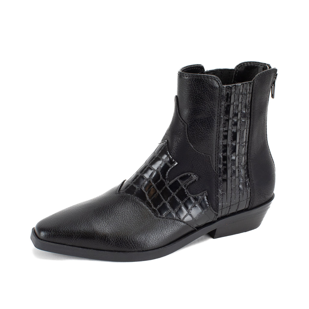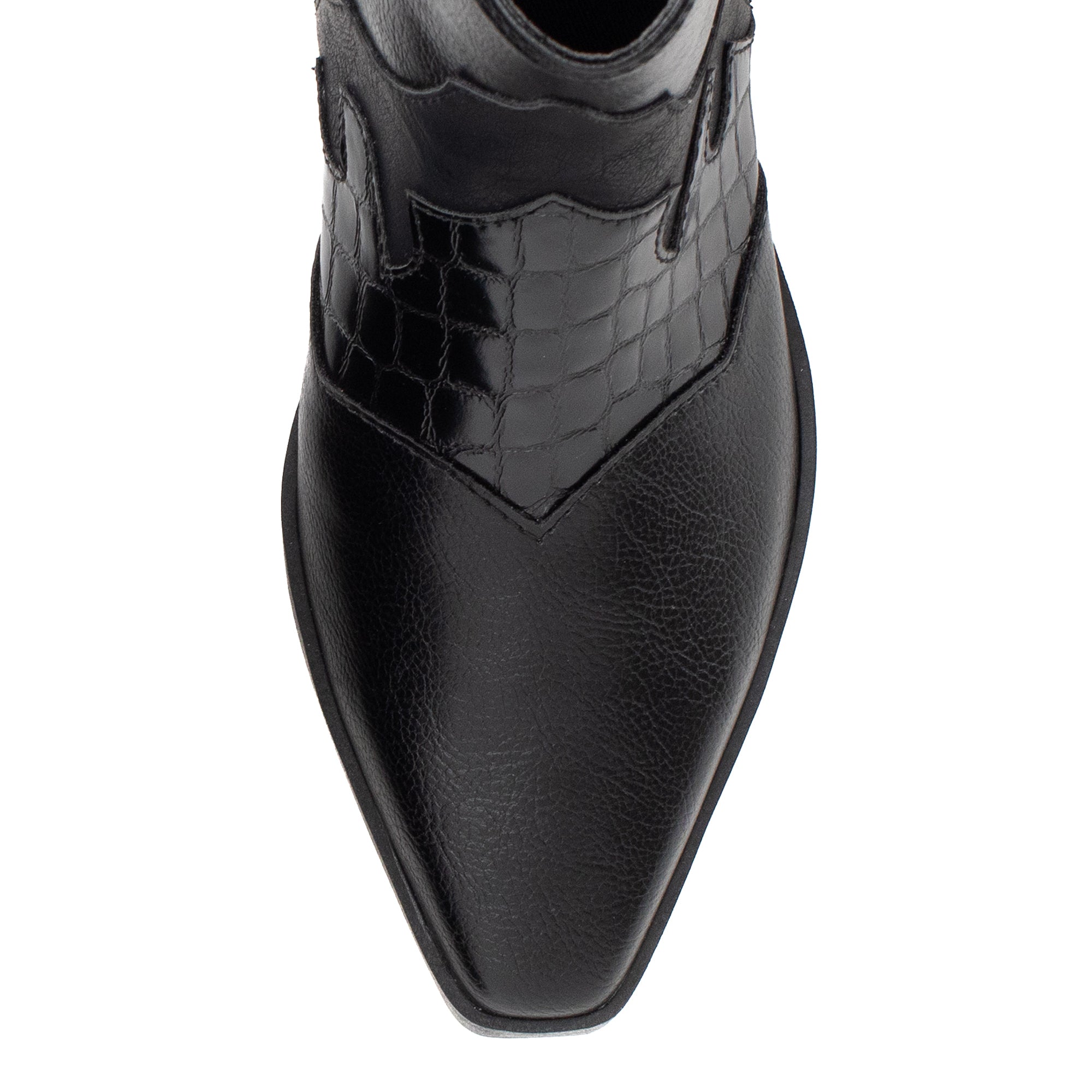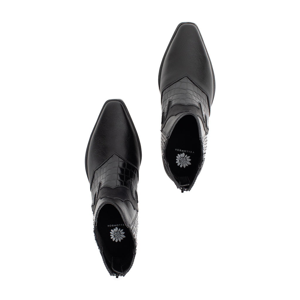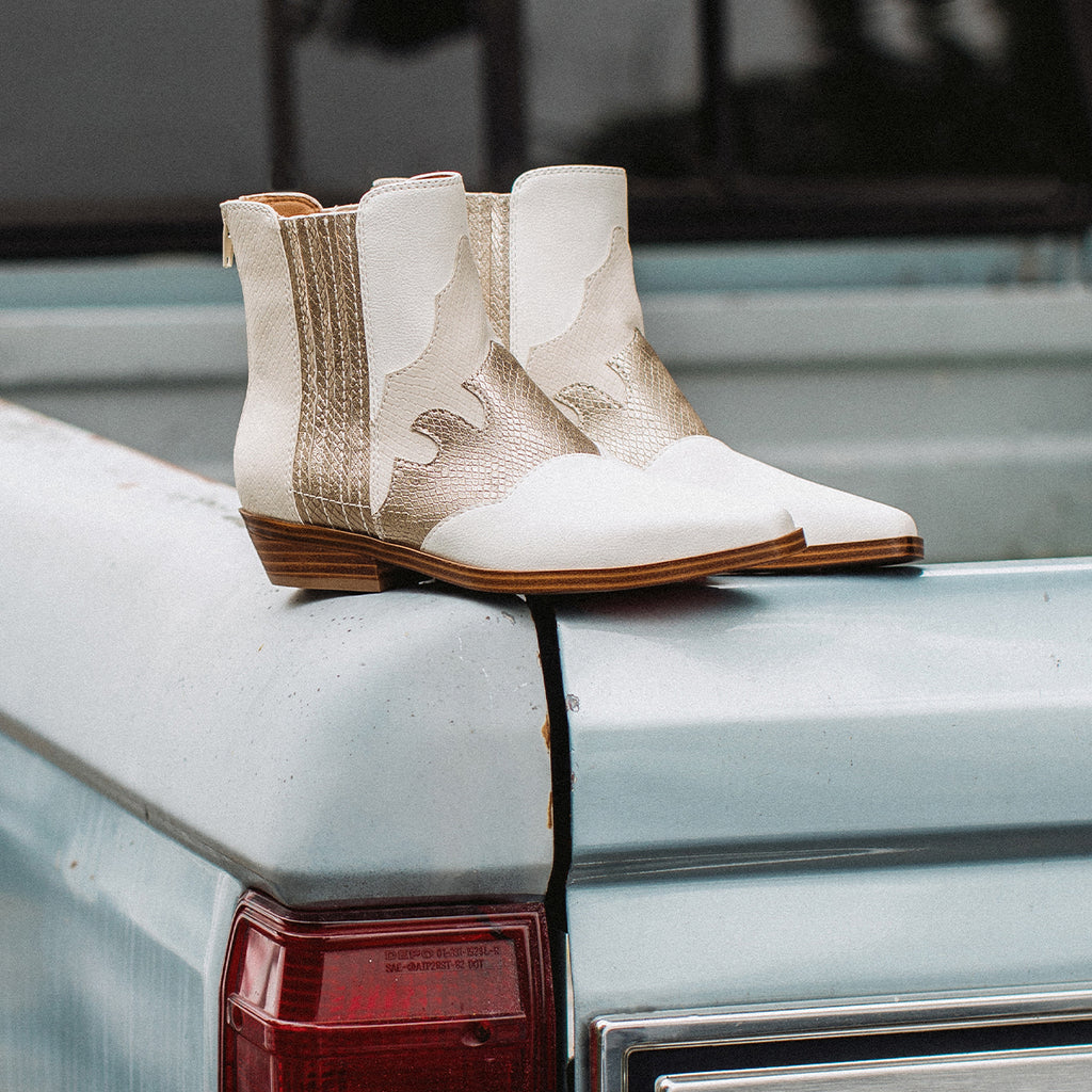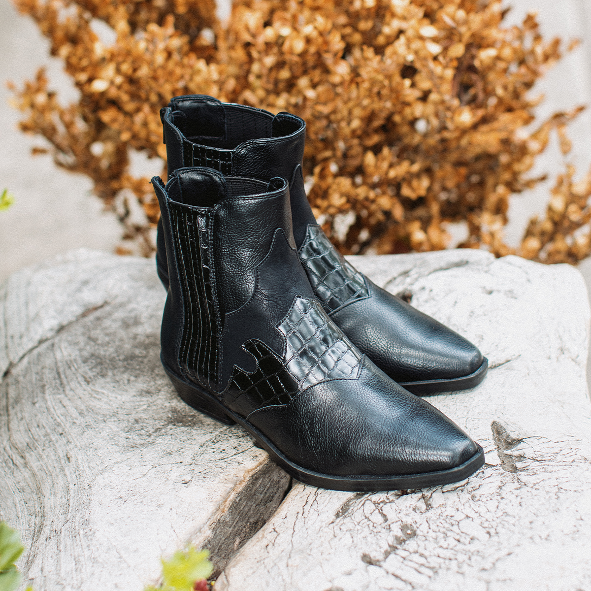 Wear these to the rodeo or to the mall, the WILLIS western booties will keep you on-trend and comfortable all year round. This playful design features a low block heel, a pointed snip toe design, with a mix of exotic croco and snake faux leathers that embody the hottest wild west trend of the season.