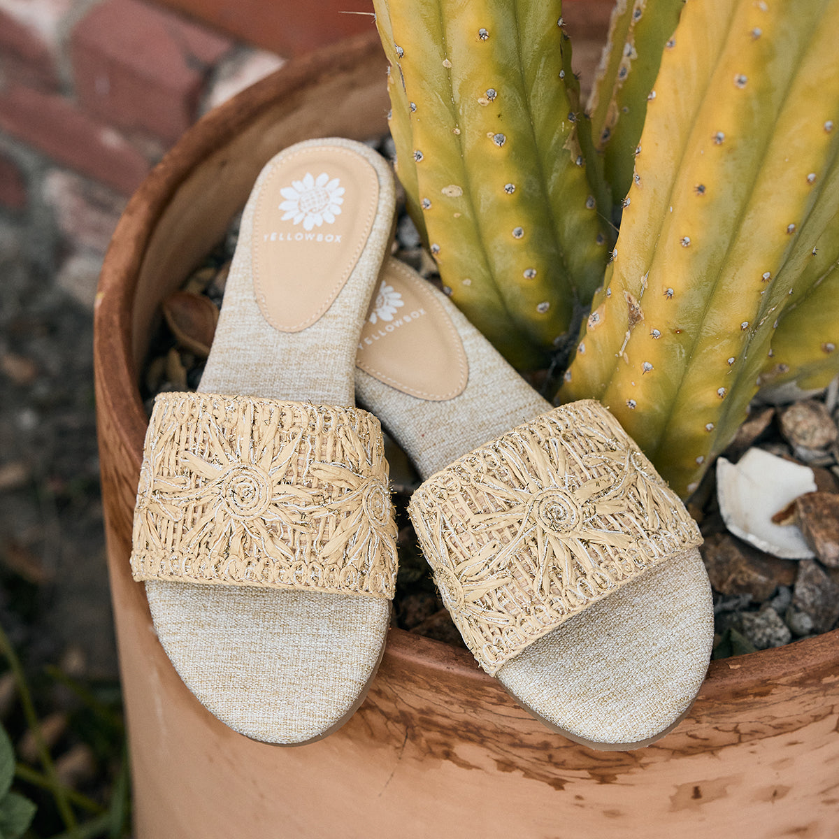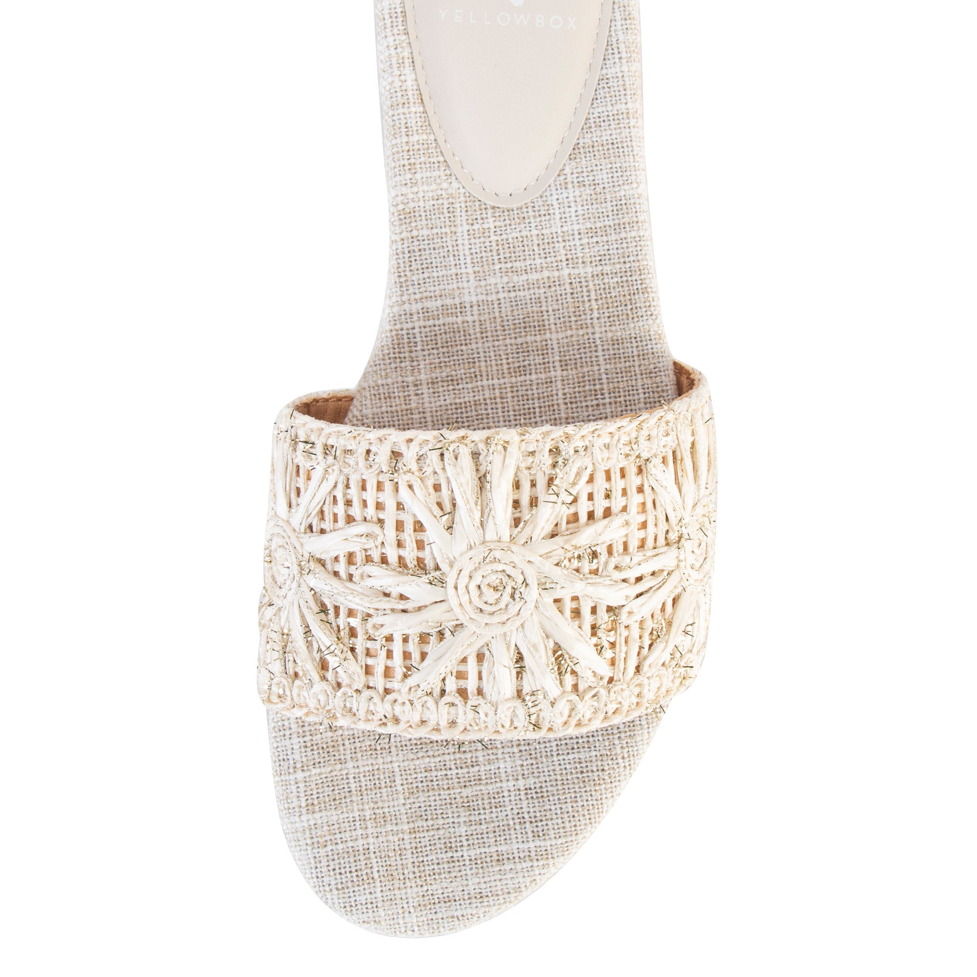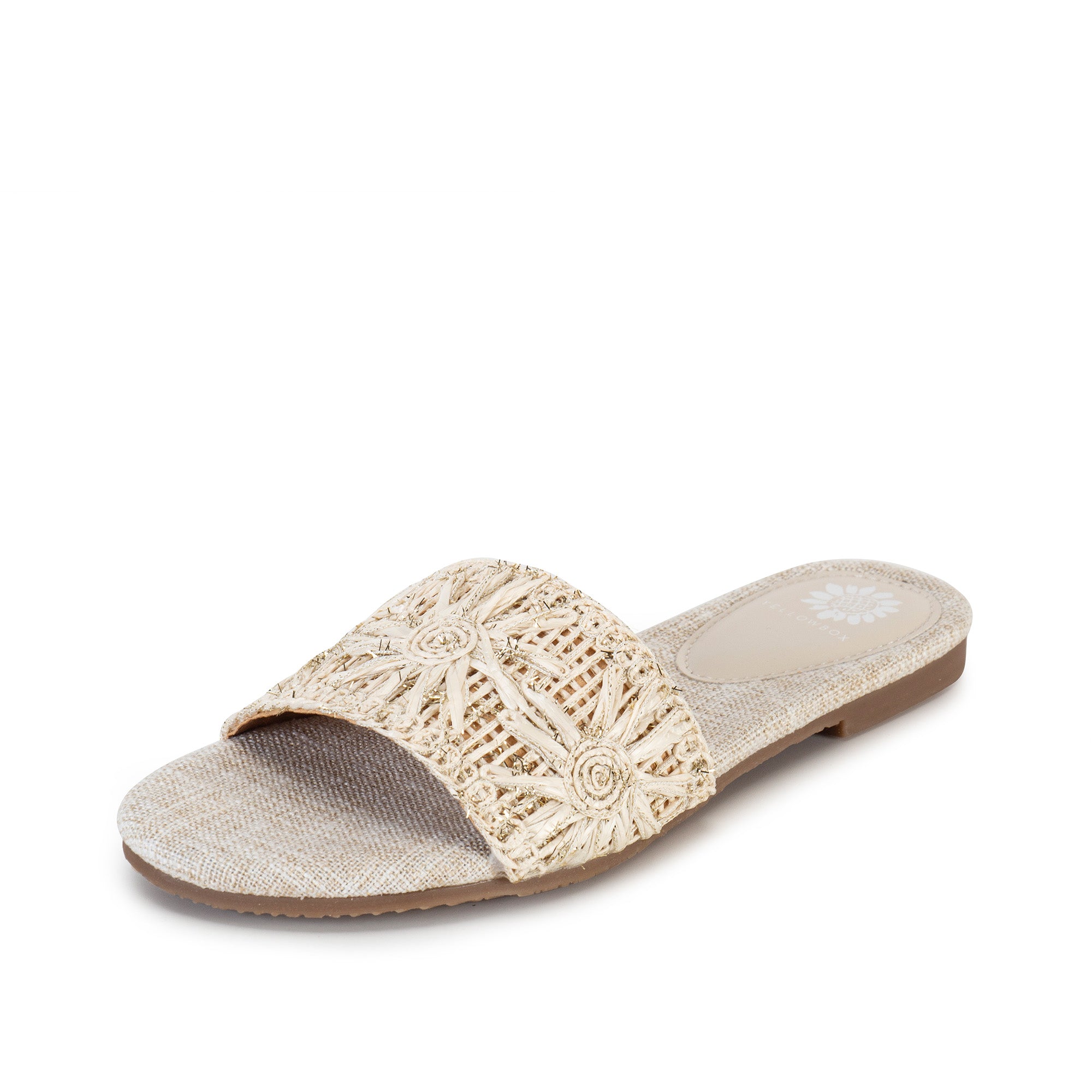 Indulge in summer's #1 texture with HARUKA. This elegant one-band slide features metallic-flecked raffia adorned with spiral sun patterns that add easy dimension and depth, finished with a Signature Yellow Box High Rebound EVA wrapped insole.