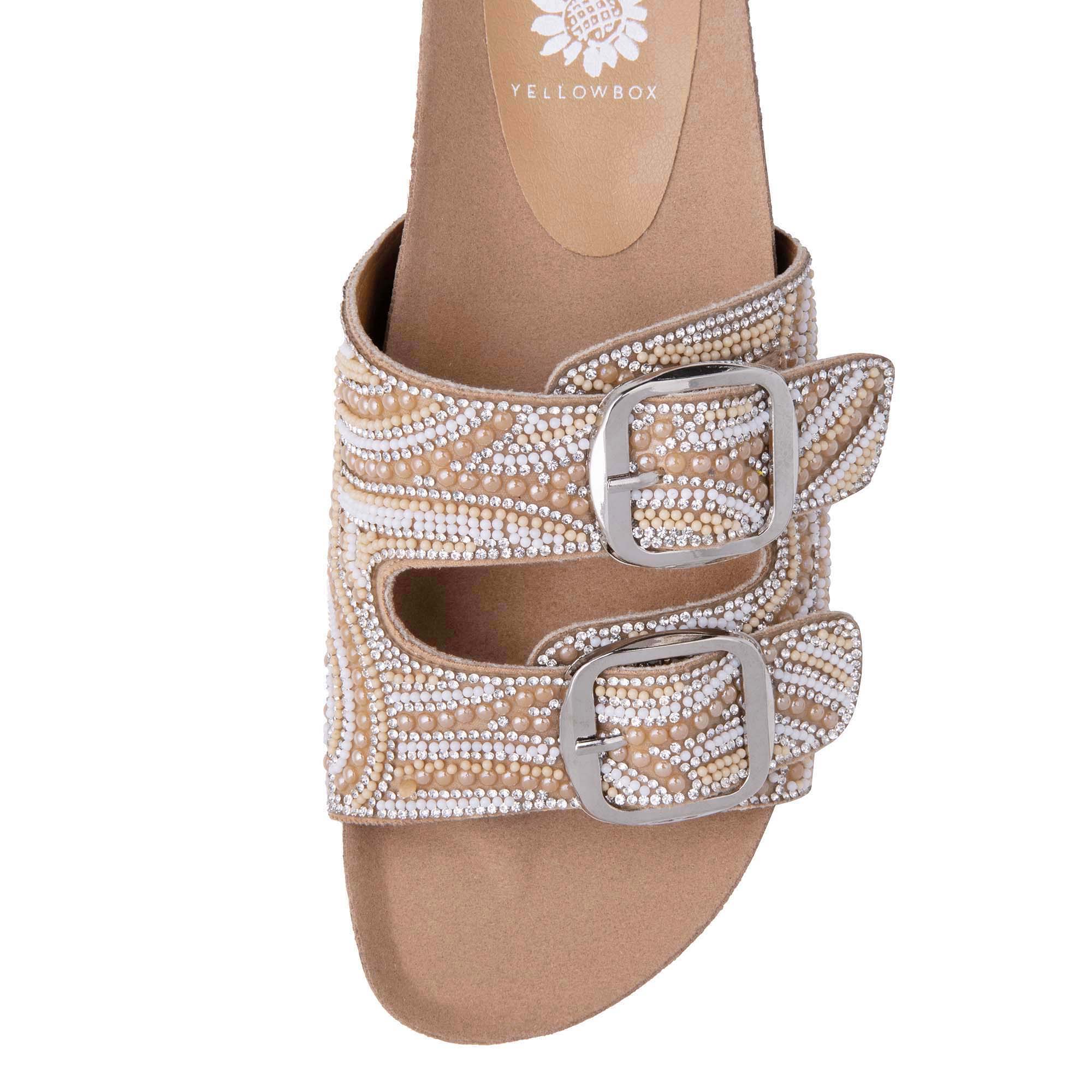 The HASINA bedazzled slide sandal is designed with a molded footbed and double buckle accents for a secure and comfortable fit that's easy to wear. Perfect for days on the go!