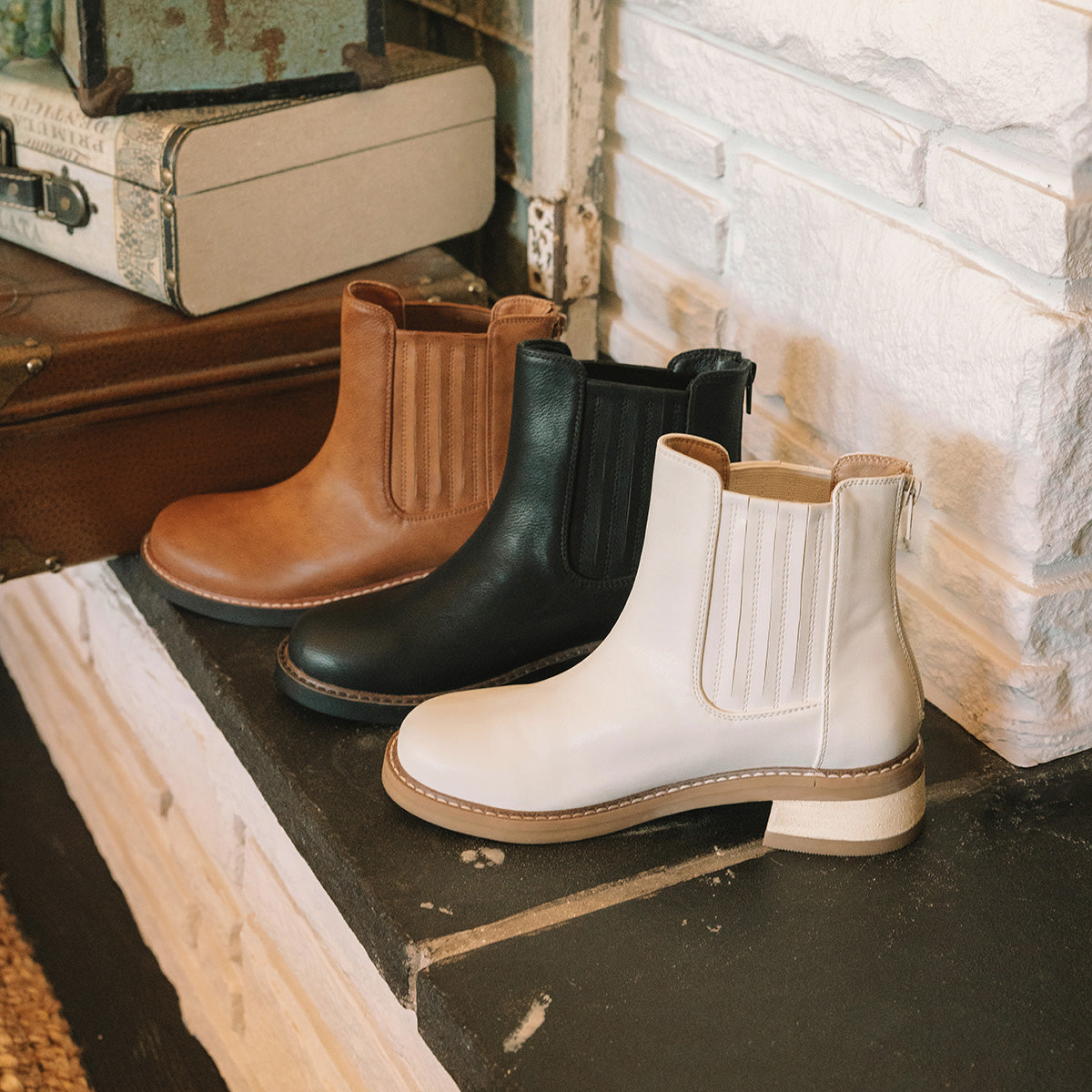 CLYDE is a tailored Chelsea Boot with a classic pull-on look and a back zipper that allows easy on and off for quick wardrobe changes, finished with a trendy low heel with all the comfort and support you expect from our Signature Yellow Box EVA.
