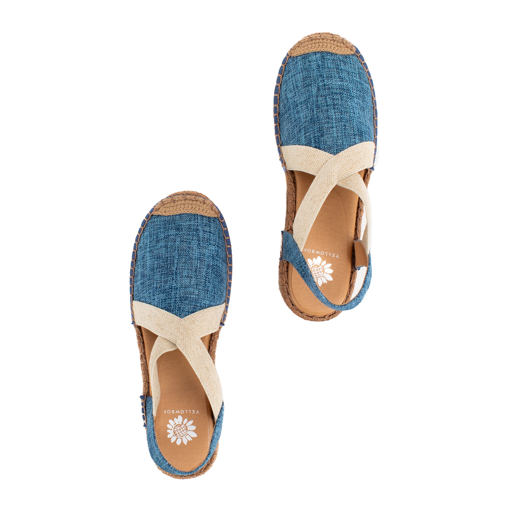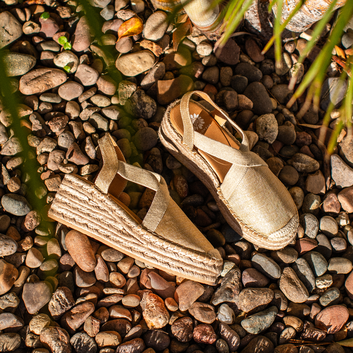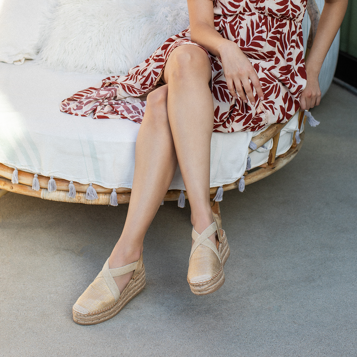 Meet ERICA, a slip-on espadrille sandal designed with shimmering denim and canvas. It comes with elasticized straps for an easy slip-on fit, making it a perfect match for all your warm-weather looks.