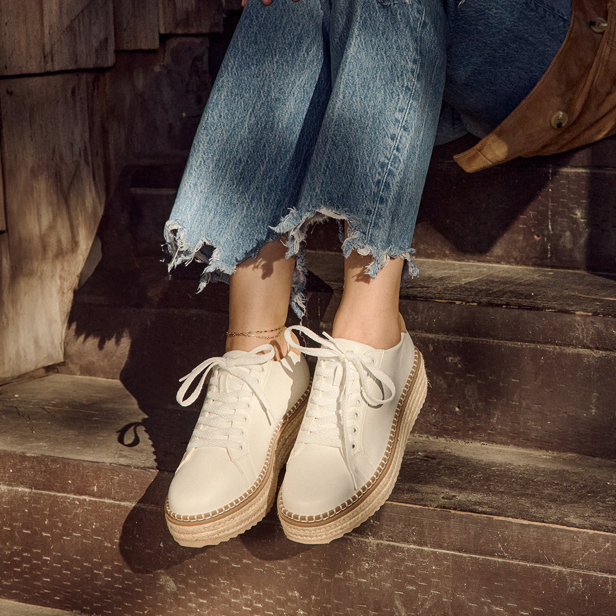 Our MISTY espadrille sneakers are a must-have for any warm-weather collection. With a classic lace-up design, artisanal handcrafted details, and a versatile jute-wrapped flatform sole, MISTY is the perfect go-to for casual outings.