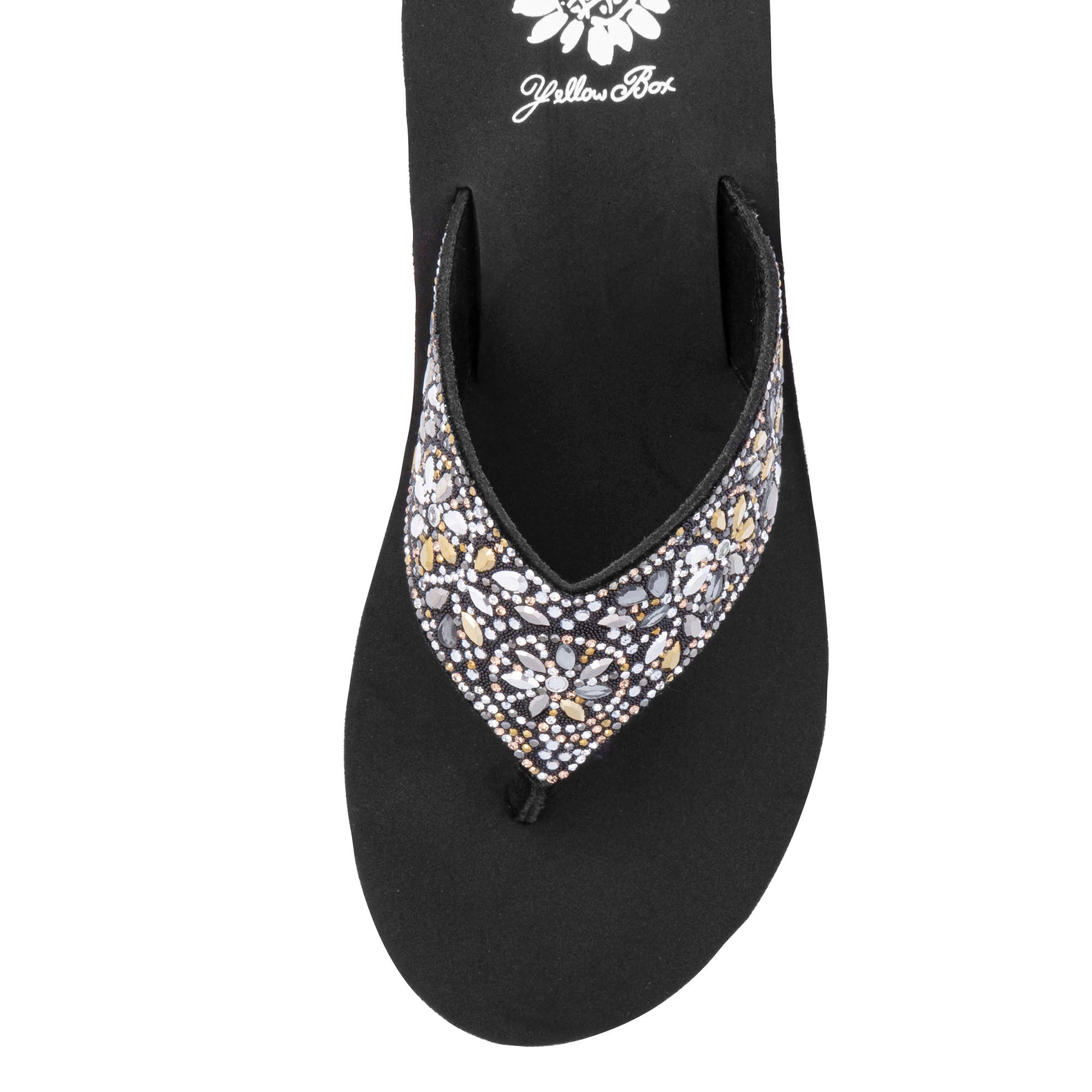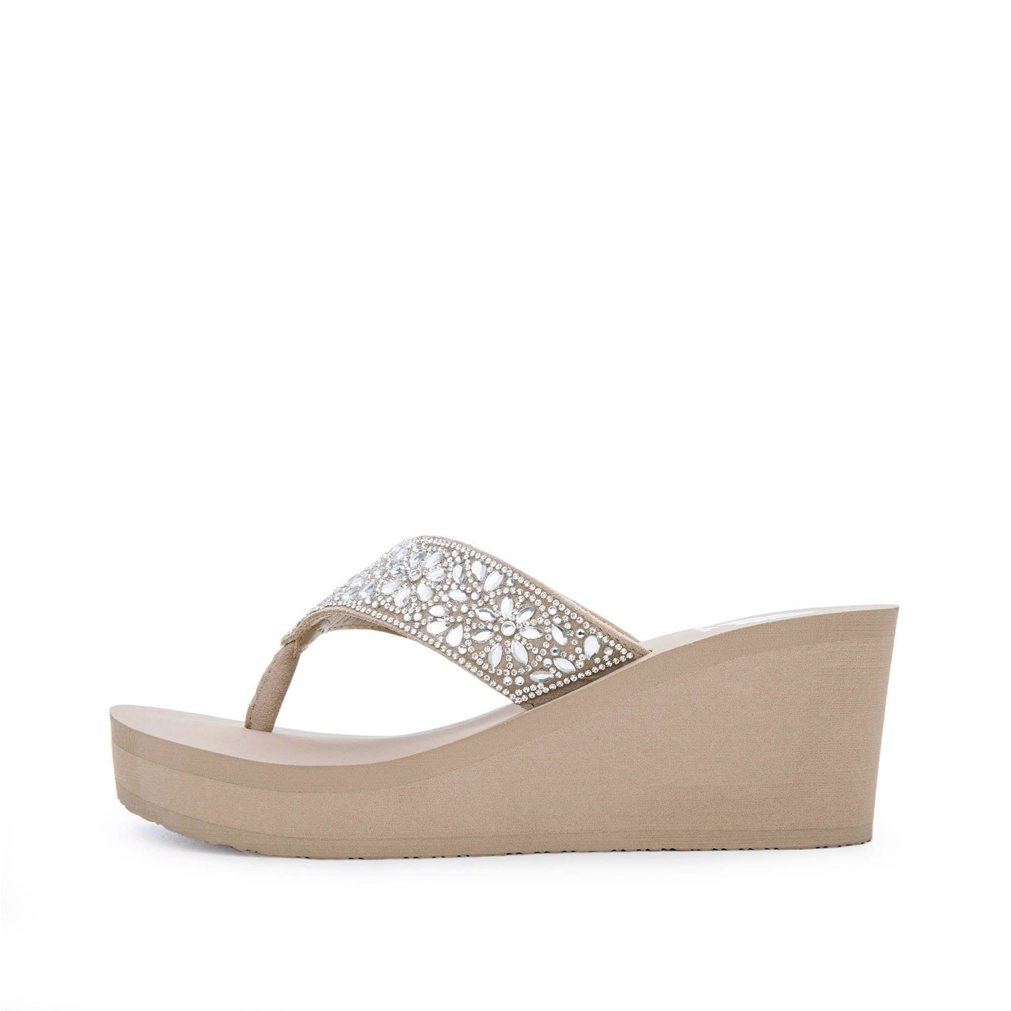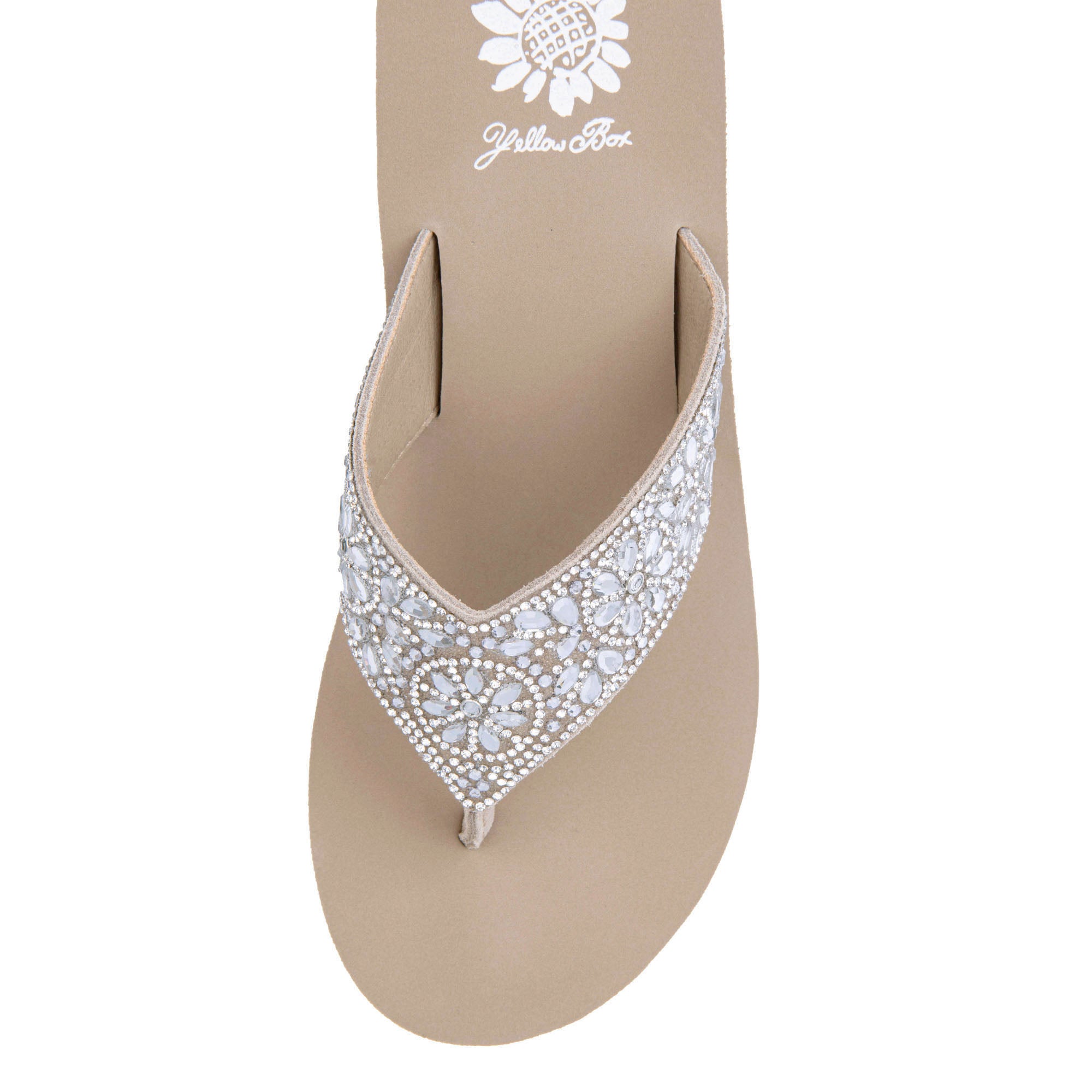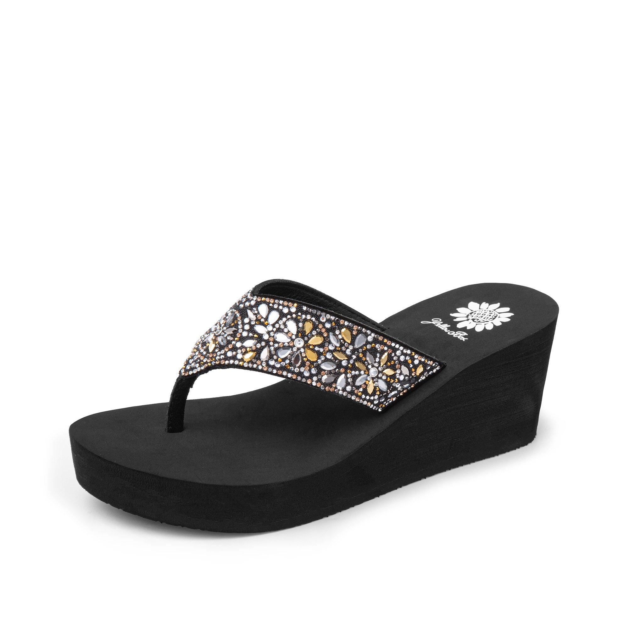 The ENOLA wedge sandal features sparkling rhinestones in an adorable, floral pattern. The wide leather straps, secure thong post, and Signature Yellow Box EVA insole make ENOLA the comfiest wedges to strut in.