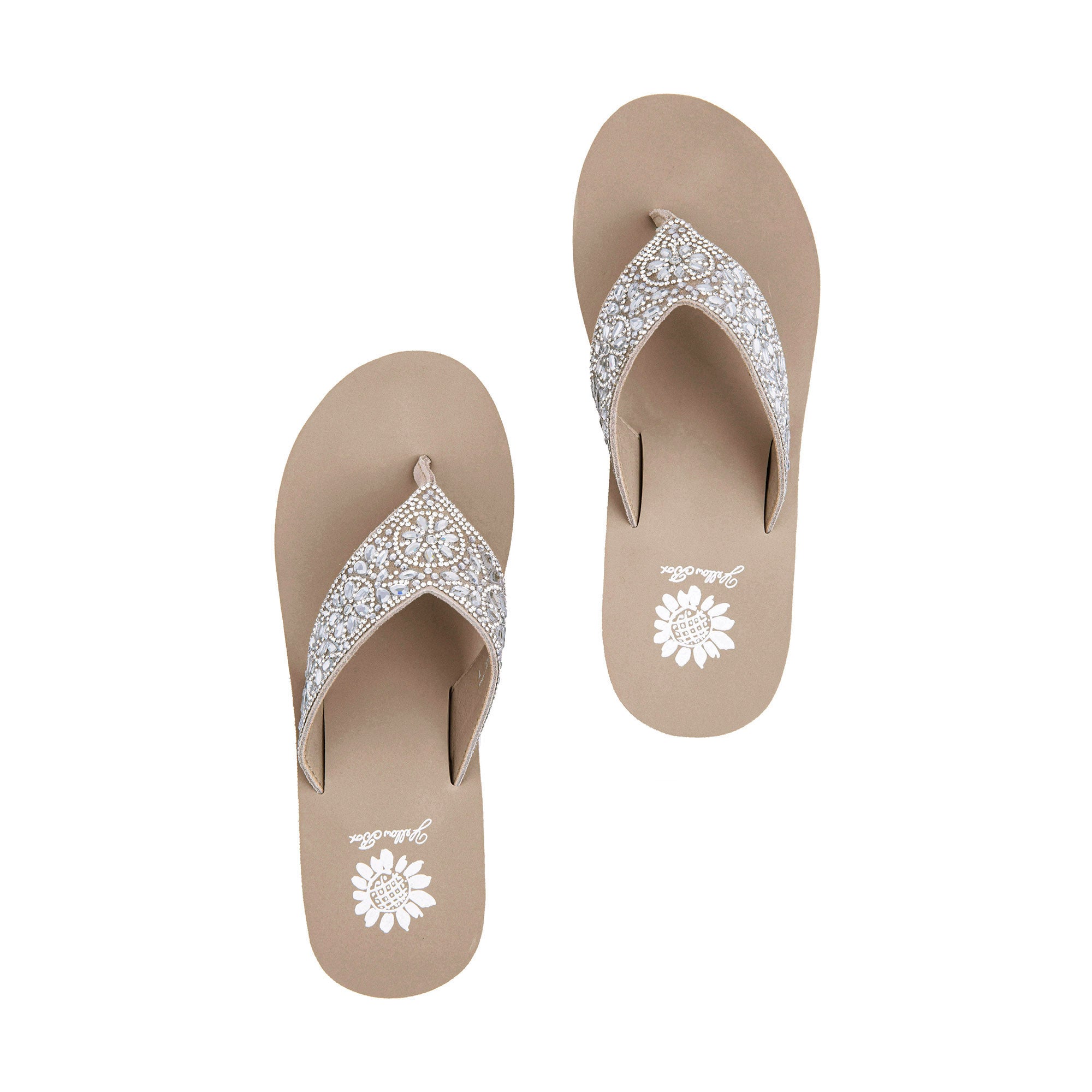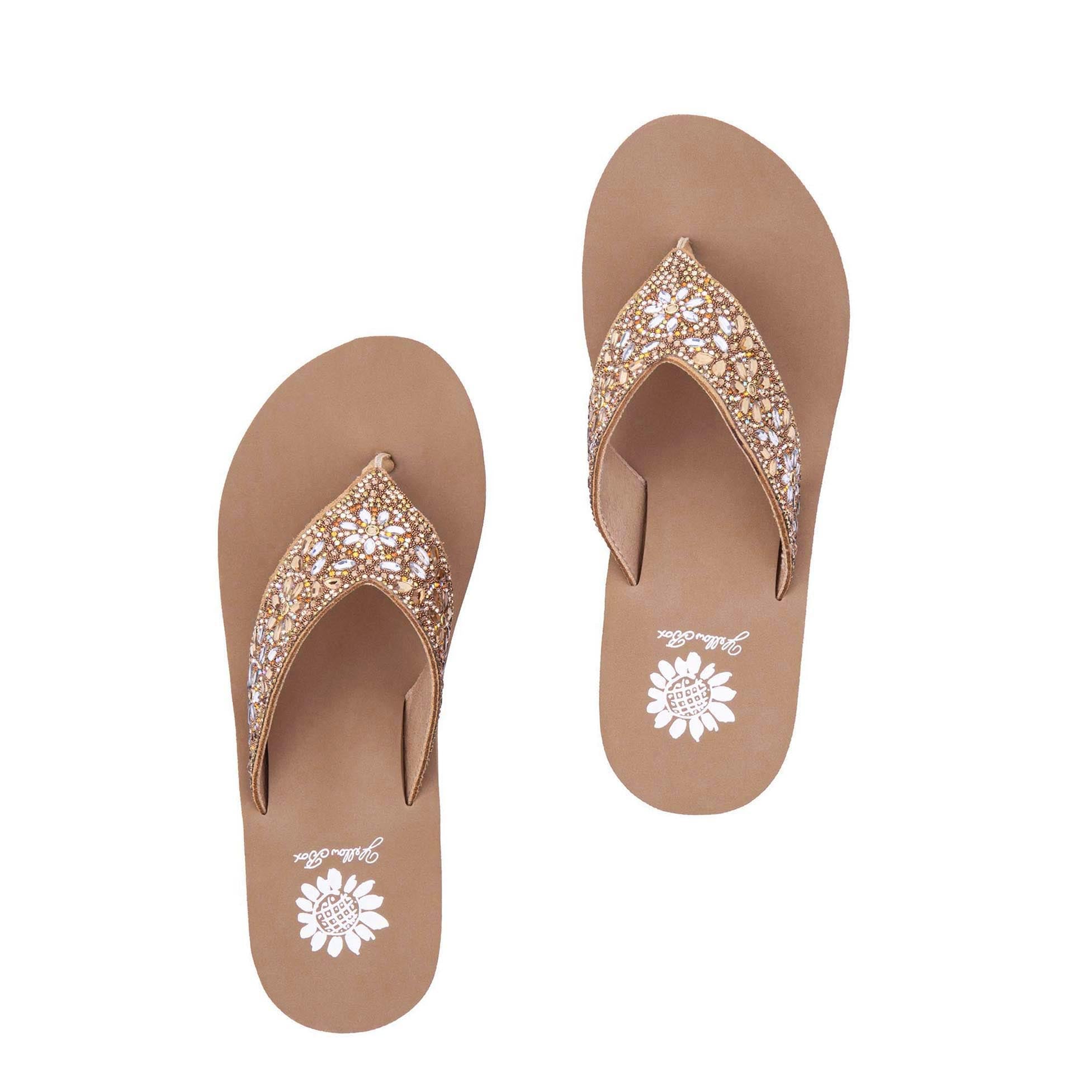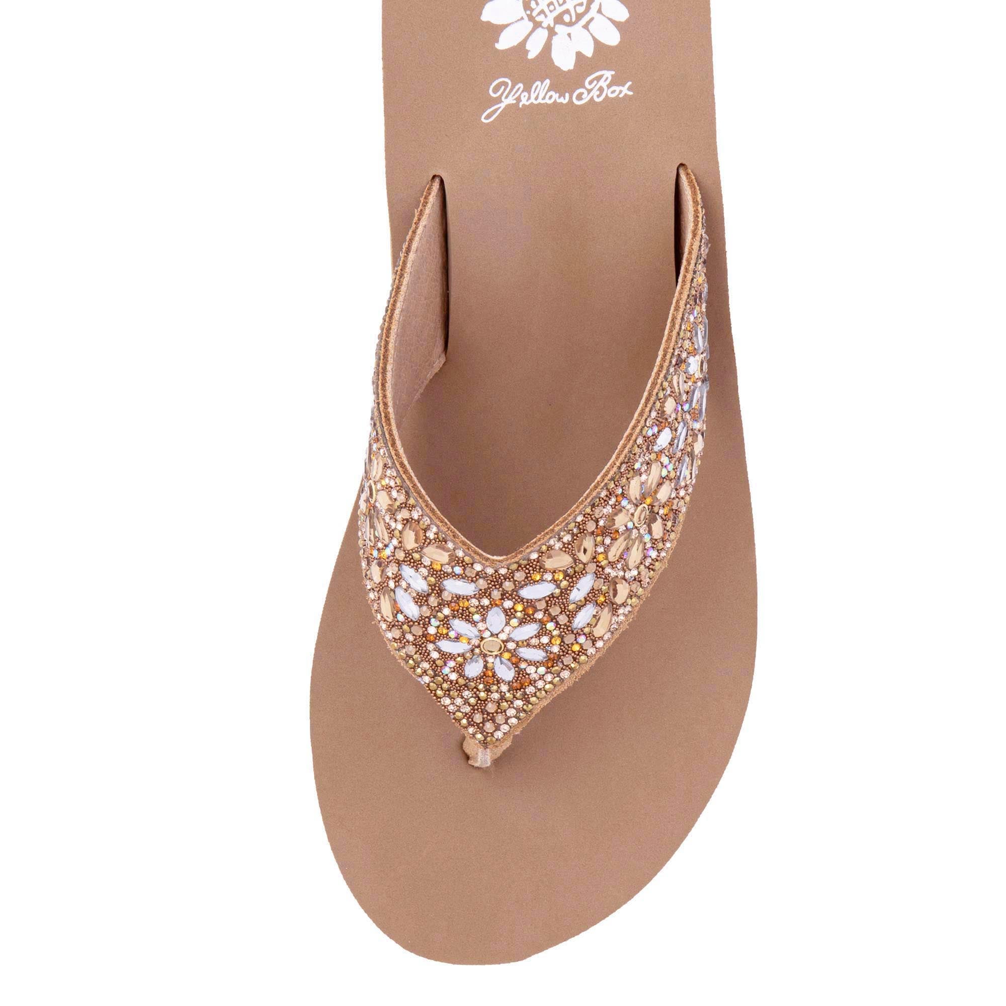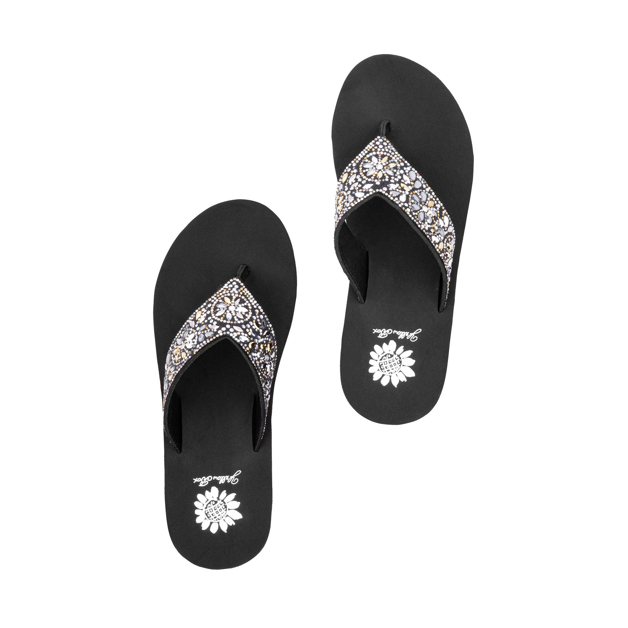 The ENOLA wedge sandal features sparkling rhinestones in an adorable, floral pattern. The wide leather straps, secure thong post, and Signature Yellow Box EVA insole make ENOLA the comfiest wedges to strut in.
