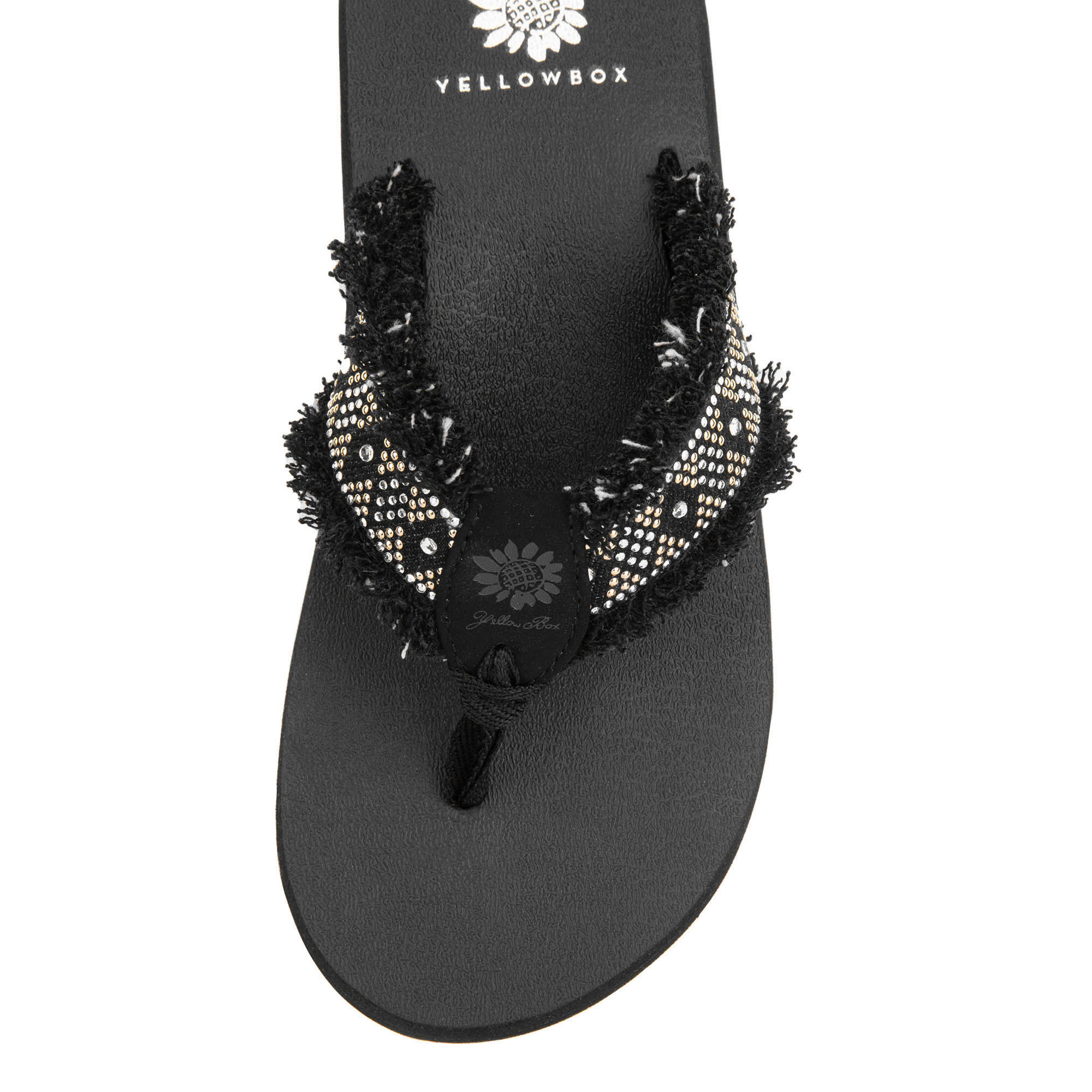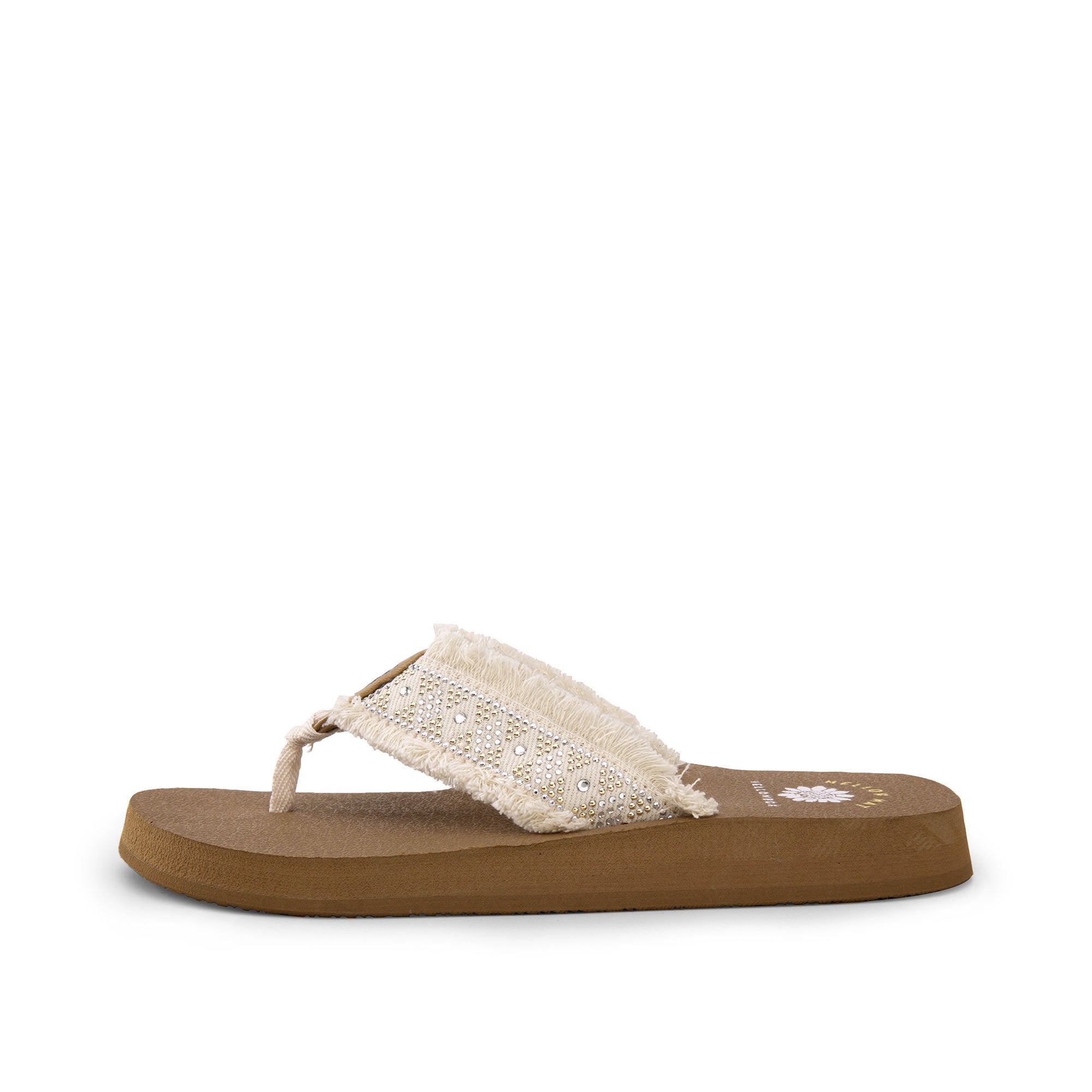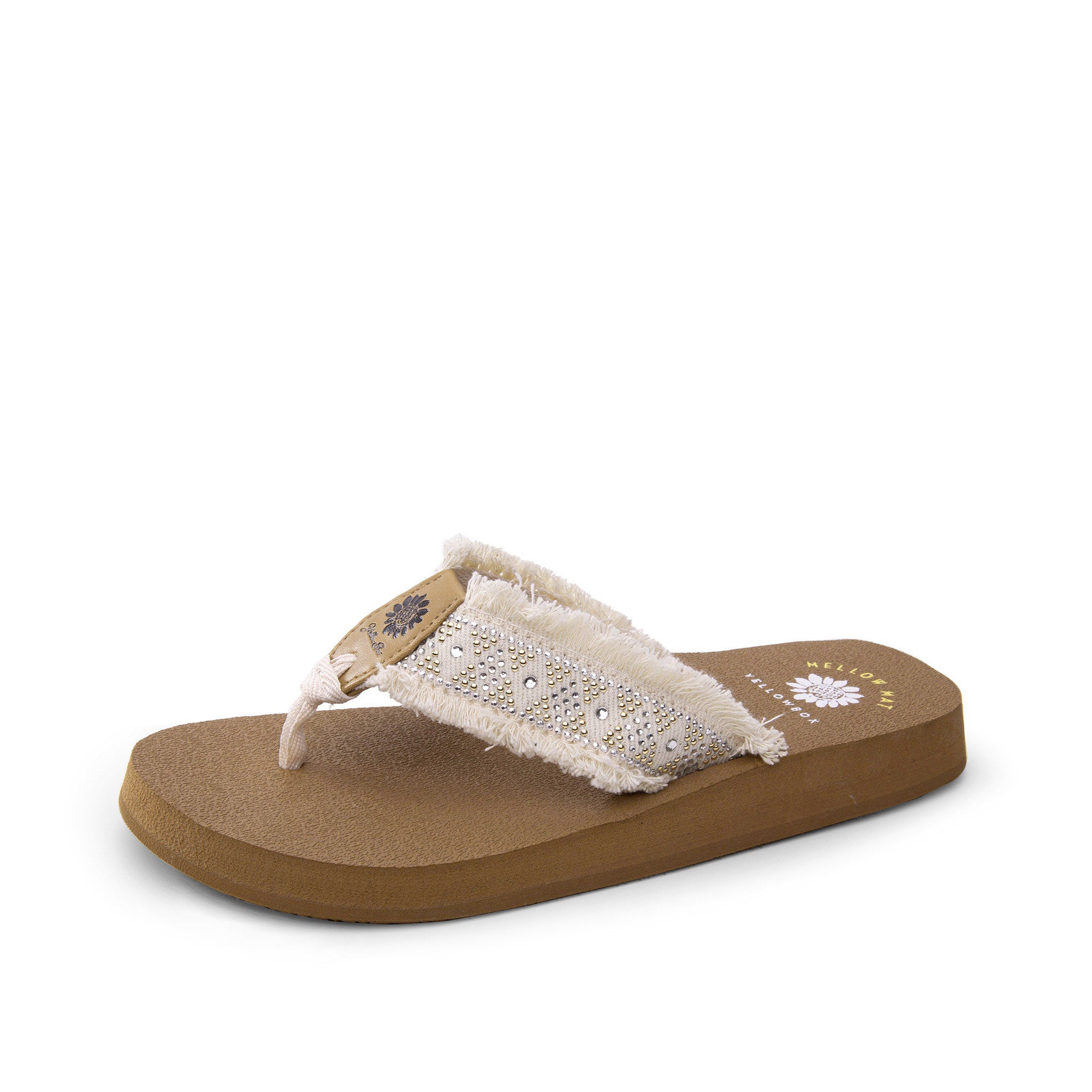 NIGELLA features sparkling rhinestone straps with frayed edges and a soft ribbon thong post. This sandal from our Mellow Mat™ collection has a slow rebound footbed and a classic low heel.