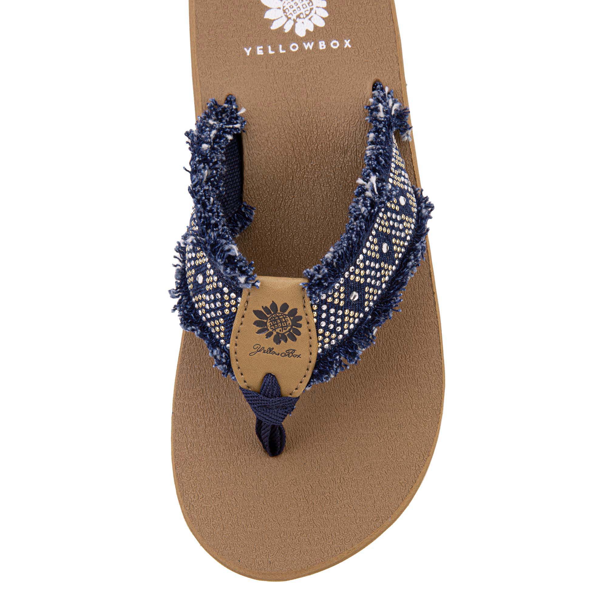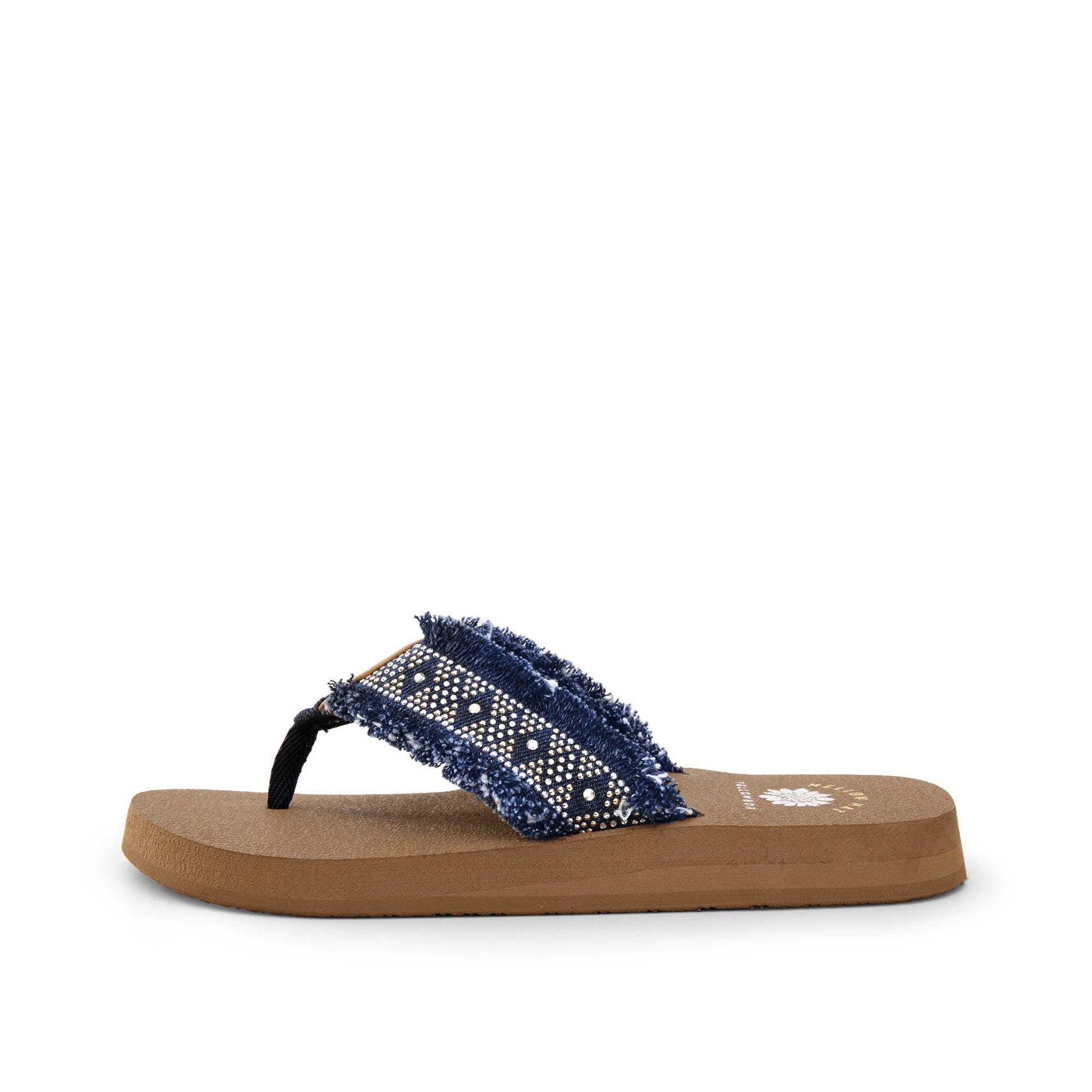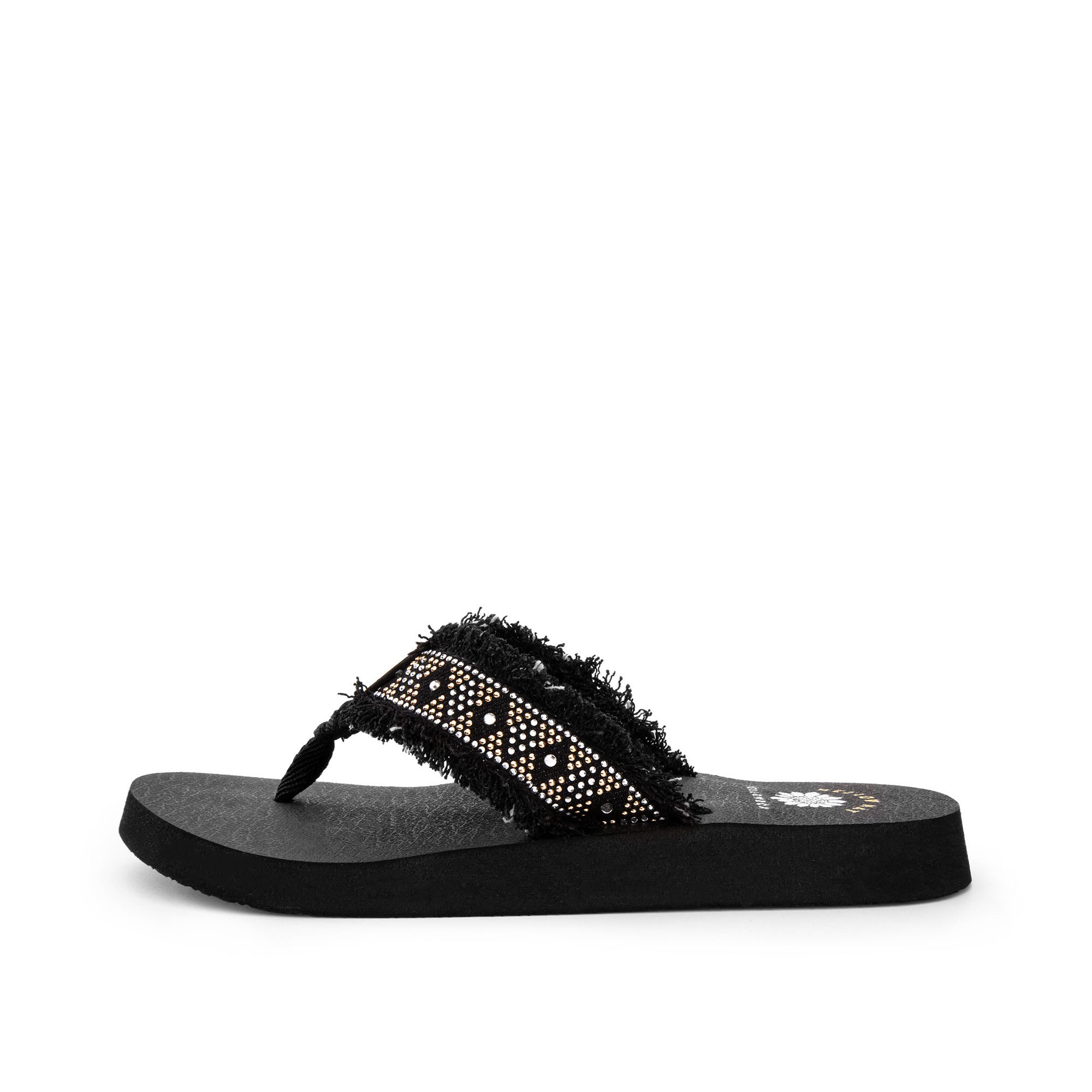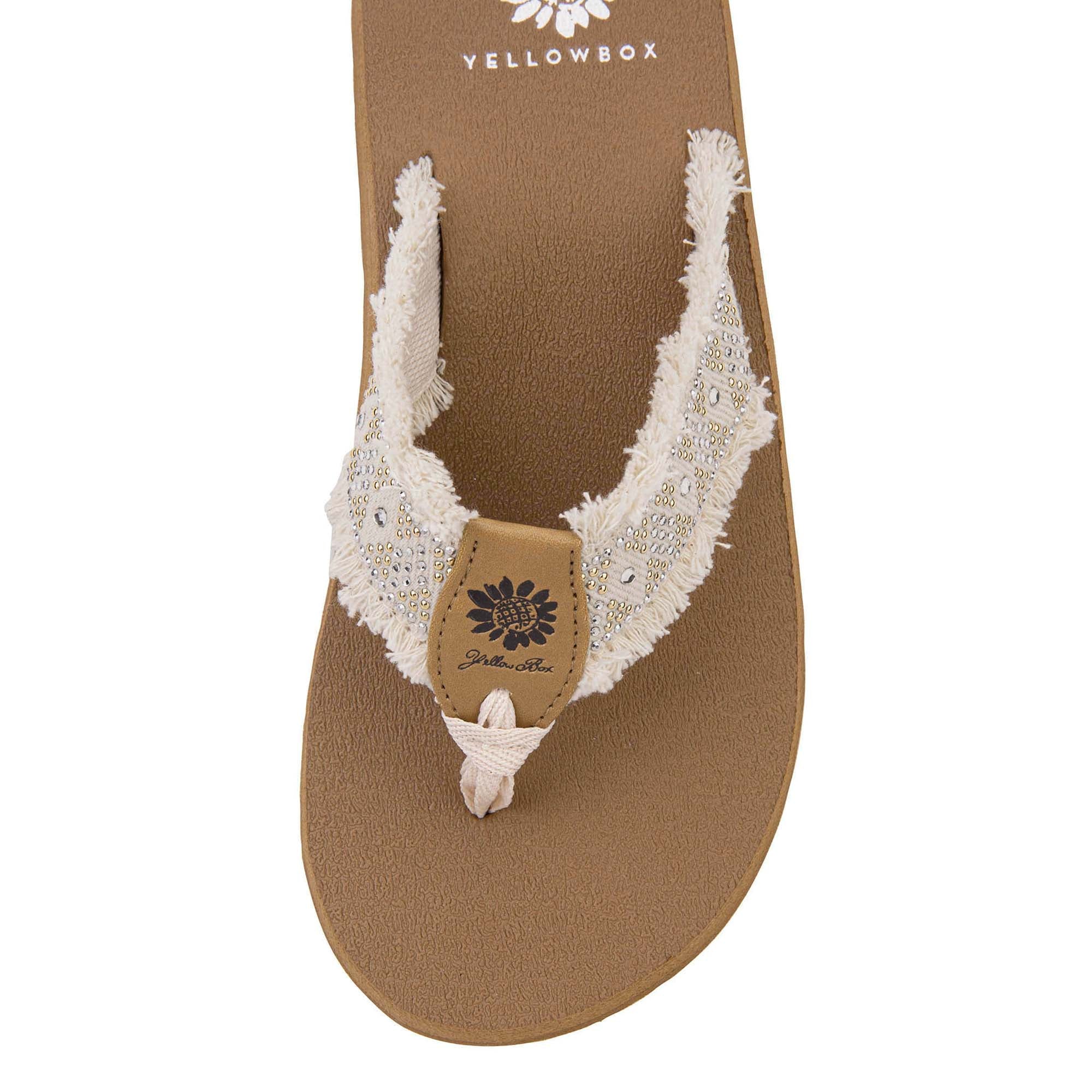 NIGELLA features sparkling rhinestone straps with frayed edges and a soft ribbon thong post. This sandal from our Mellow Mat™ collection has a slow rebound footbed and a classic low heel.