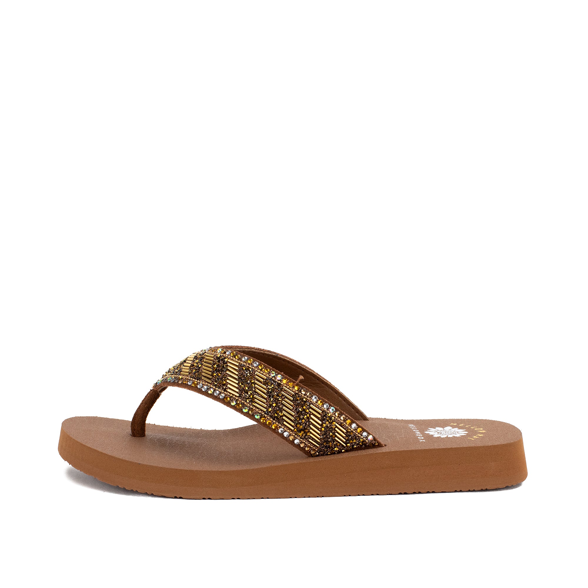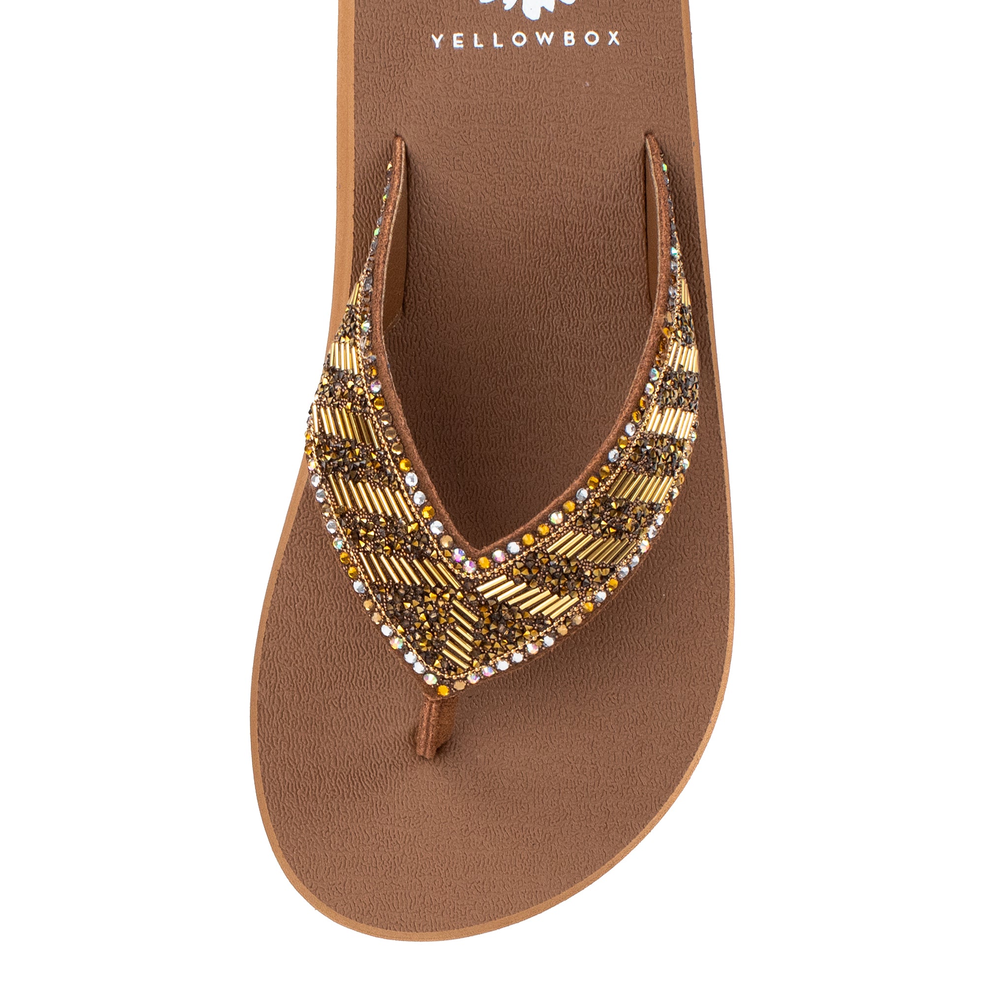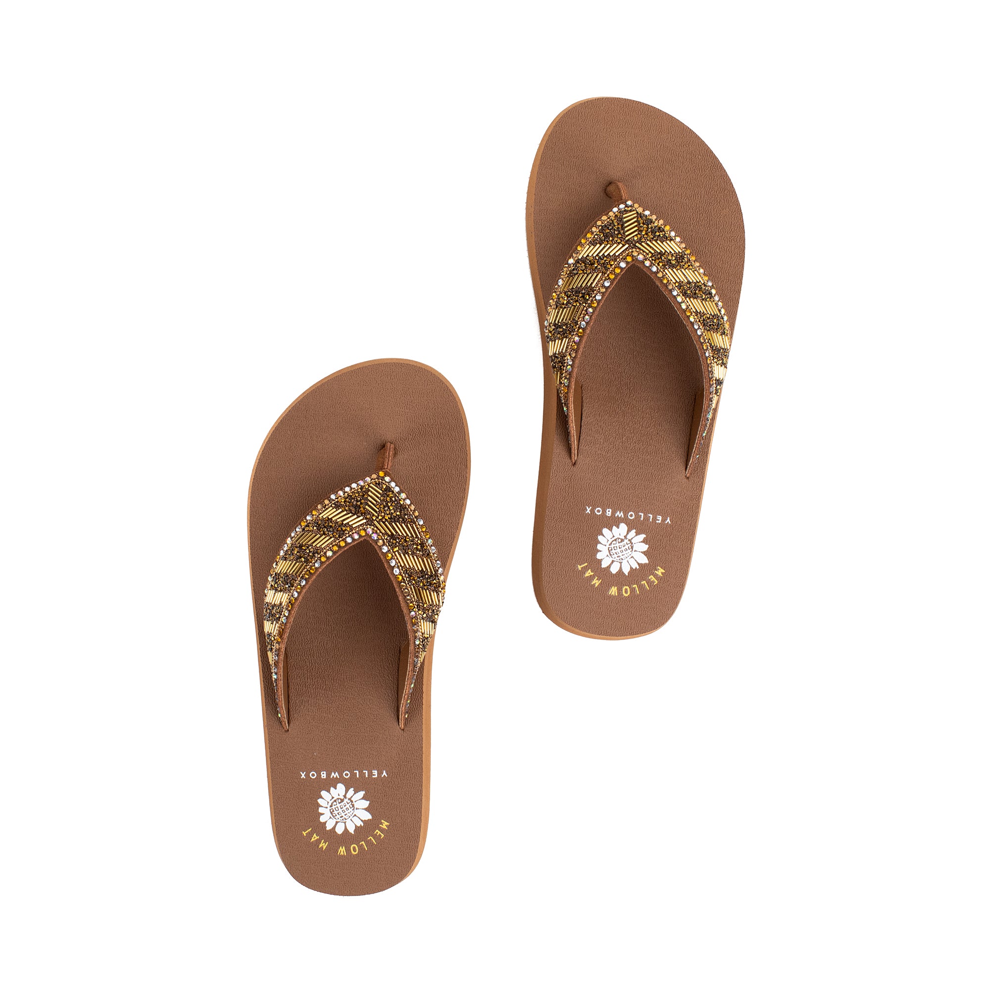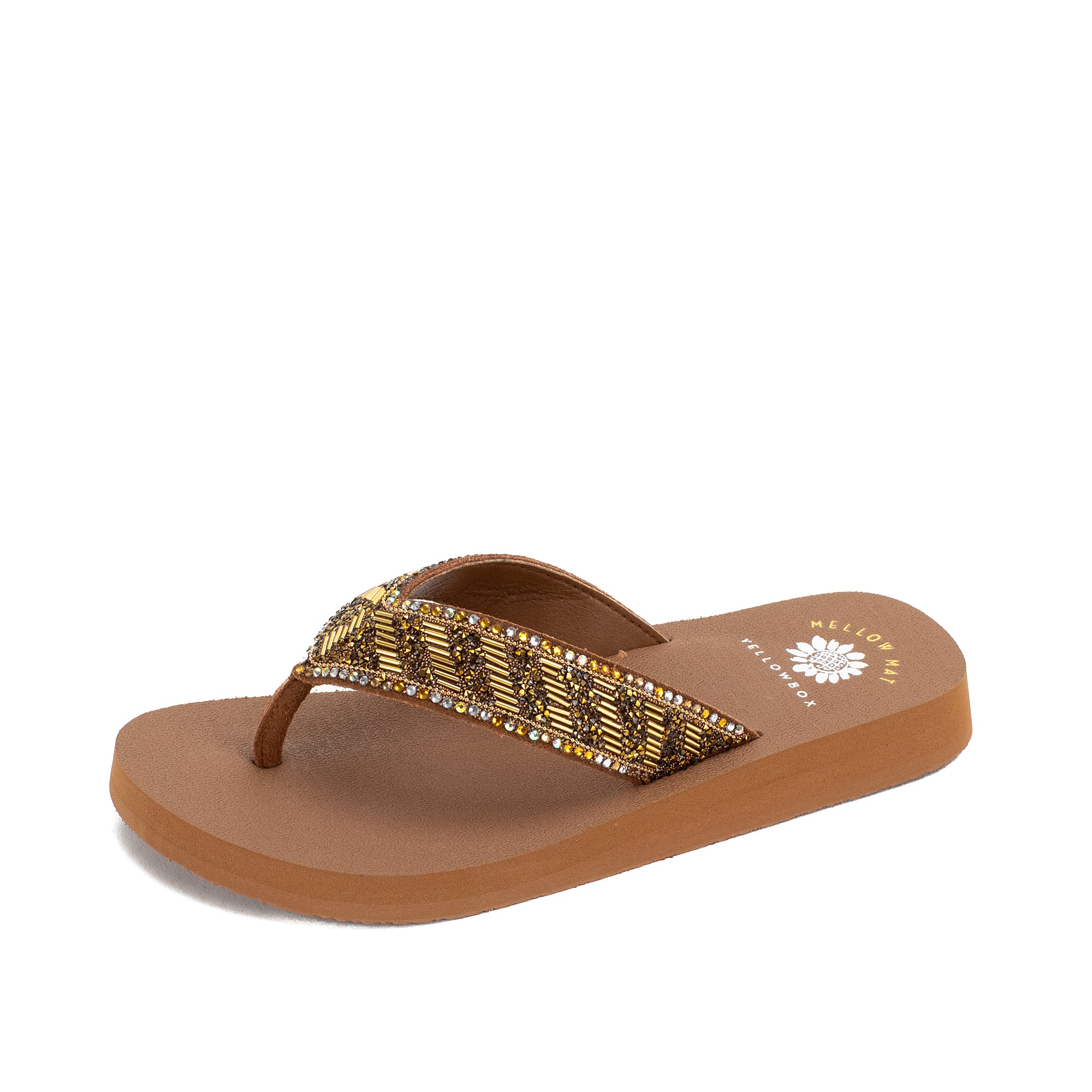 Our NORMAN flip-flops shine with a bold striped design of metallic bugle beads and glittering rhinestone straps. This sandal bottom from our Mellow Mat™ collection features a slow rebound footbed in a classic low heel.