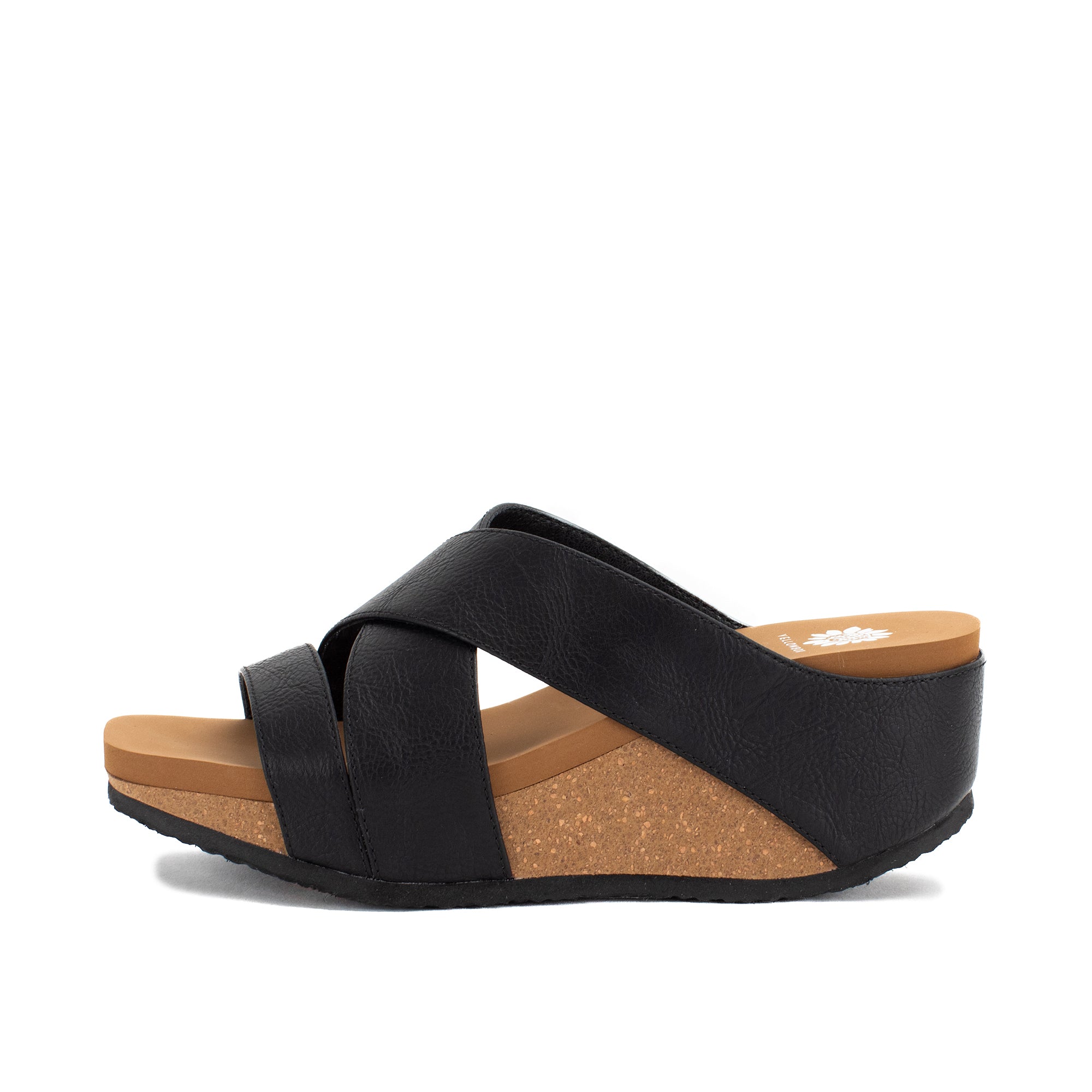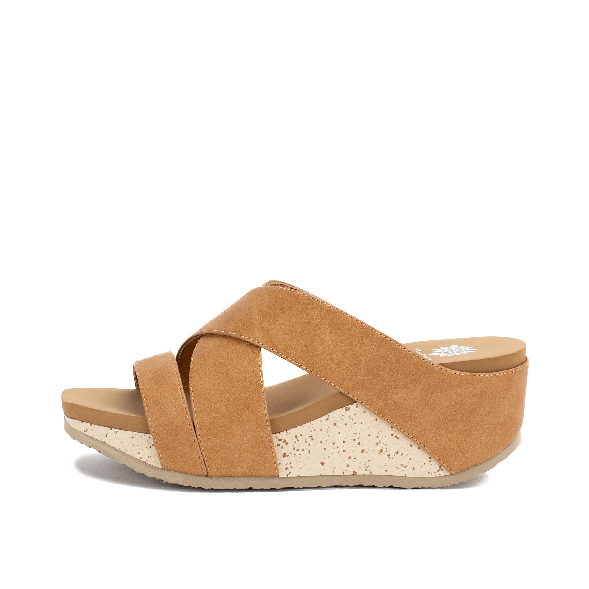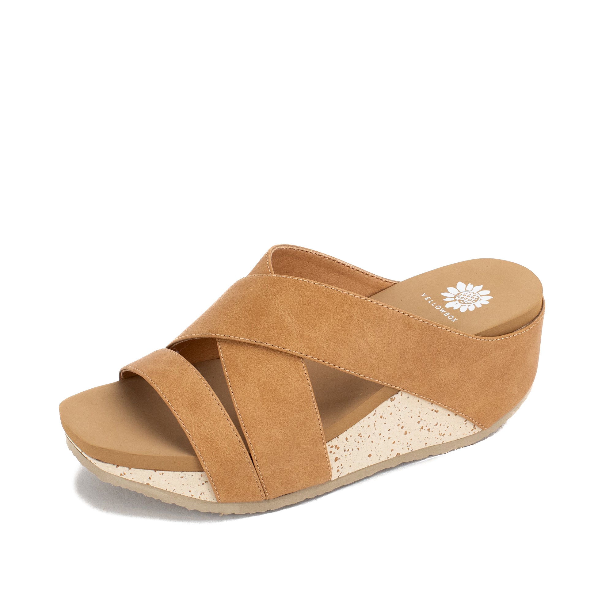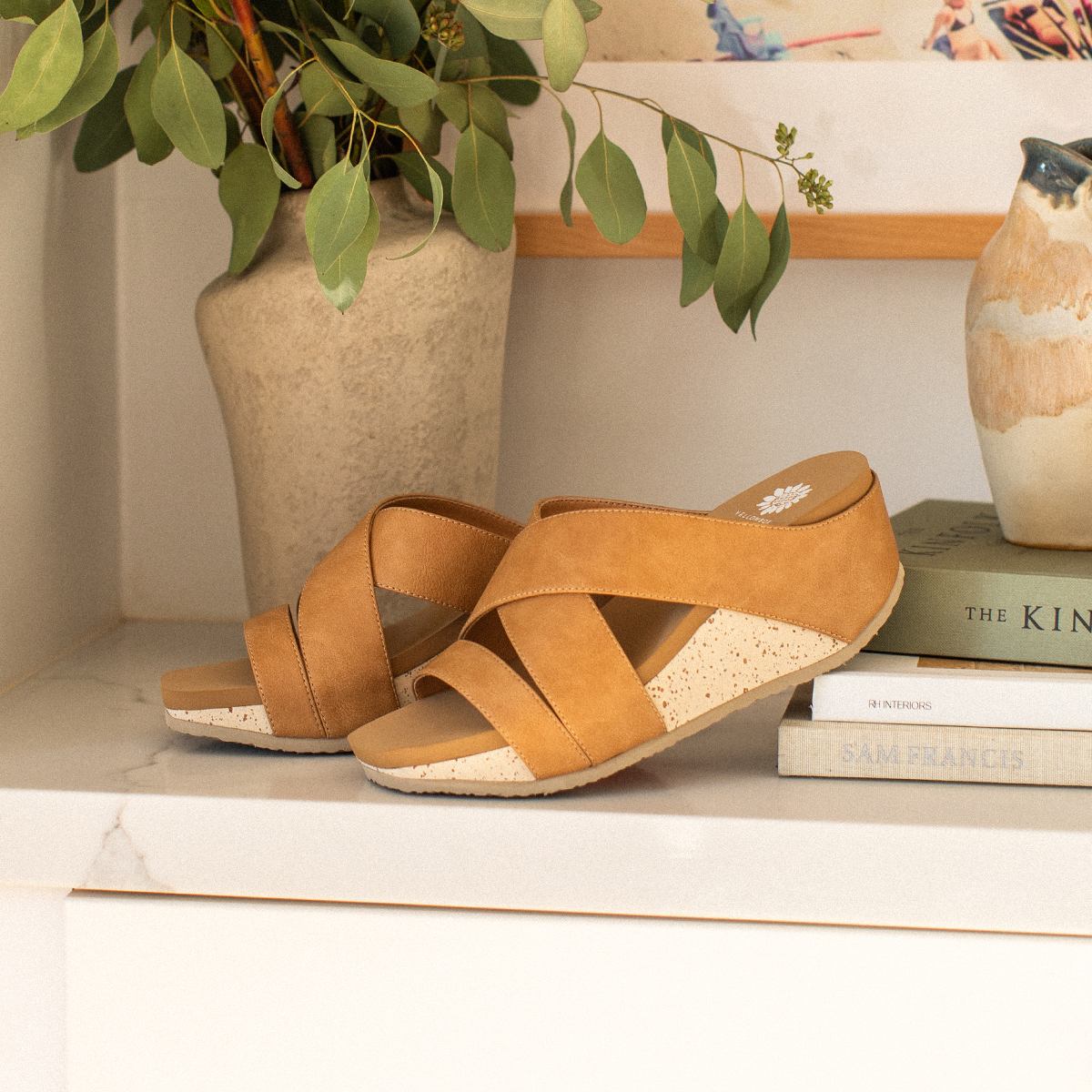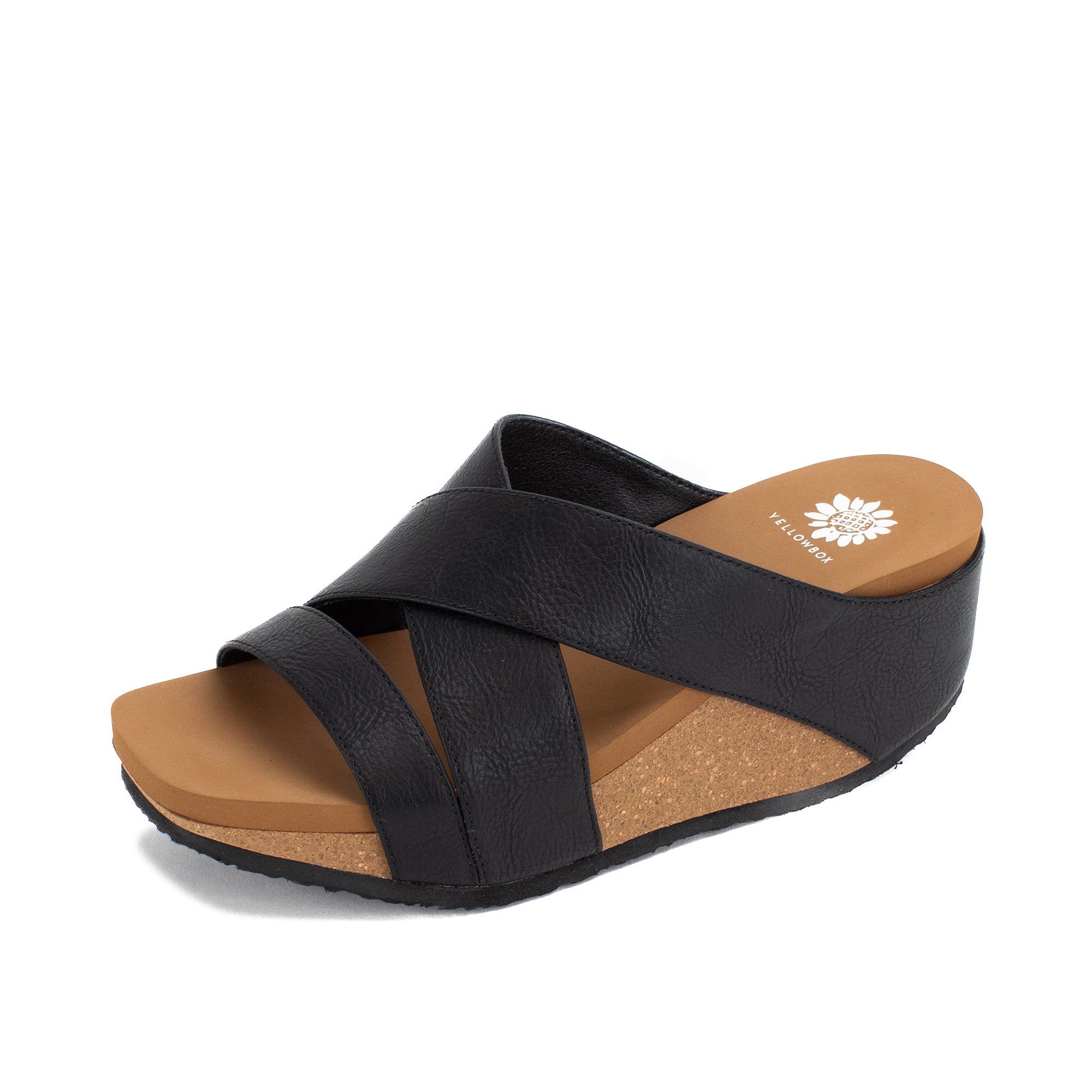 Our CHELA slide sandal features a modern wedge and chic upper that can be dressed up or down. The lightweight cork wedge, crafted with our Signature Yellow Box EVA, offers the feel of a flip-flop, making it ideal for all-day wear.