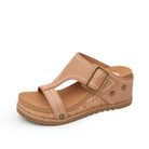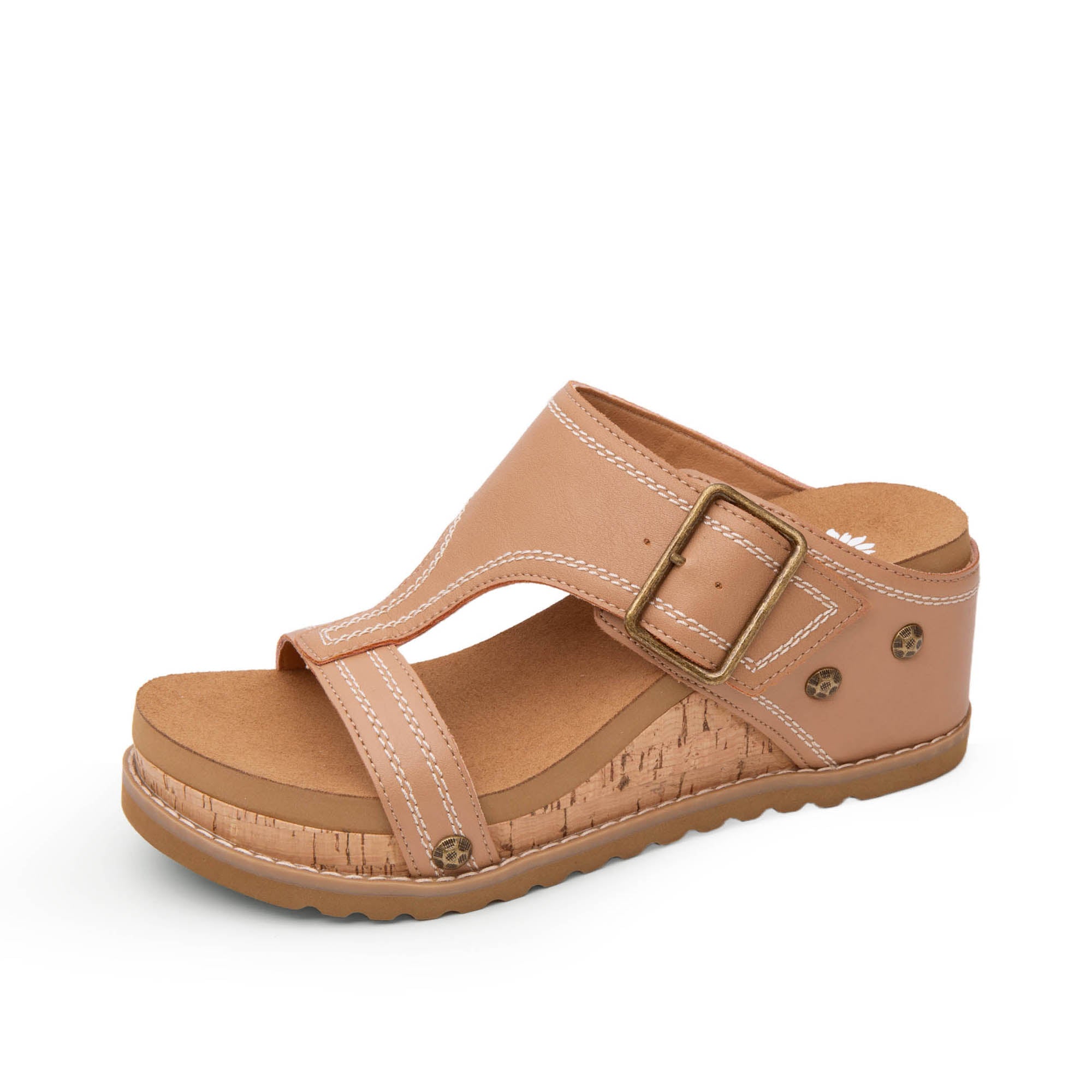 The ANDREAS slide sandal is set on a cork wedge razor lug outsole with a stitched welt and finished with statement hardware on the top.