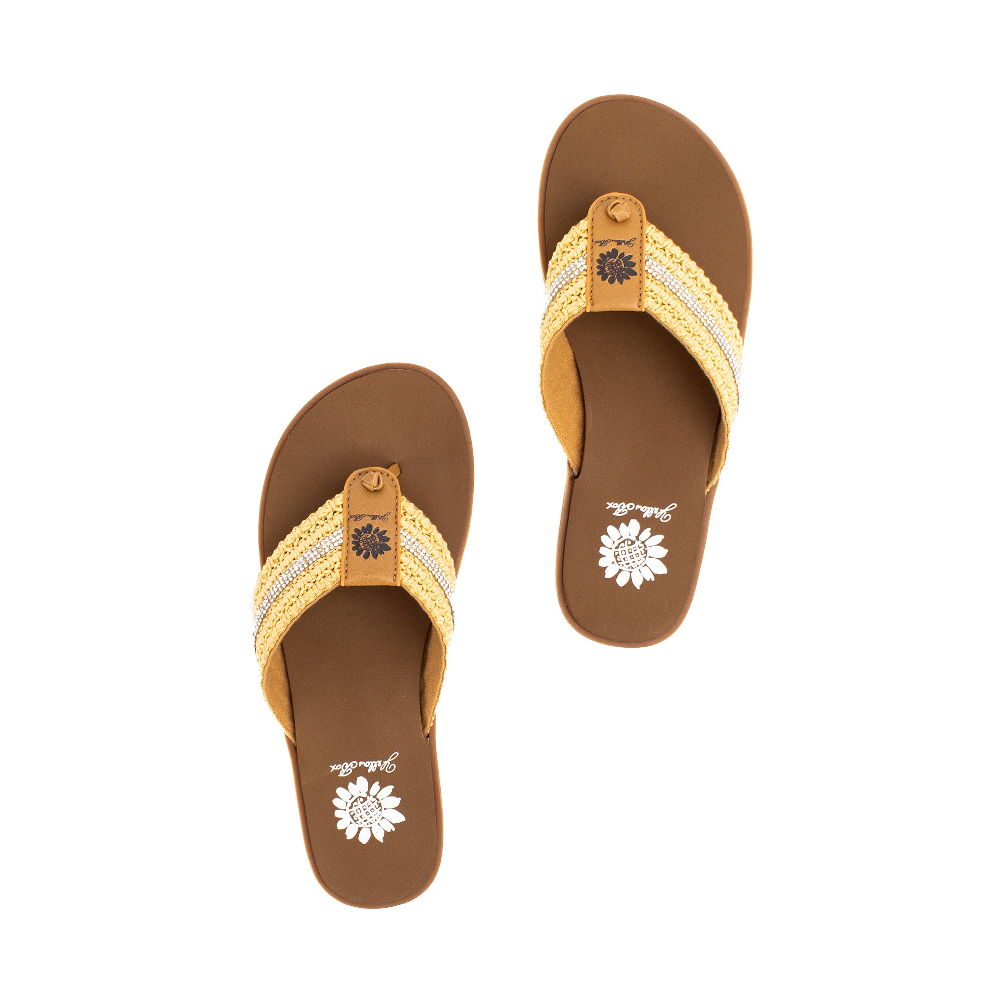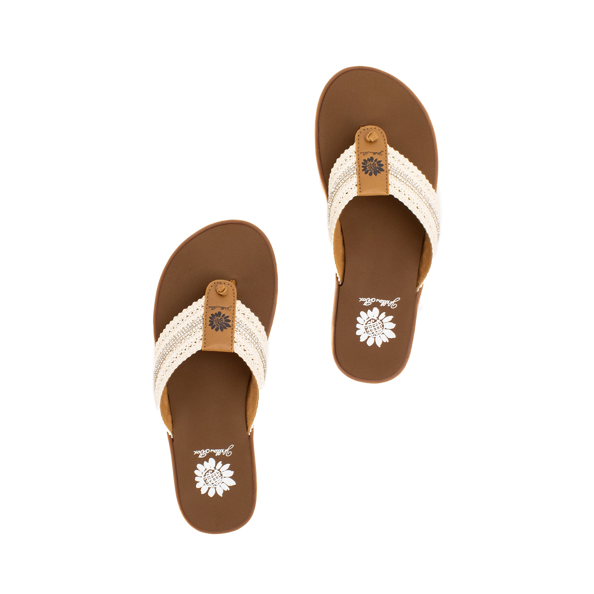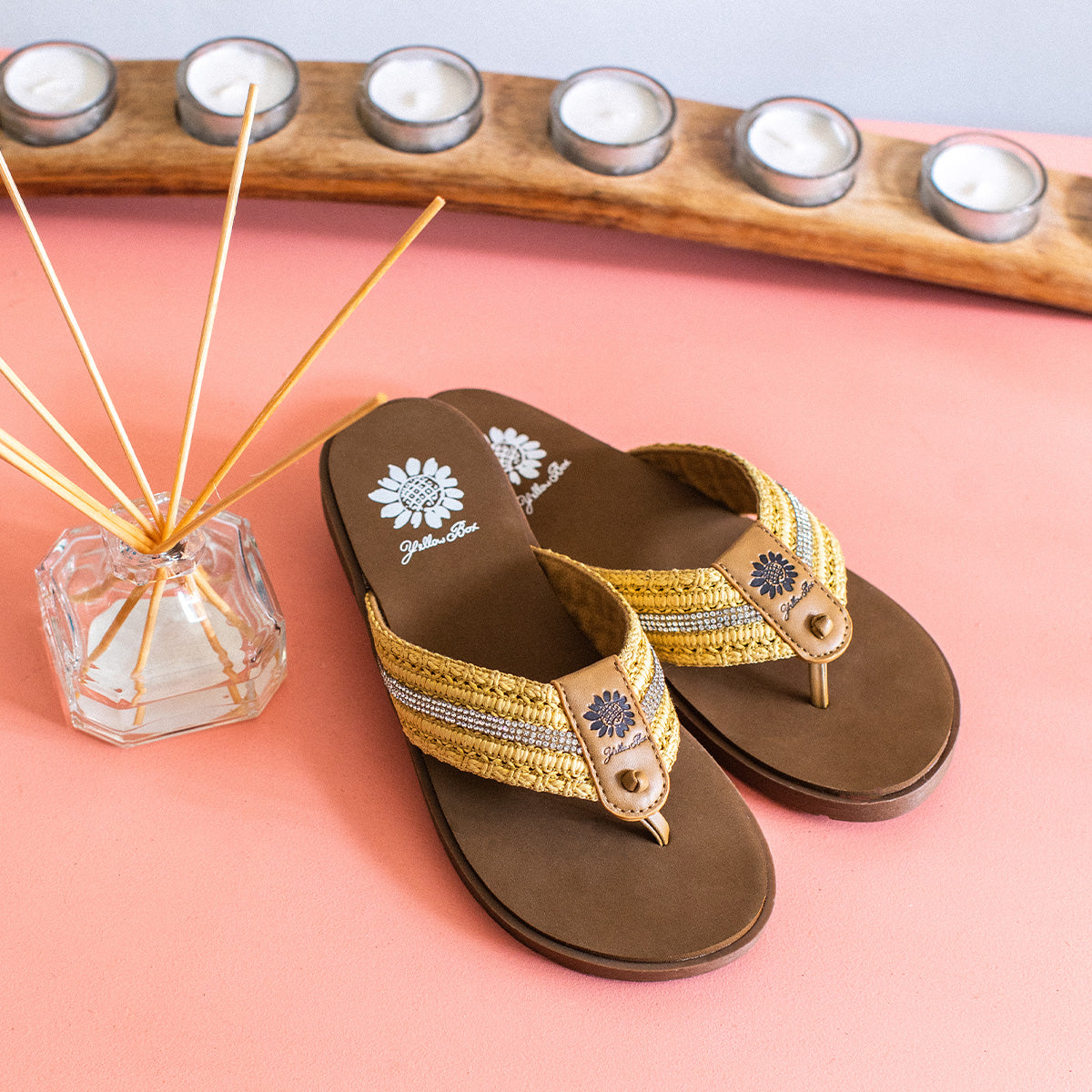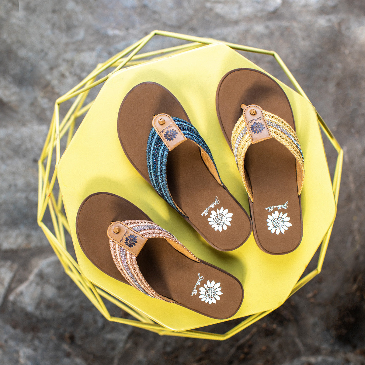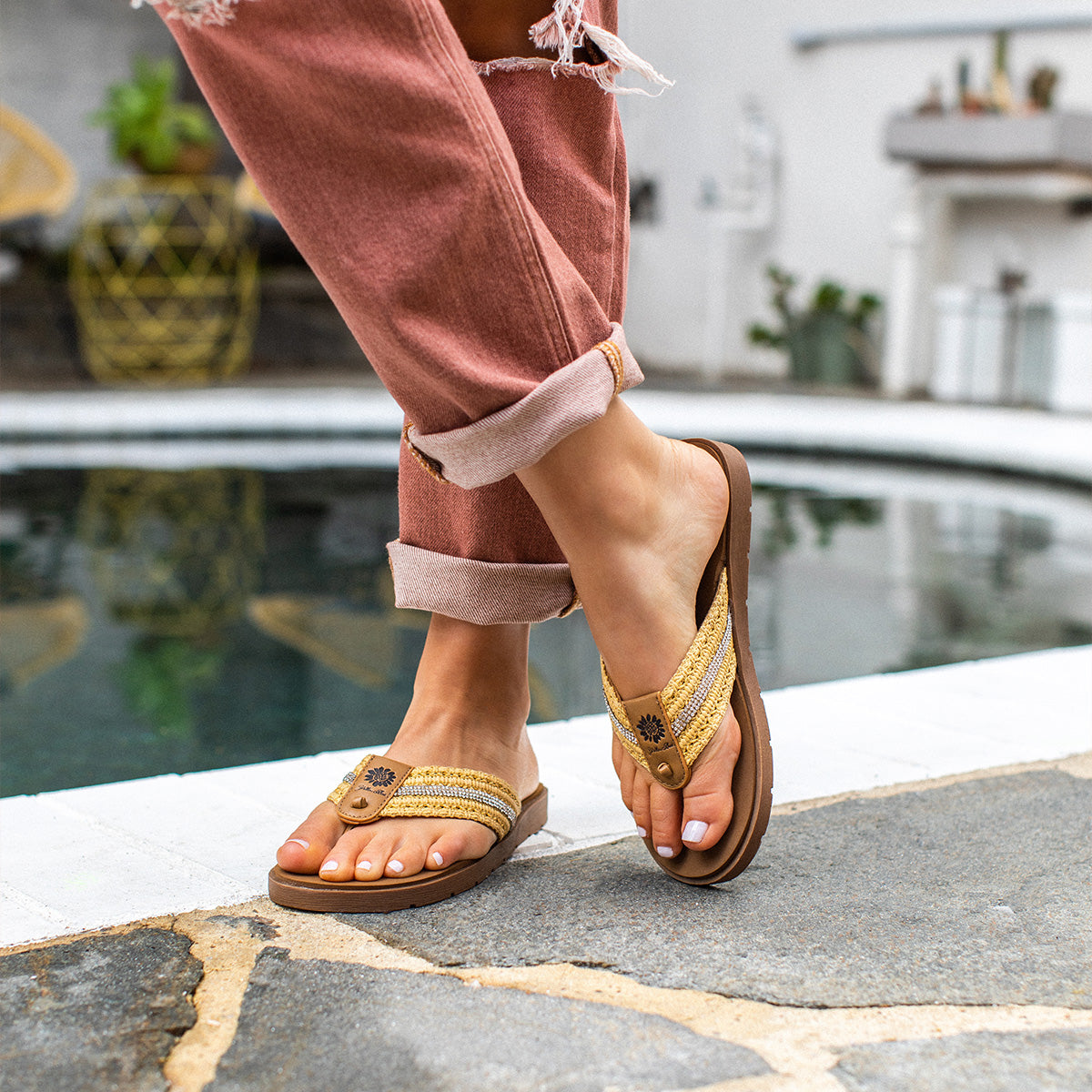 A crocheted strap with rows of zhuzh. The FANIA sandals are a clear fan favorite.