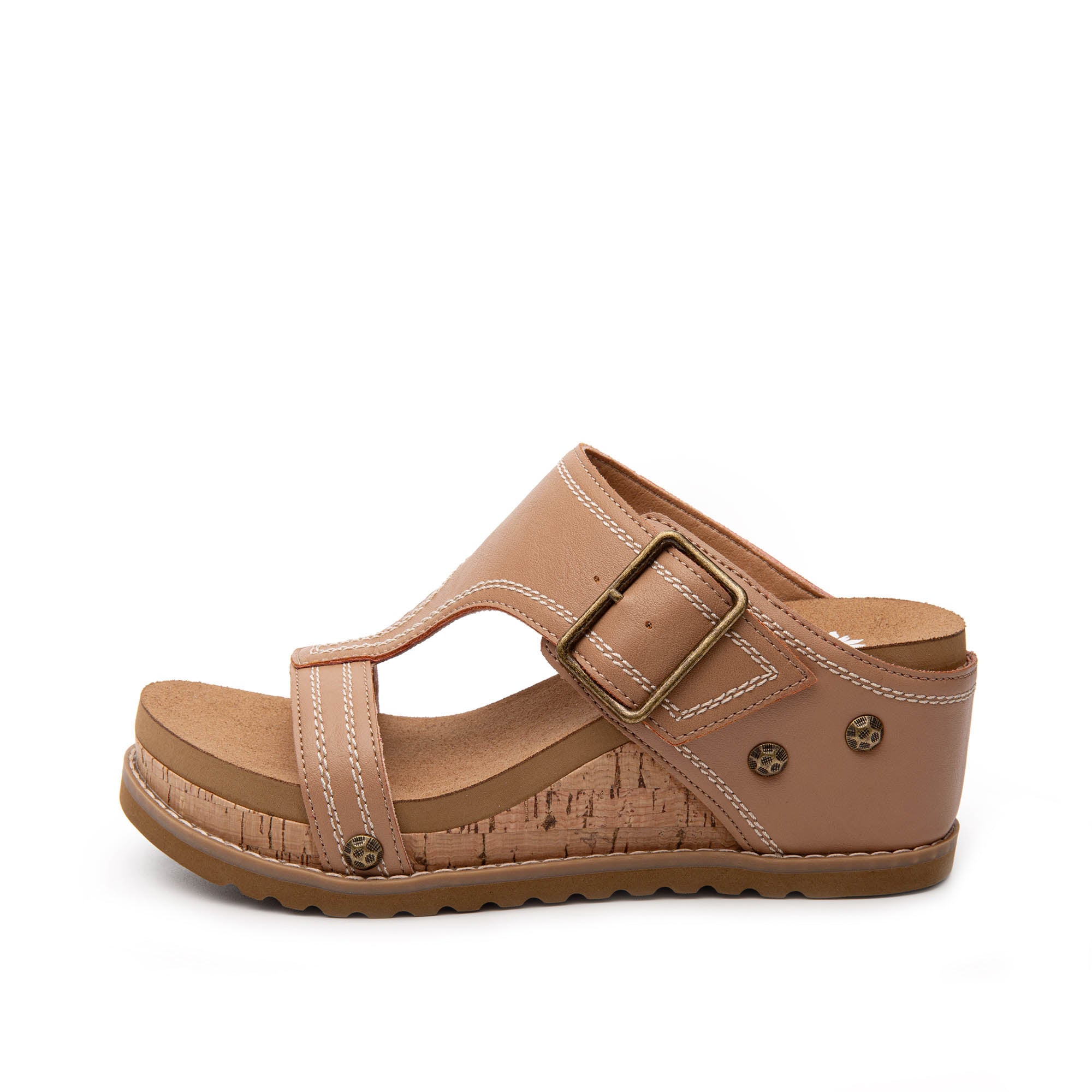 The ANDREAS slide sandal is set on a cork wedge razor lug outsole with a stitched welt and finished with statement hardware on the top.