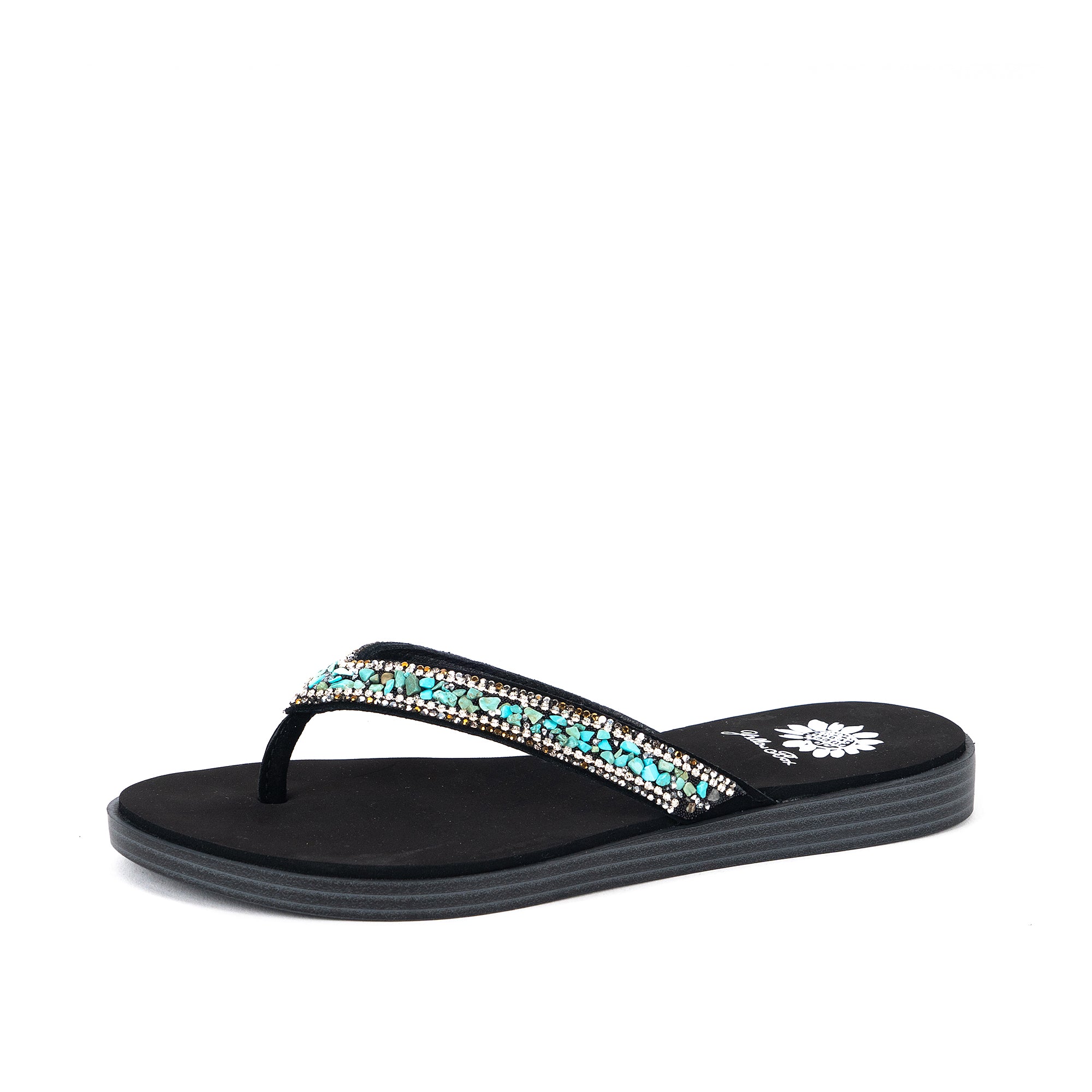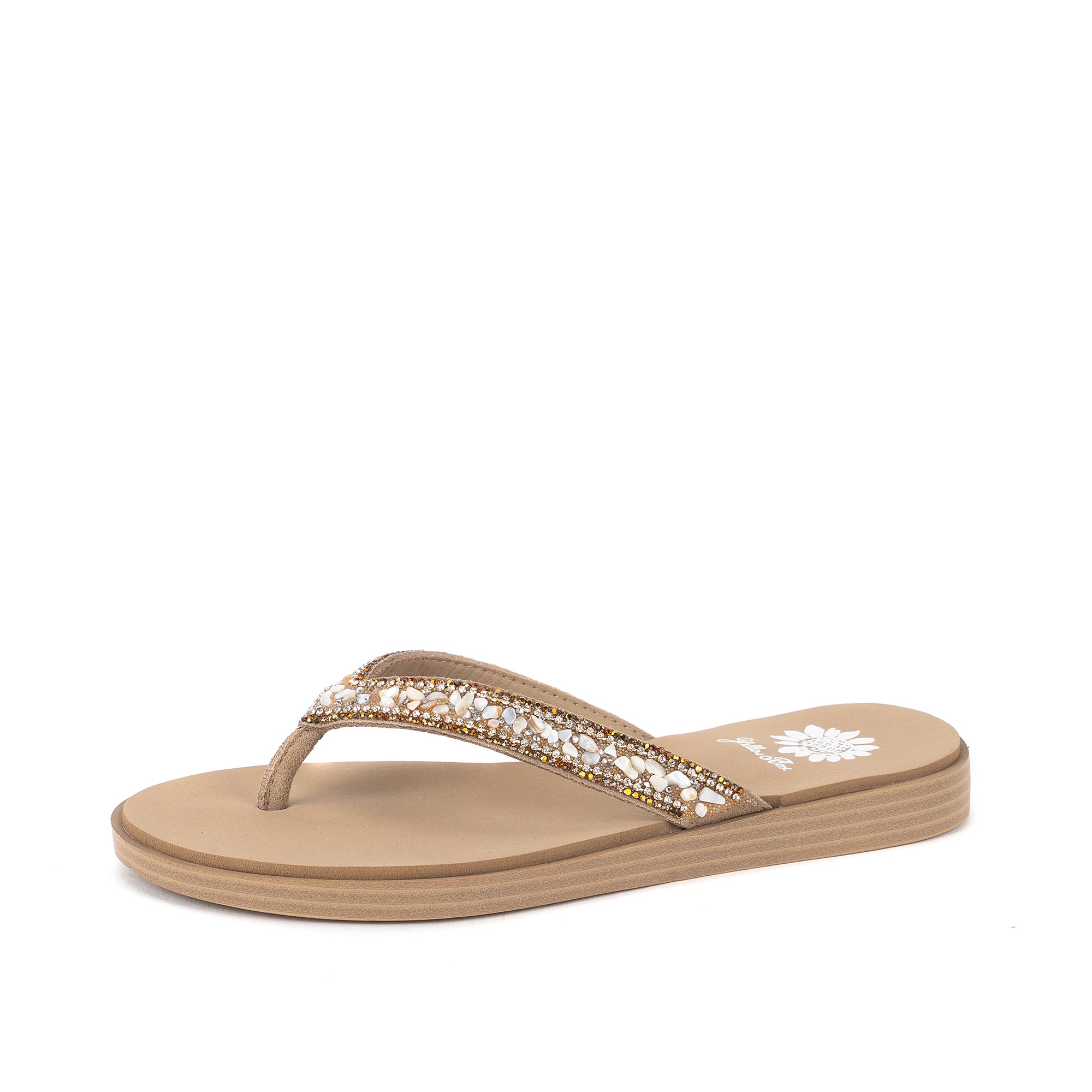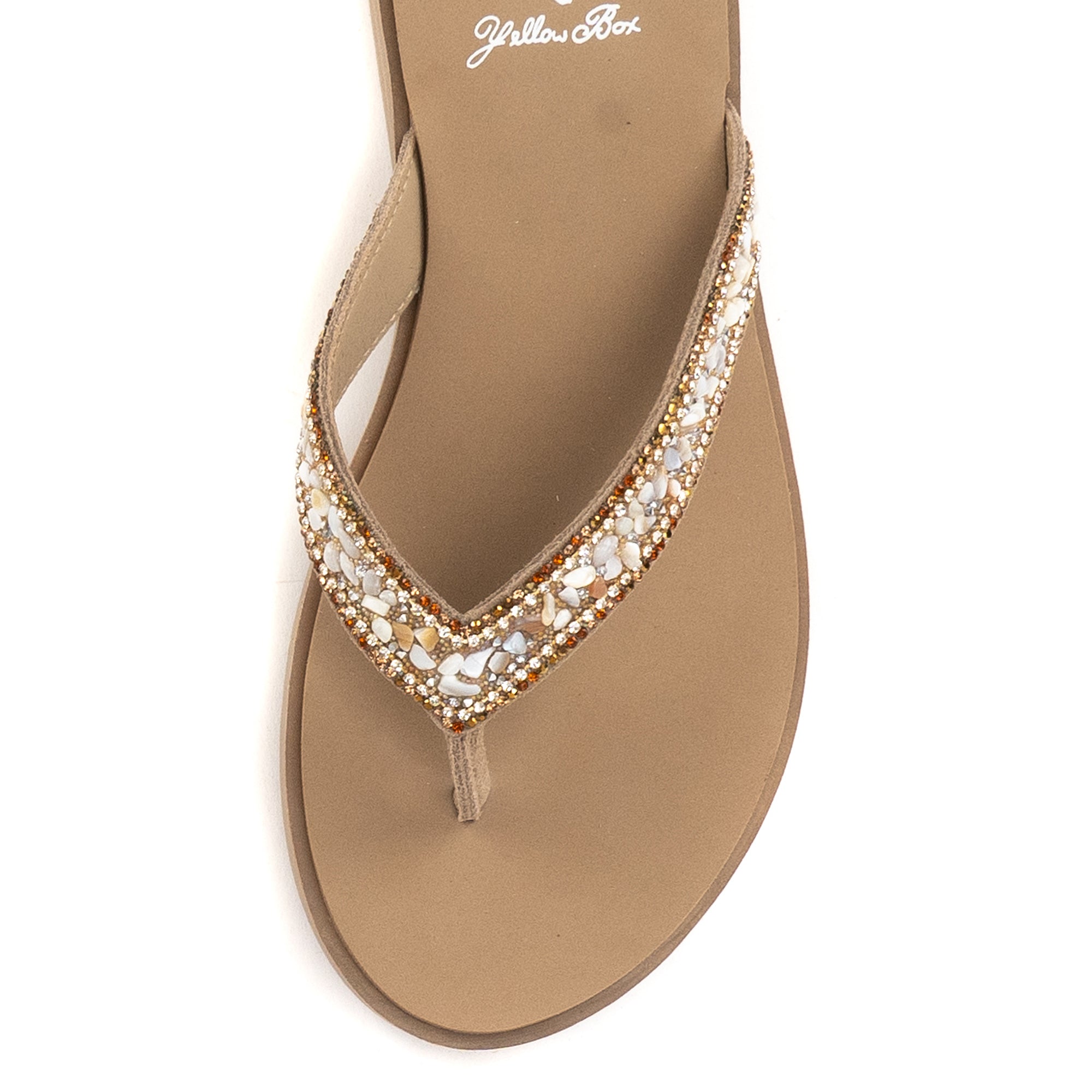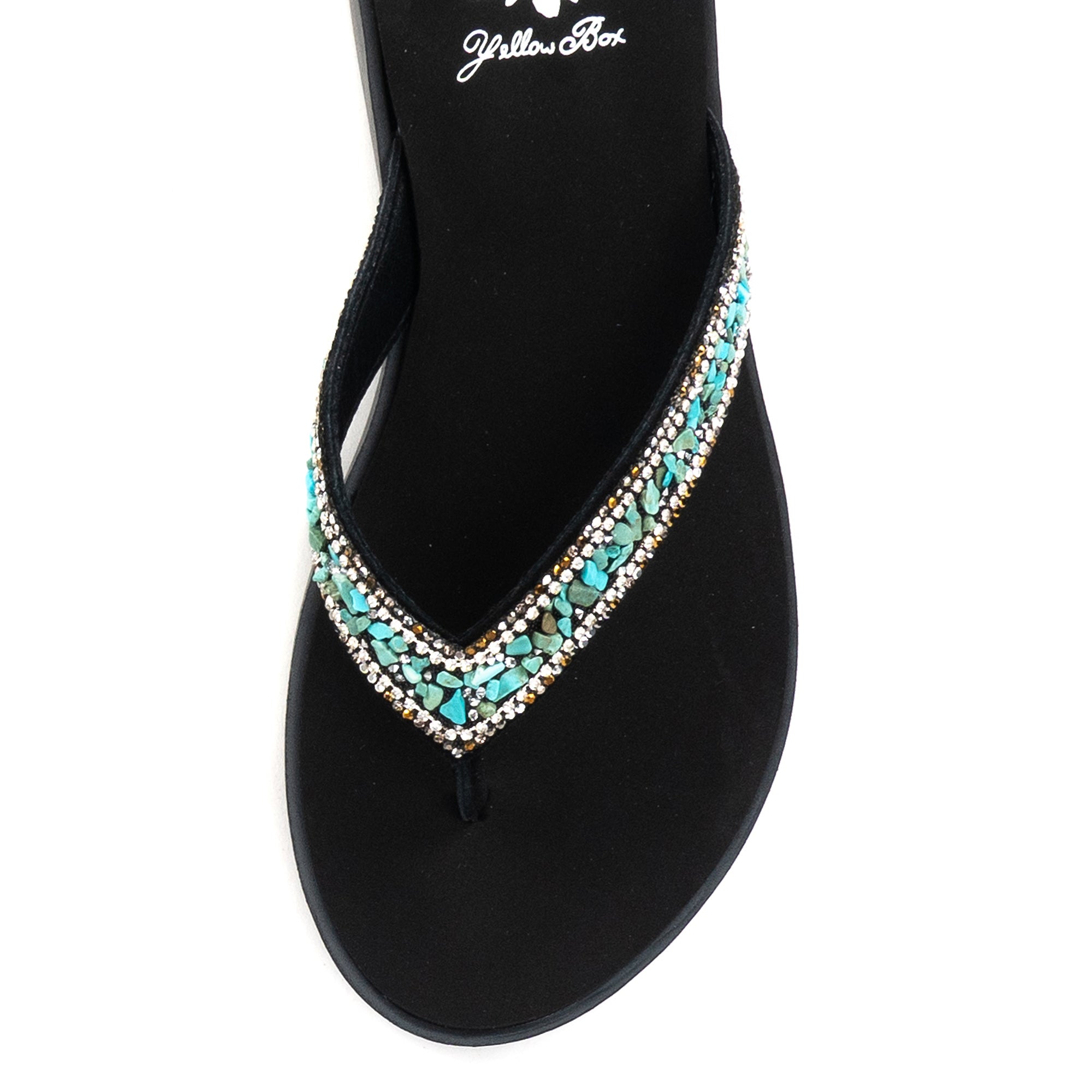 The calm and cool DIYAH sandal features straps adorned with beautiful tumbled gemstones and sparkling rhinestones. The Signature Yellow Box EVA insole makes DIYAH a perfect everyday sandal.