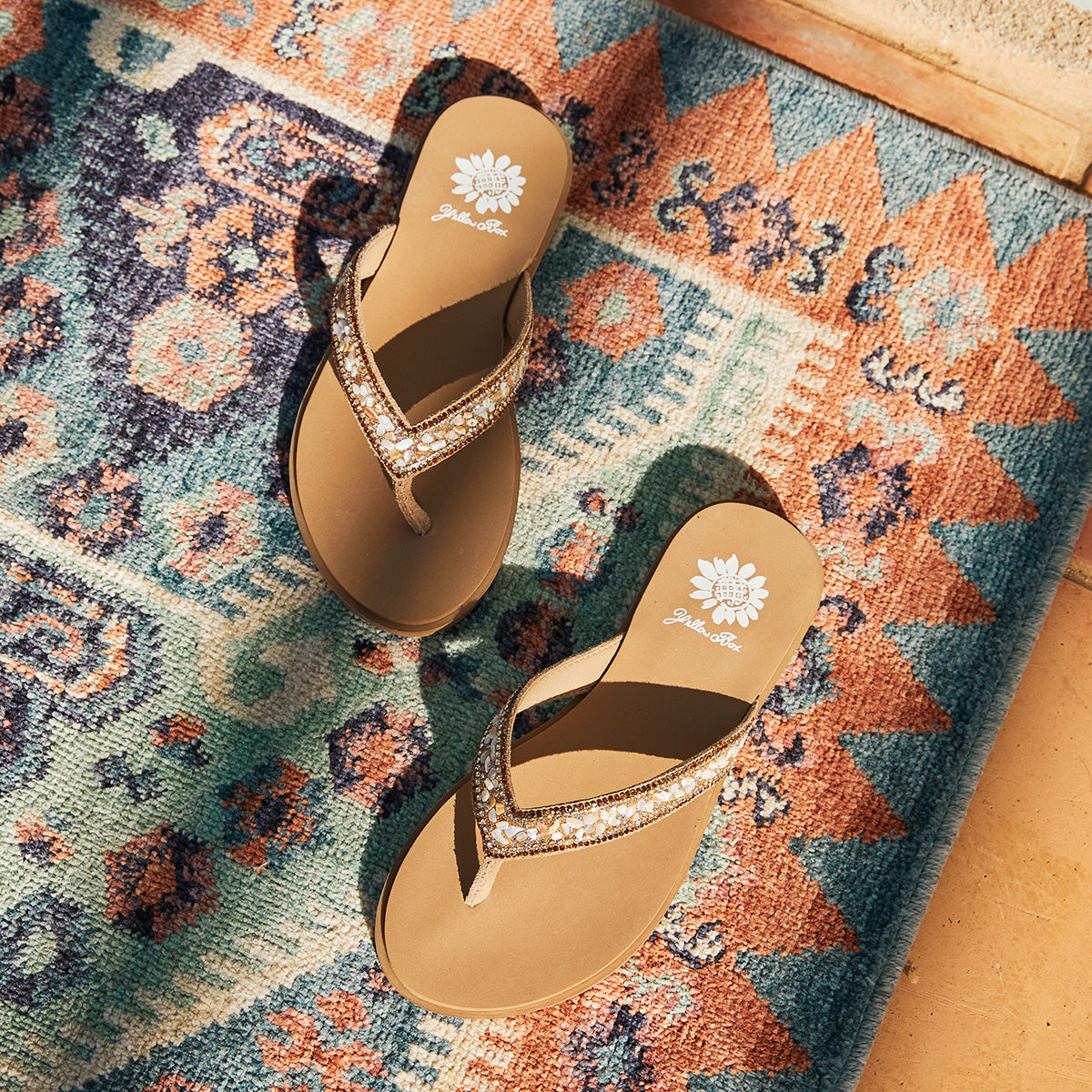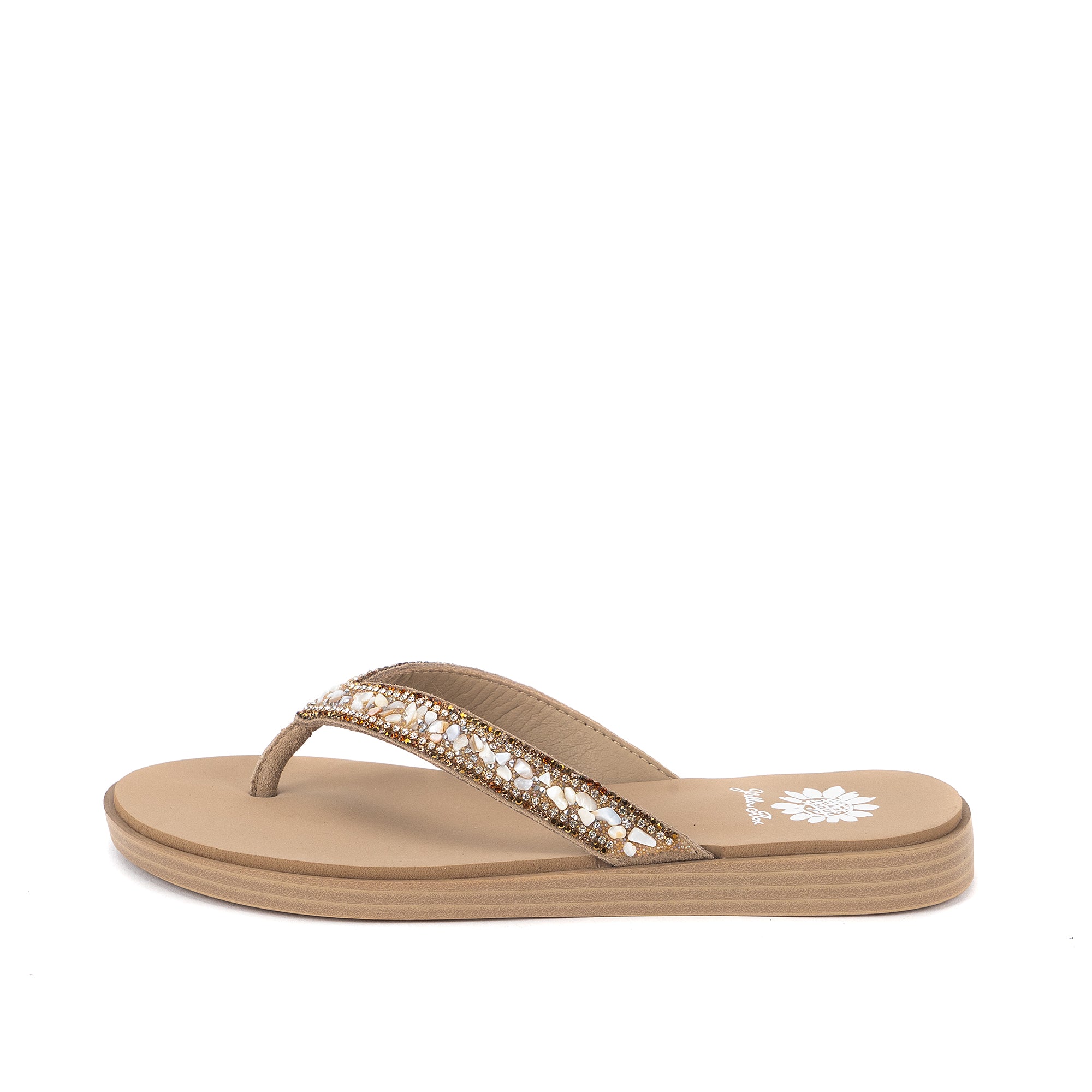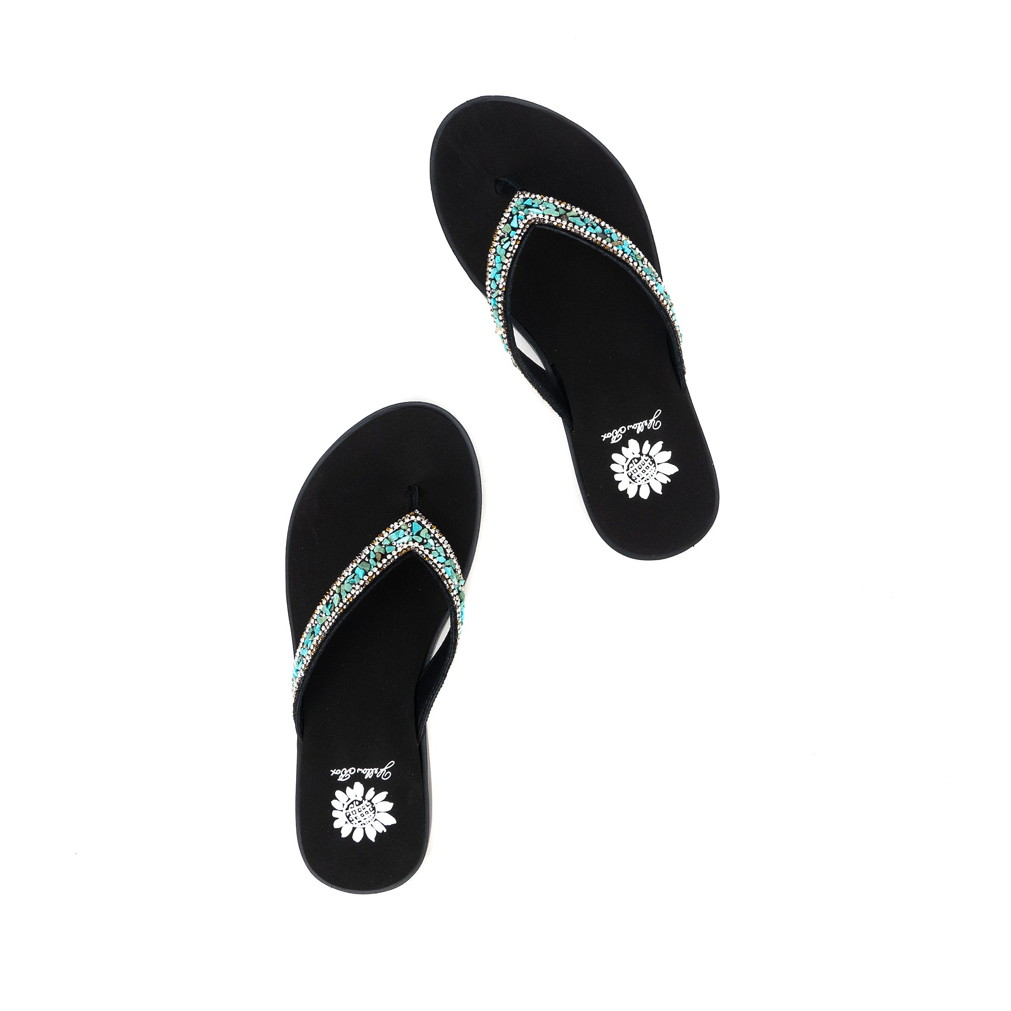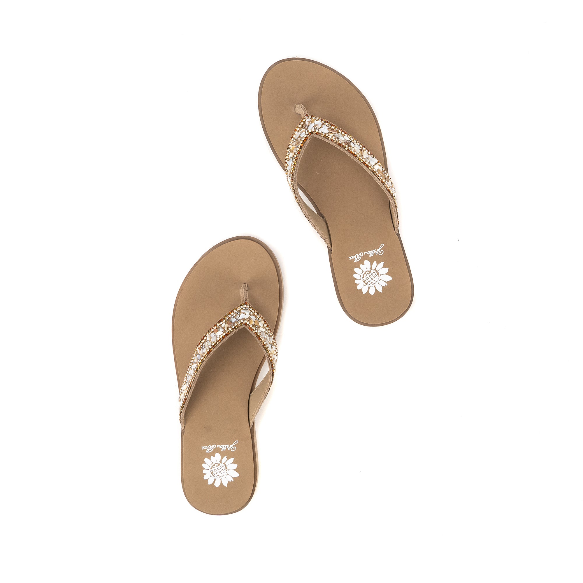 The calm and cool DIYAH sandal features straps adorned with beautiful tumbled gemstones and sparkling rhinestones. The Signature Yellow Box EVA insole makes DIYAH a perfect everyday sandal.