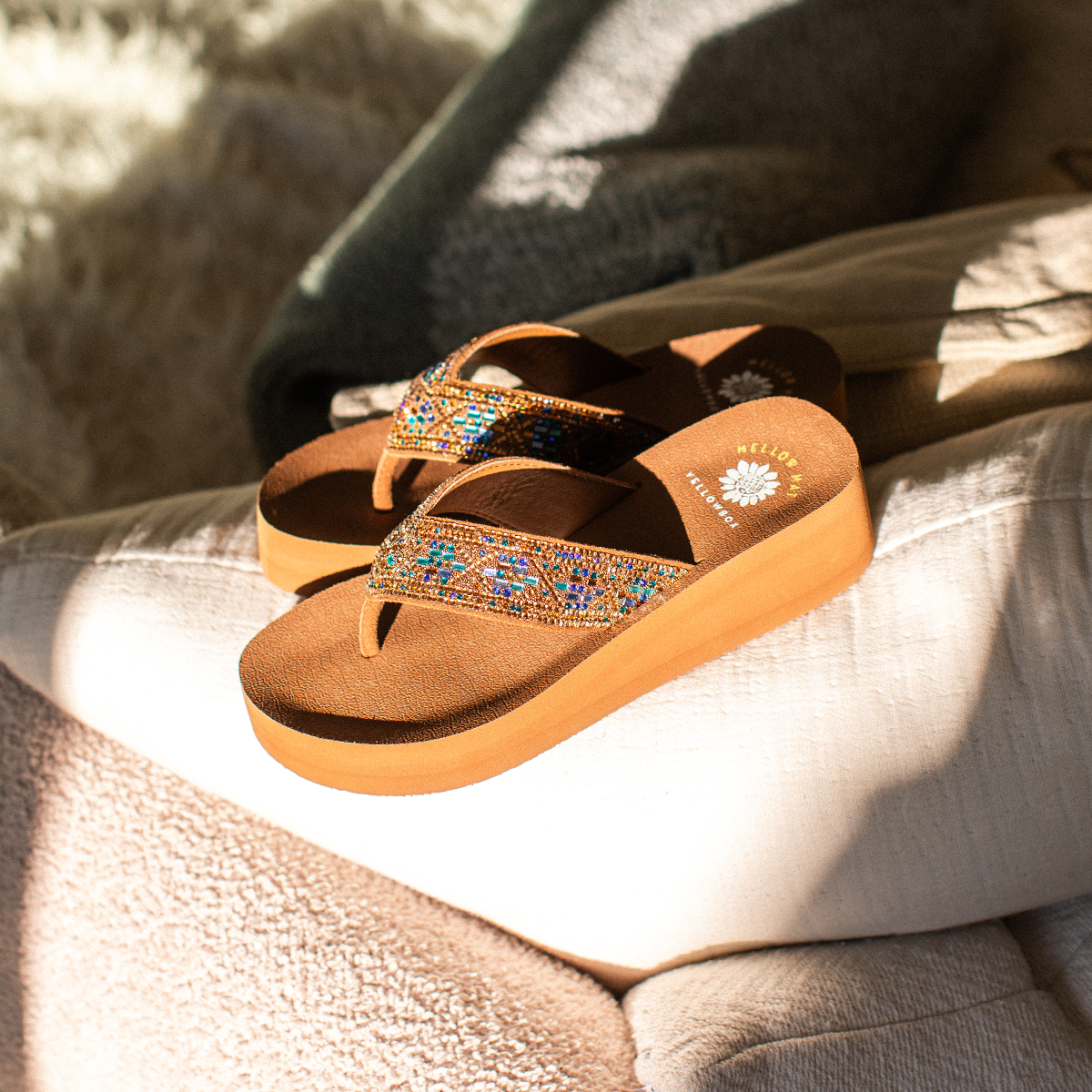 Our PENNY flatform sandals shine with Aztec-inspired rhinestone designs. This sandal bottom from our Mellow Mat™ collection features a slow rebound footbed in a medium-height heel.