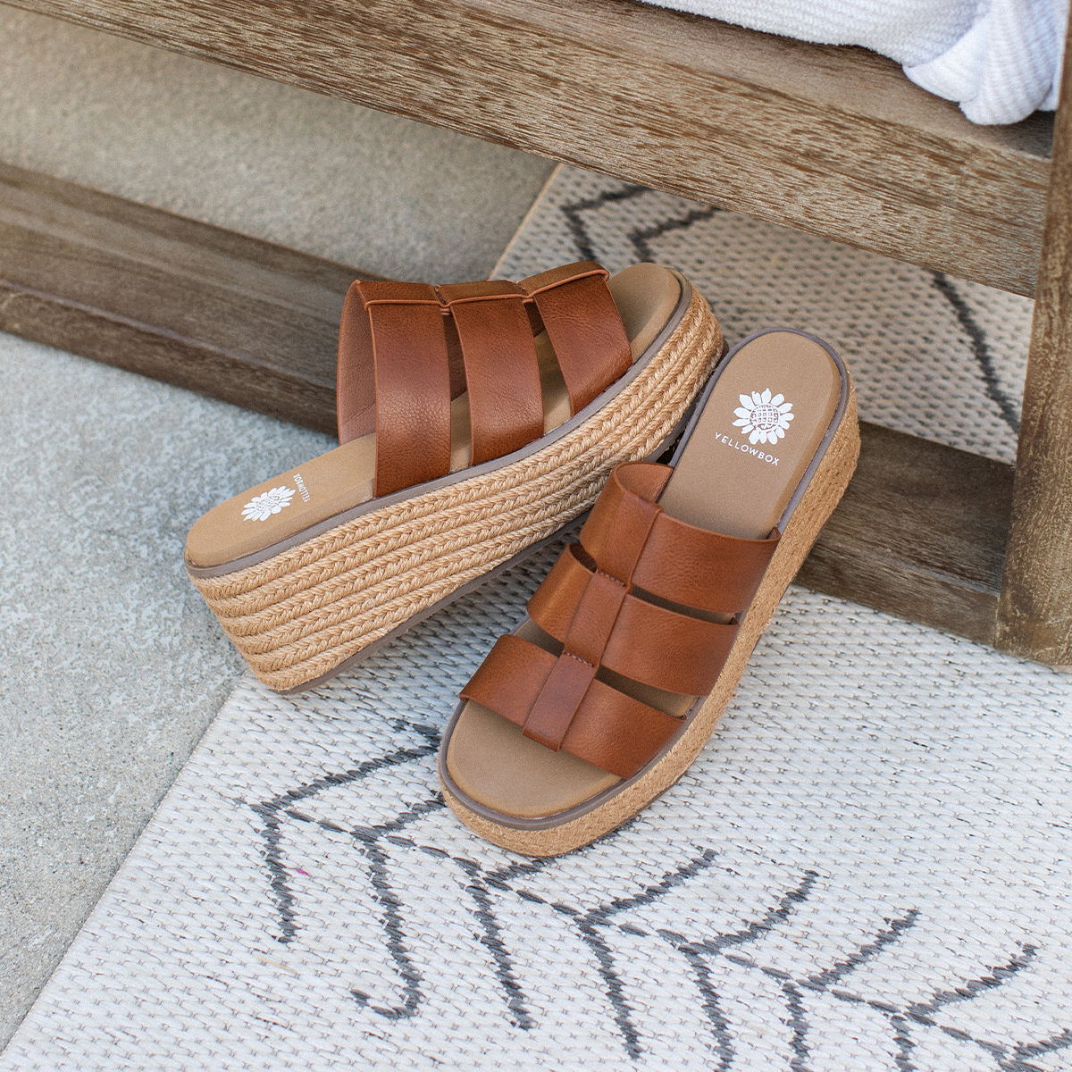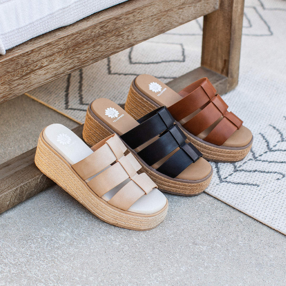 JOY is a 3-band 90s-inspired square-toe platform wedge. JOY features a fisherman upper with an espadrille-wrapped medium-height platform. This sandal bottom features a Signature Yellow Box EVA foam footbed and a sturdy rubber sole for lasting durability.